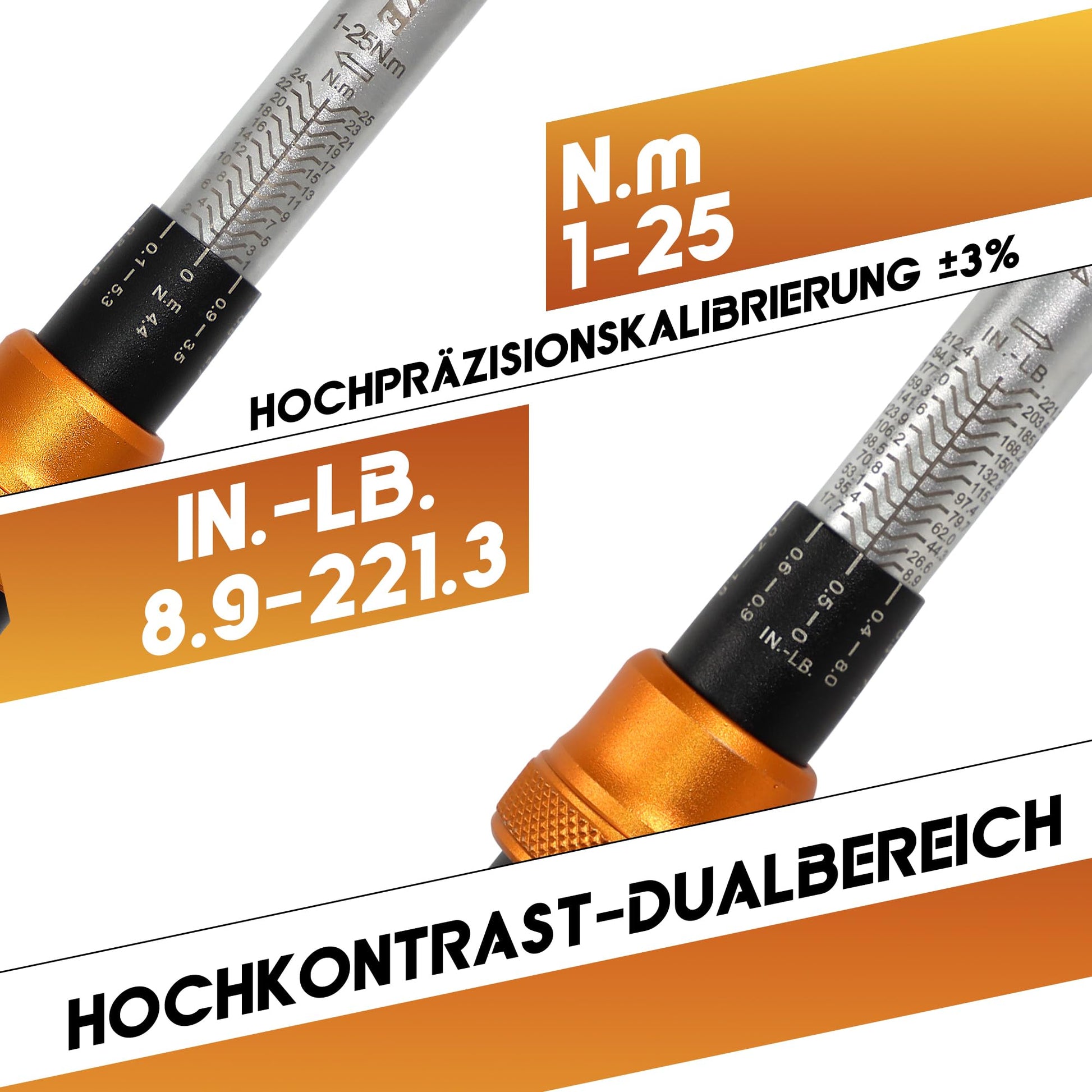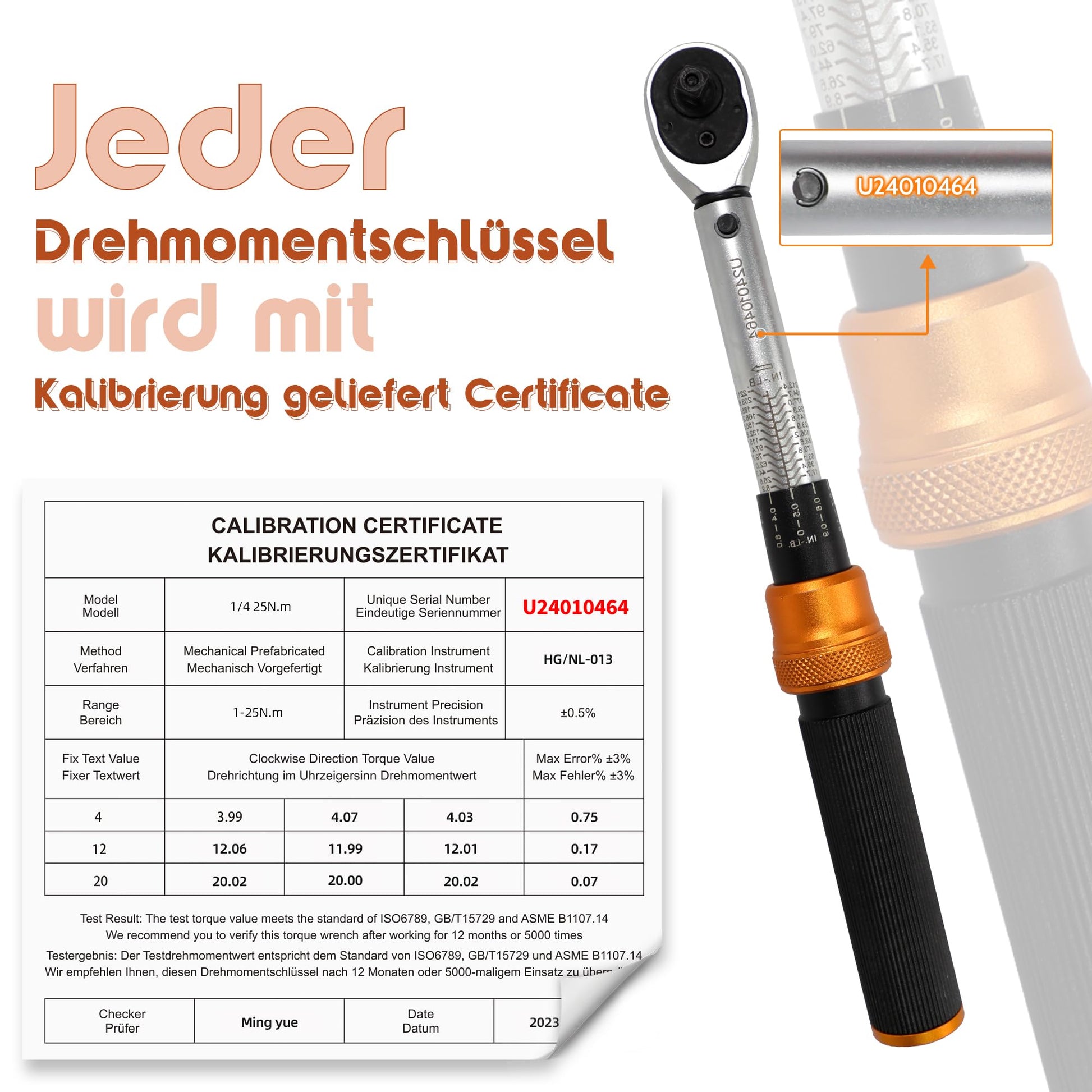 ["【13 Piece 1/4\" Torque Wrench Set】: Includes 1x1/4\" torque wrench, 1x1/4\" extension bar (100mm), 8pc hex socket set (H2, H2.5, H3, H4, H5, H6, H8, H10), 3pc Torx socket set (T10, T25, T30), with a sturdy plastic case for storage and portability. Widely used for assembling or repairing bicycles, mountain bikes, motorcycles, and other accessories.","【±3% Accuracy】1/4 inch torque wrench 1-25NM industrial grade torque wrench calibration error range ±3%, with micro adjustments at 0.2 nm. Complies with the requirements of ISO 6789-1:2017, GB/T 15729, and ASME B107.14M and conformity test methods.","【Easy to Use】Pull down the locking knob and hold until the torque setting is complete. Release your hand, and the locking ring will automatically spring back and lock. Handle scale adopts laser technology, dual-range scale is clear and easy to read, not easy to wear. Important: Set the minimum torque value when not in use to extend the life of the torque wrench.","【Professional Tools】1/4\" Torque Wrench Dual Direction Click Torque Wrench Set. With reversible 72-tooth Cr-mo ratchet head, quick release, could easily install and remove the sleeve, anti-slip aluminum handle, making it easy to use.","【Reliable Warranty】Professional quality - Each hand tool is fully checked for accuracy before shipment. Important: Set the minimum torque value when not in use to extend the life of the torque wrench."]