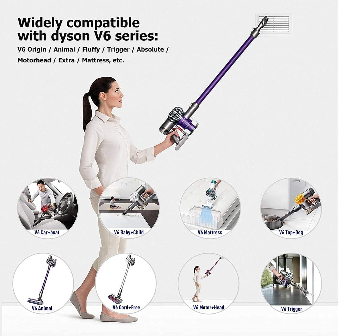 ["[V6/DC62 Battery Specification] Upgraded to 6.0Ah, the FLYLINKTECH V6 replacement battery has longer runtime and more power than the original V6 battery. New design V6 replacement battery fits V6 series vacuum cleaners.","[Compatible with V6/DC62 Vacuum] Well compatible with Dyson V6 DC58 DC59 DC61 DC62 DC72 DC74 Absolute Animal Motorhead Slim SV03 SV04 SV05 SV06 SV07 SV09 handheld vacuum cleaners and works with the original V6 charger. (NOTE: Only for V6, NOT for V7 V8 V10 V11 DC31).","[Multiple Protection Measures with V6 Battery] The FLYLINKTECH V6 battery is made of high-quality imported lithium battery cells that meet safety test standards. Built-in multi-protection (overcharge, short circuit, high temperature, and overcurrent protection) and fire-resistant design. The battery has been tested 1000 times by the manufacturer, with no memory effect and virtually no self-discharge.","[Note for V6/DC62 Battery] Do not charge the device immediately when the battery is empty. Let the battery cool for 10-20 minutes. This is very important before charging the device, especially in MAX mode when the battery is hot. Red flashing indicates a battery error. Try again or contact us via Amazon message.","[Warm Tips] We are always here to solve your problem throughout the entire shopping experience. You will receive V6 replacement battery*1+pre-filter*2+brush*1+screw*2 to revive your vacuum cleaner."]
