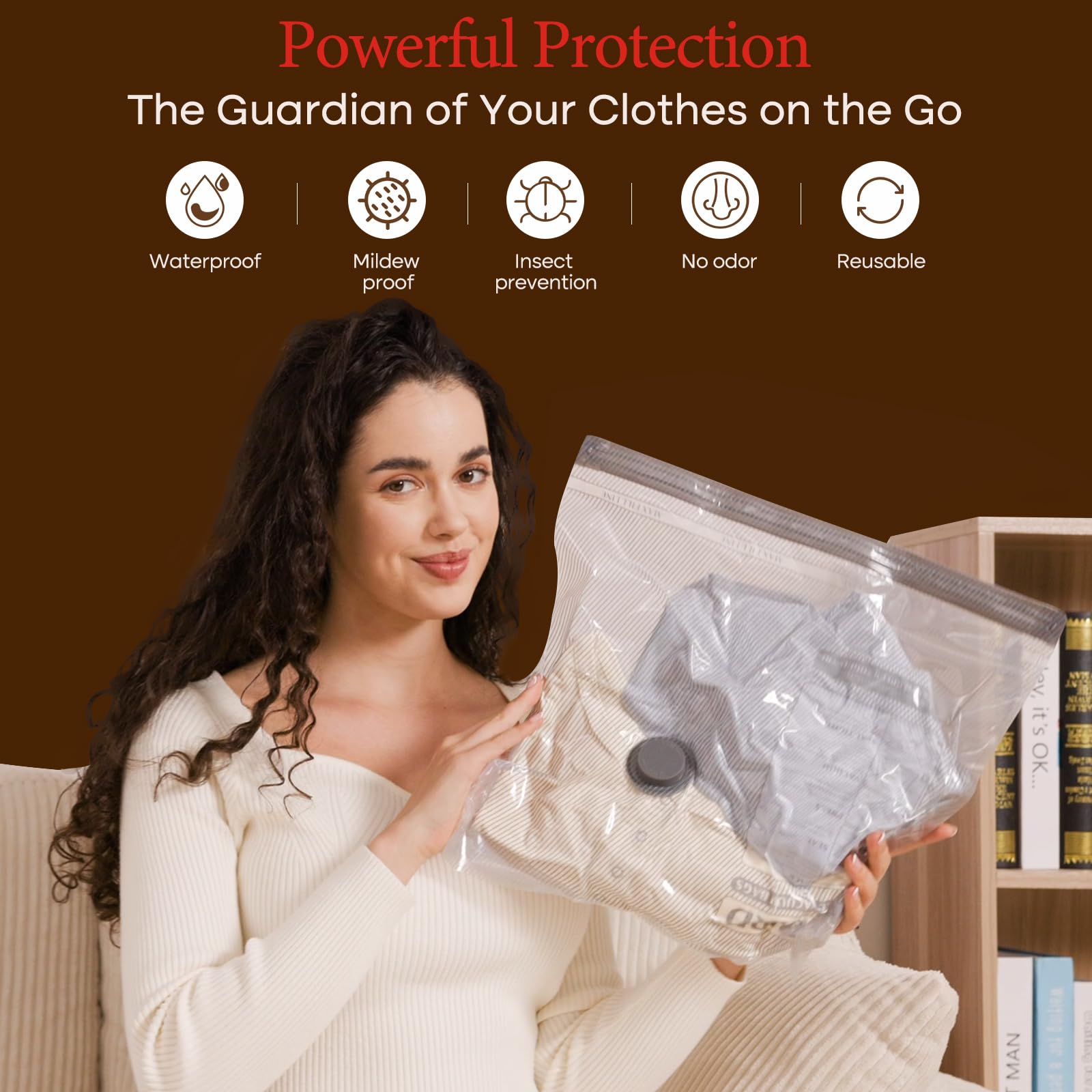 "How are the clothes protected? Our travel clothing vacuum bags feature a double-layer zipper design and special valves that ensure better sealing. They effectively protect bedding and clothing from moisture and bacteria, extending the lifespan of your clothes."