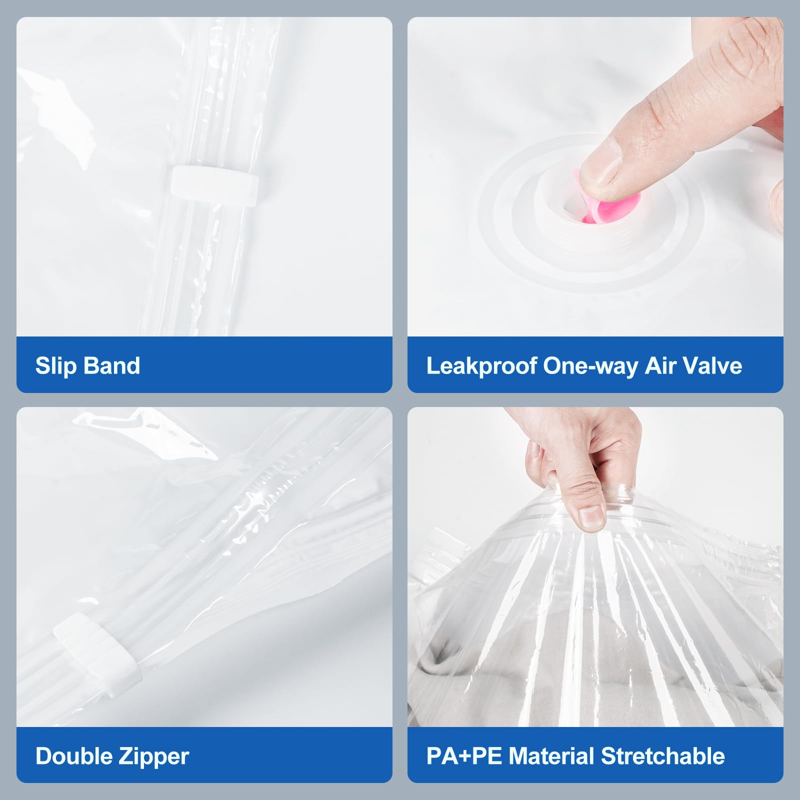 ["Space-saving when storing clothes Vacuum bags can be used for clothing storage and traveling, effectively reducing the volume of clothing by up to 80% or more. They are ideal for saving space at home and packing items while traveling. Electric vacuum pump Compared to manual pump, it is faster and easier to use and compared to a vacuum cleaner, it is smaller and more portable. Simply plug it into the socket, place it on the valve of the vacuum bag, and wait for a short time, the process is complete. Improved material The vacuum bags are made of a new high-quality blend of PA and PE, which is sturdy, durable, and reusable. The vacuum garment bag repels moisture and dust to ensure that your clothes stay dry and clean. What's included in our vacuum bags? Our vacuum bags for clothes include 7 pieces: 1 electric pump and 6 small bags (60x40 cm). If a Vacbird vacuum storage bag loses air due to quality issues, we offer a free exchange and return service for up to 1 year."]