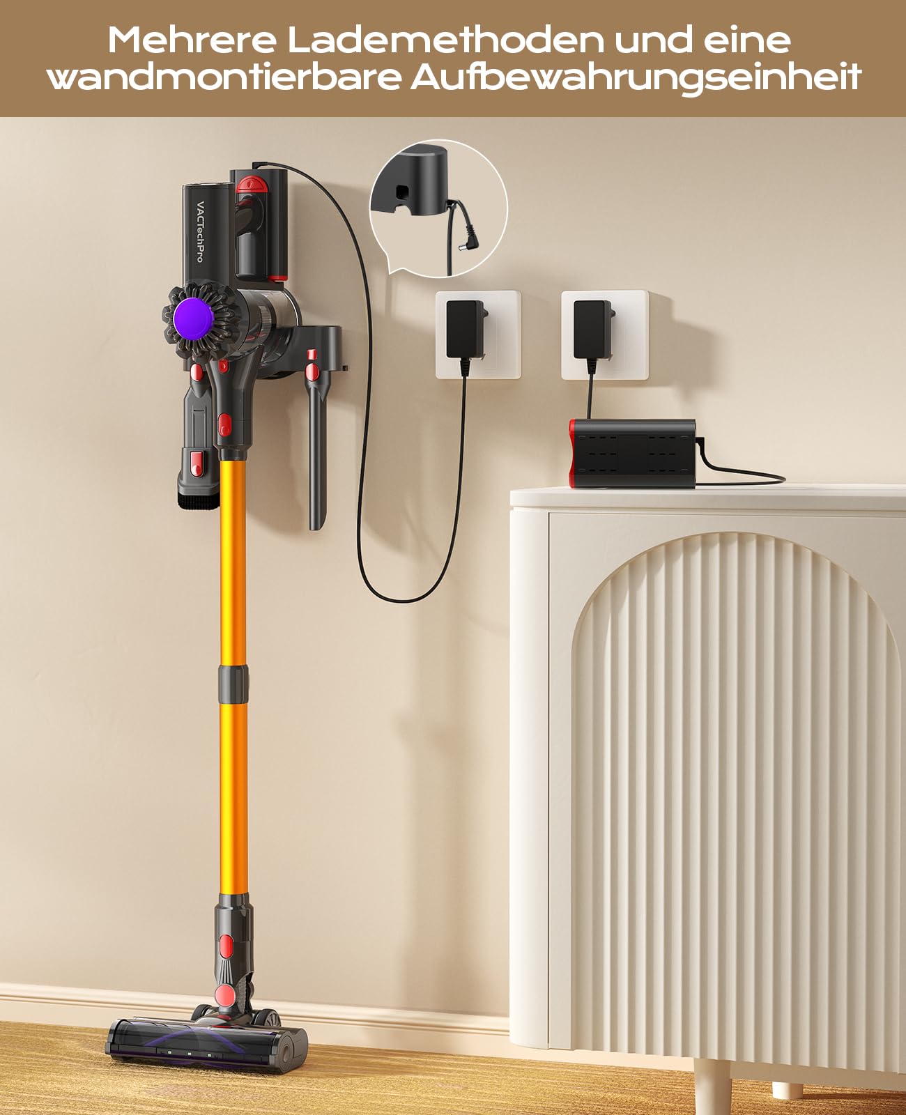 ["Up to 35 minutes of runtime and detachable battery"] With a rechargeable high-performance battery, the cordless vacuum cleaner offers exceptional cleaning performance for up to 35 minutes (ECO mode for 35 minutes, MAX mode for 18 minutes) to ensure thorough cleaning of the entire house. The detachable battery can be charged separately or directly on the main unit.