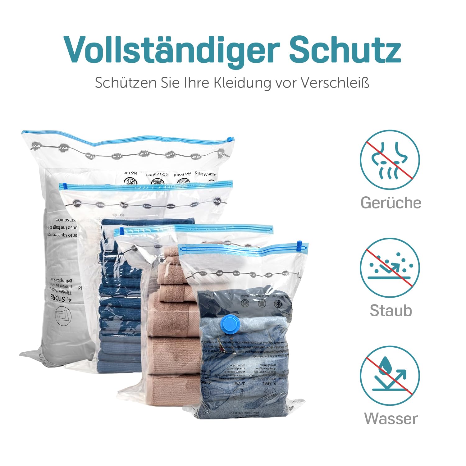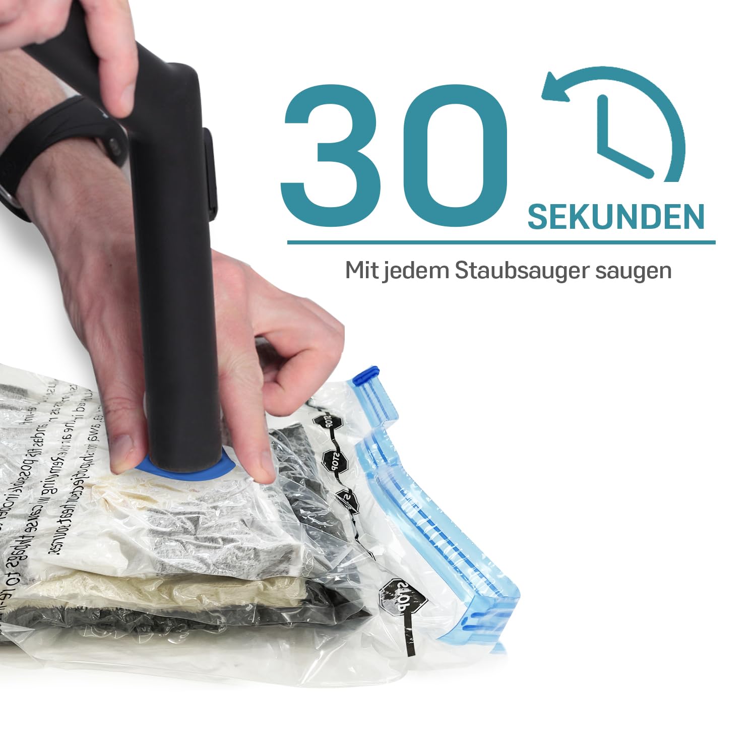 ["šć4pcs JUMBO | bulk items storage ideać4 * 100Ć80cm vacuum bags for clothes included. Suitable for all types of seasonal clothing, coats, stuffed animals or bulky pillows, sheets, blankets, and duvets, etc. Your gardening supplies can also fit in the bags. Works with regular vacuum cleaners, hand pumps, and electric pumps. Create more storage space.","š¦ćMaximize your storage spacećClothing vacuum bags can reduce the volume of clothes, bedding, down jackets, sweaters by up to maximum 80%. In just a few seconds, your comforter will be smaller. A great space-saving solution for closets, garages, basements, suitcases. Widely used at home, during moves, and while traveling. No need to replace a larger wardrobe, definitely an affordable and practical solution that gives you a tidier home.","š§„ćQuality Guarantee and ReusablećThe 3mm thick duvet vacuum bag made with antimicrobial PE + PA material is durable and tear-resistant. Double-secure zipper with sturdy slider prevents snapping, sliding, or accidental opening, quick and easy to open and close. Multiple seal design, hard to leak. TRANSPARENT DESIGN - Everything is visible at a glance.","šćComplete ProtectionćWith excellent sealing design, the leak-proof double zipper and triple-sealed turbine valve can effectively release all air without backflow, suitable for long-term storage. Say goodbye to mold, bacteria, insects, moisture, and odors. With this all-around protection, you have more storage options, whether in the basement or under the bed, the items in the vacuum bag stay clean and dry.","š ćEasy to UsećVery easy to use, simply place things in the vacuum bags and fully close the zipper of the vacuum bag by moving the clip a few times, then remove the air with the pump or vacuum cleaner and tighten the valve cap. Not enough storage space? Need more space to store your winter clothes or comforters? Get a few vacuum bags, and say \"Ciao\" to these problems!"]