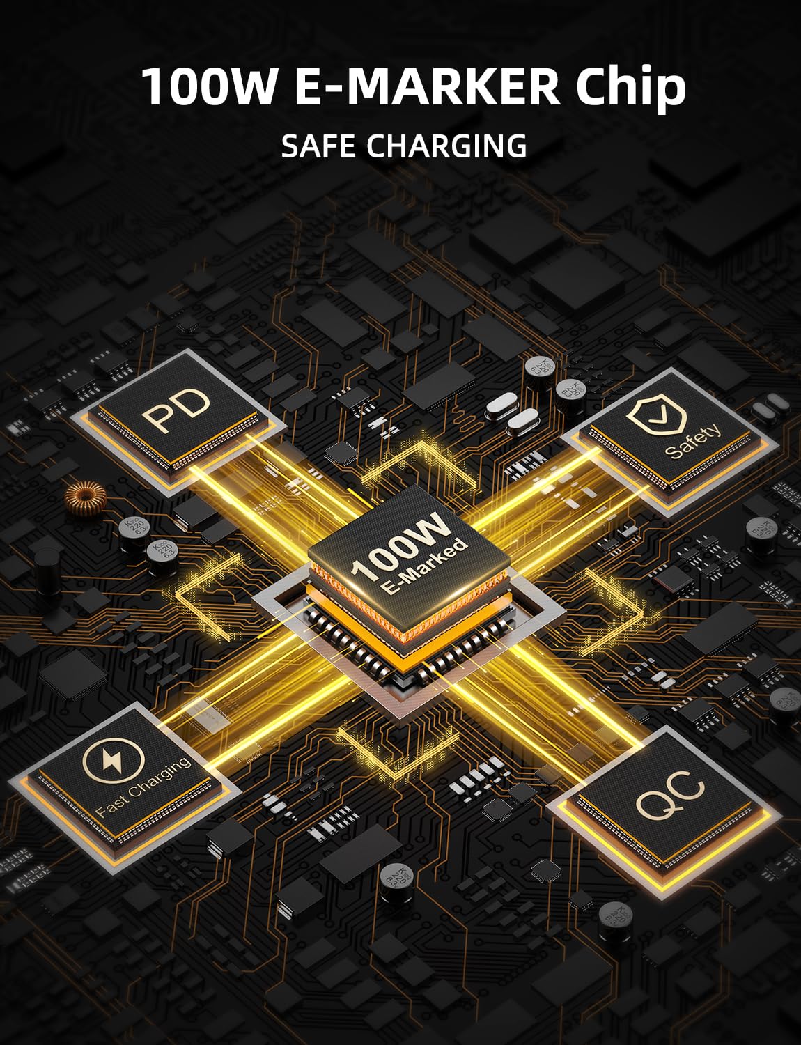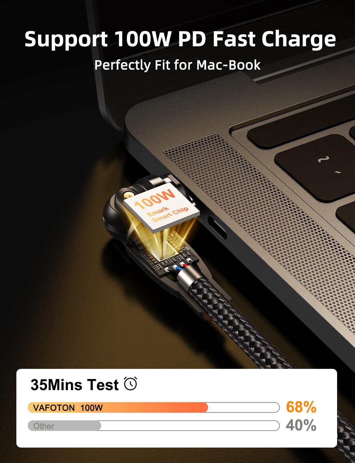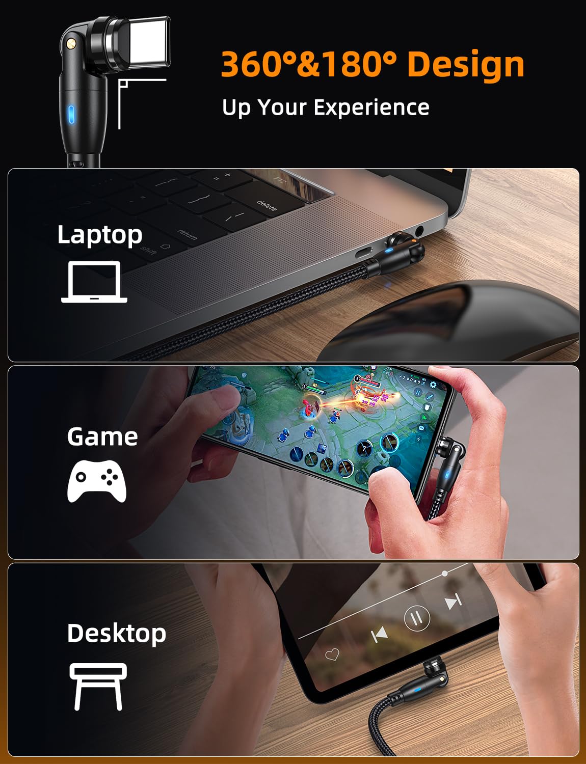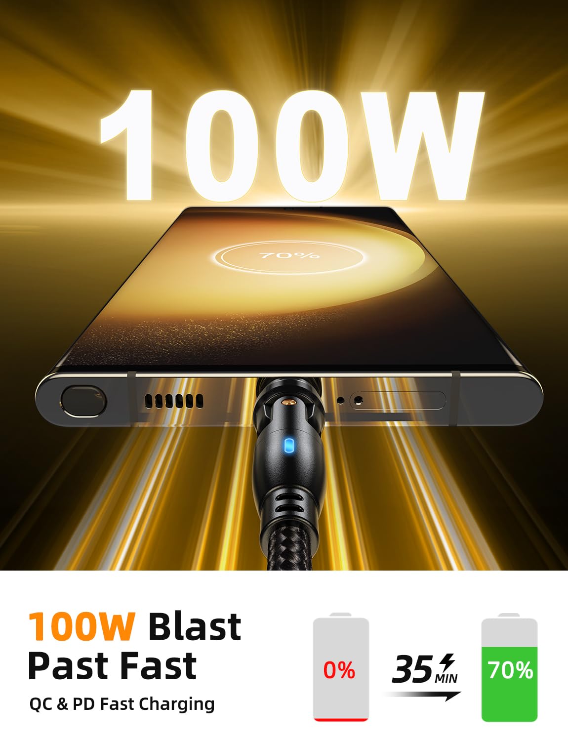 ["Built-in 100W E-MARK Chip] The built-in 100 W E-MARK chip allows up to 100 watts (20 V/5 A) when used with a USB-C 100 W fast charger. This is a magnetic USB-C charging cable that ensures safe and fast charging by automatically adjusting the current, enabling fast charging of laptops, smartphones, tablets, drones, and other devices.","[Strong, Enhanced 9-Pin Magnetic Connection] Faster and more stable charging than traditional 7-pin, 5-pin, or 1-pin cables due to stronger magnets. Not only is it a magnetic charging cable, but it also allows for super-fast 480 MB/s data transfer speed (updating hundreds of songs per minute).","[The magnetic cable connection is a very convenient thing] Also suitable for use with your children's and grandchildren's devices, as it has no consequences if they jump up from the chair after forgetting to unplug the cable. This saves them a fortune in repair costs for device ports and charging cables. It is also very convenient for single-handed operation during car rides.","[360 ° and 180 ° Rotating Design] Allows for a 360-degree rotation at the plug tip and a 180-degree bend at the plug housing. This design is more user-friendly and practical for gaming, videos, e-books, and online shopping while charging.","[Improved Durability] Made of a cable reinforced with nylon braiding, it is designed to withstand daily wear and tear even under the most challenging conditions.","[Before purchasing, please note] 1. Charging from USB-C to USB-C is supported up to 100 W (20 V/5 A), charging from USB-A to USB-C is supported up to 18 W (9 V/2A). 2. Compatible with all 9-pin magnetic charging cables with round plugs on the market. 3. Includes only 2 Type-C magnetic heads, does not include micro or iProducts magnetic heads.","[What's in the Box] 2 magnetic charging cables (1 meter and 1.80 meters long each), with 2 USB-C connectors. Also included are 2 USB-C to USB-A adapters for the non-magnetic charger-side ends of the cables. Also included are a retractable tool and a storage tool for secure storage of the magnetic plugs.","[Compatible with Most Smartphone Cases] We have updated the 9-pin Type C magnetic head, the new Type C head is 3mm longer than the old one to eliminate compatibility issues with smartphone cases."]