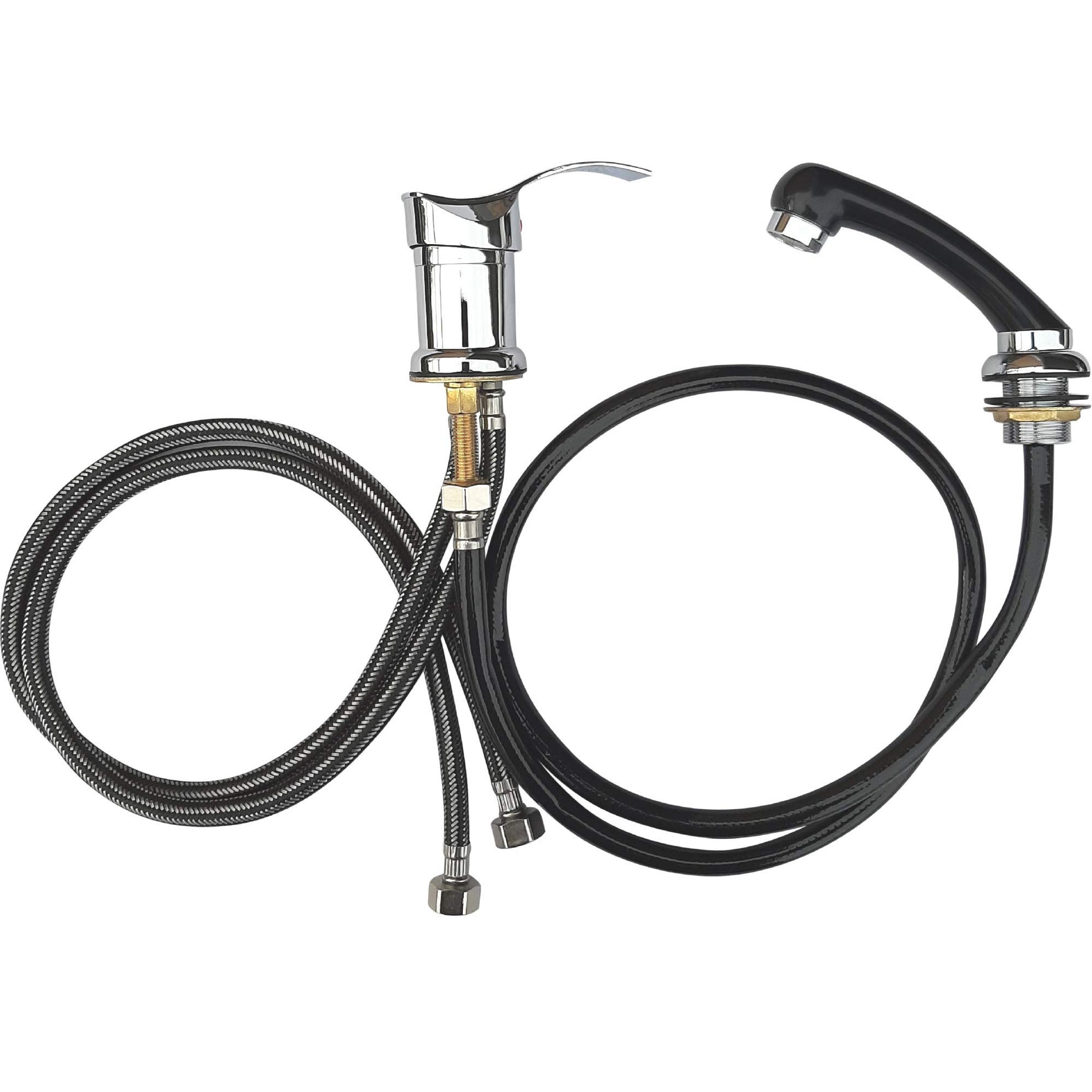 [""]"✔ APPLICATION: Suitable for all standard salon washbasins, wash chairs, wash basins, and backwash units","✔ HIGH-PRESSURE FITTING: With 3 connections for hot-cold water and hand shower / Thread: 1/2 inch DIN (18.4 mm)","✔ COMPLETE SET: Consisting of lever mixer & hand shower with hoses and mounting accessories","✔ QUALITY: High-quality construction, particularly quiet due to brass valve core","✔ DIMENSIONS: Mixer connection hose length 40 cm, retractable hand shower hose length 113 cm"[""]