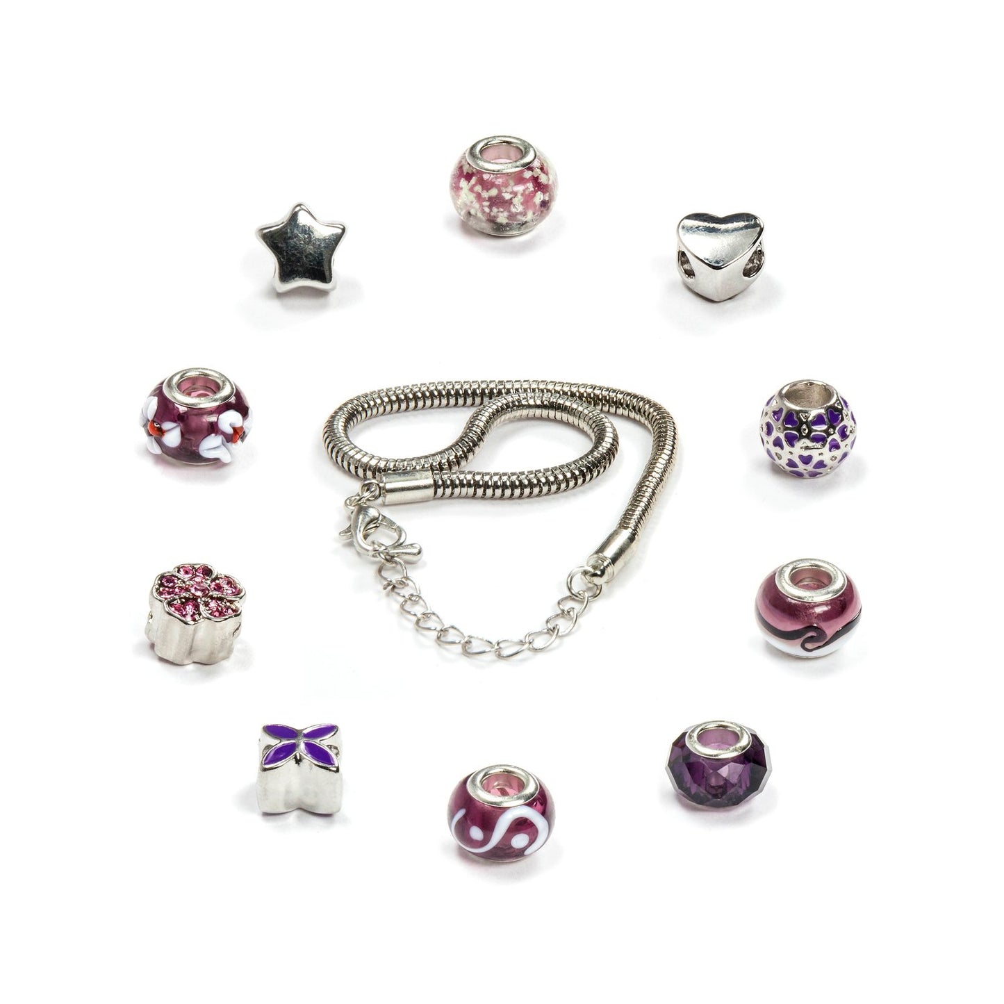 The colorful mix of glass, plastic, and metal in purple, pink, and silver can be individually combined with current fashion and for any occasion. The charms can be worn individually or in combination with each other."