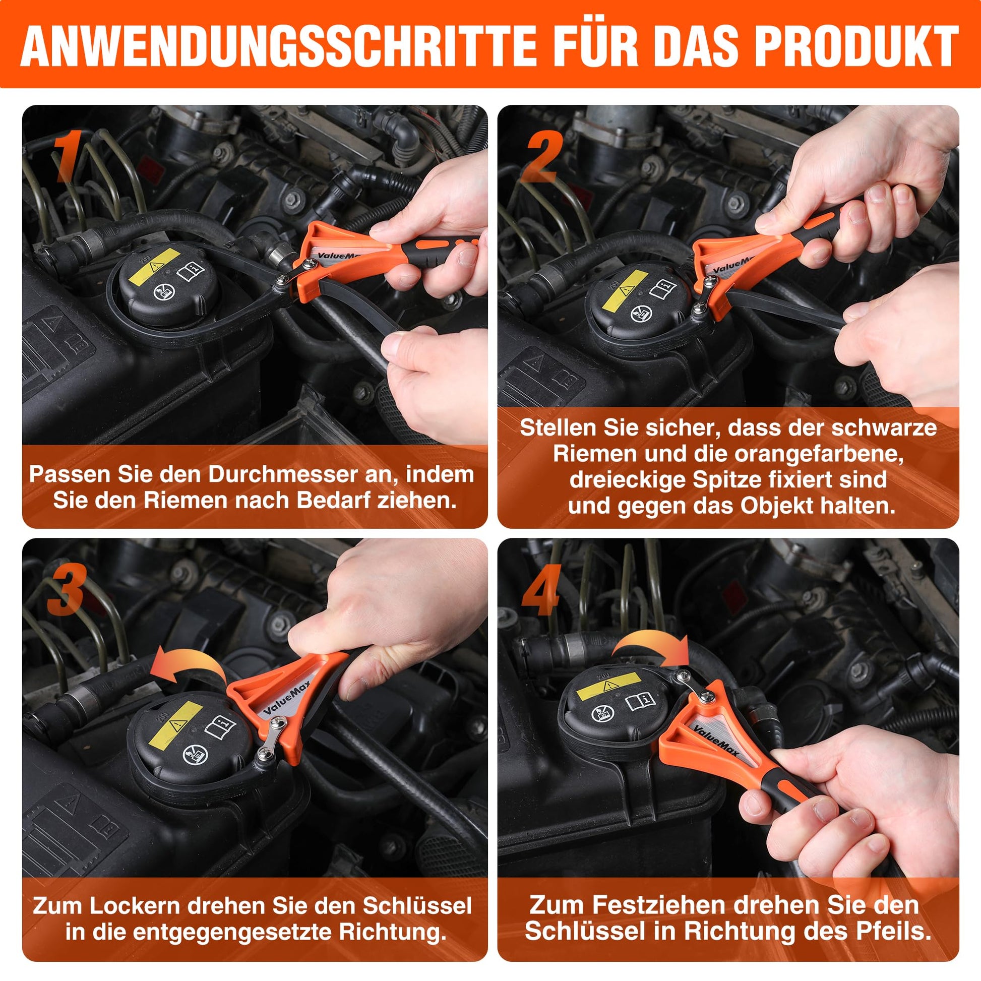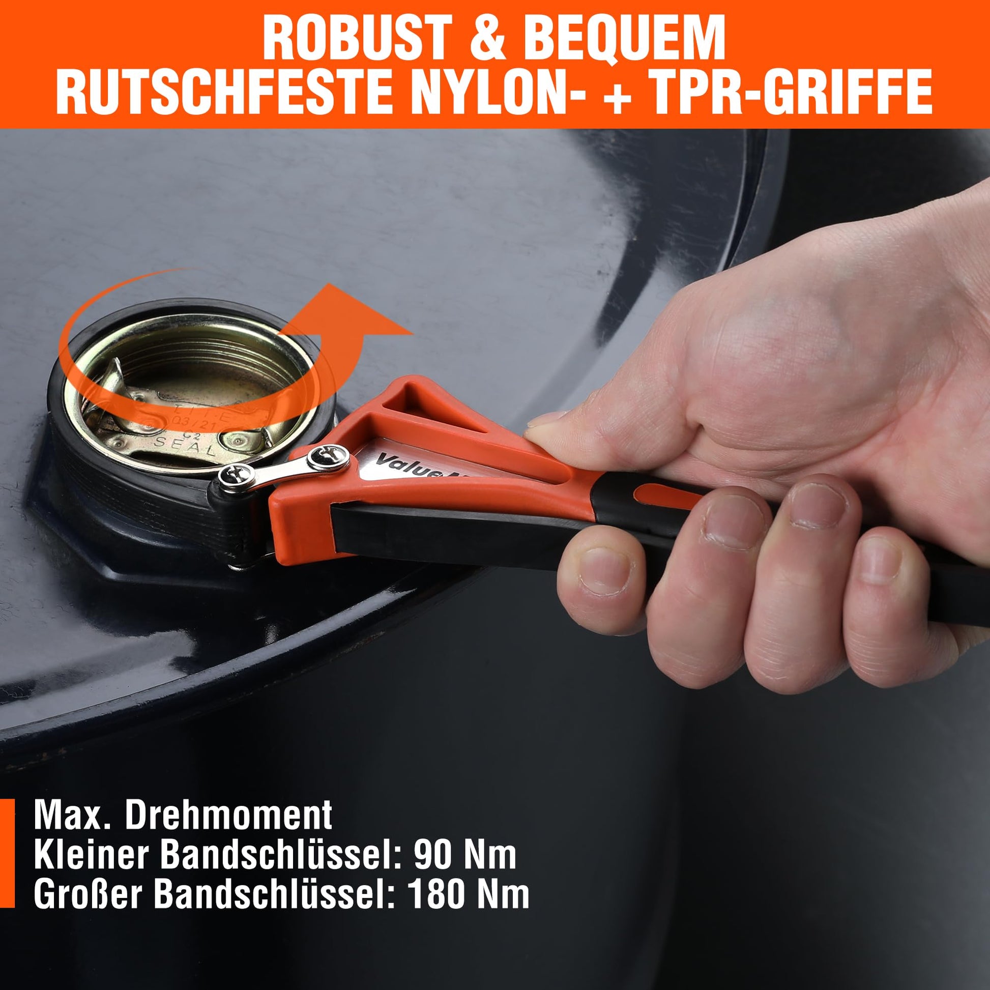 ["2-pc. ADJUSTABLE OIL FILTER STRAP WRENCH - Our strap wrench set offers two different sizes of strap wrenches. The large strap wrench is 24.8 inches long and 0.22 inches thick, with a maximum rotation diameter of 5.9 inches; the small strap wrench is 18.1 inches long and 0.16 inches thick, with a maximum rotation diameter of 3.9 inches.", "THE HIGHLY DURABLE RUBBER BANDS - The large strap wrench can withstand up to 450 lbs of force, the small one up to 337 lbs. Made of high-quality rubber, they are thick, flexible, and protect surfaces from scratches, ensuring their longevity.", "WIDE RANGE OF USE - The large strap wrench offers a maximum torque of 133 lb-ft, the small one 66 lb-ft. Ideal for removing/installing oil filters, PVC connections, water filters, sinks, faucets, bottles, shower heads, fuel filters, and jar lids.", "COMPACT AND SPACE-SAVING - The strap wrenches are small and lightweight, easily fitting into toolboxes and perfect for use in tight spaces. The large one weighs around 10.6 oz and the small one only 3.9 oz.", "EASY TO USE - Wrap the band around the object to grip, secure it tightly, and then turn the handle in the desired direction. The large strap wrench is suitable for tasks requiring more power, while the small one is suitable for lighter work."]
