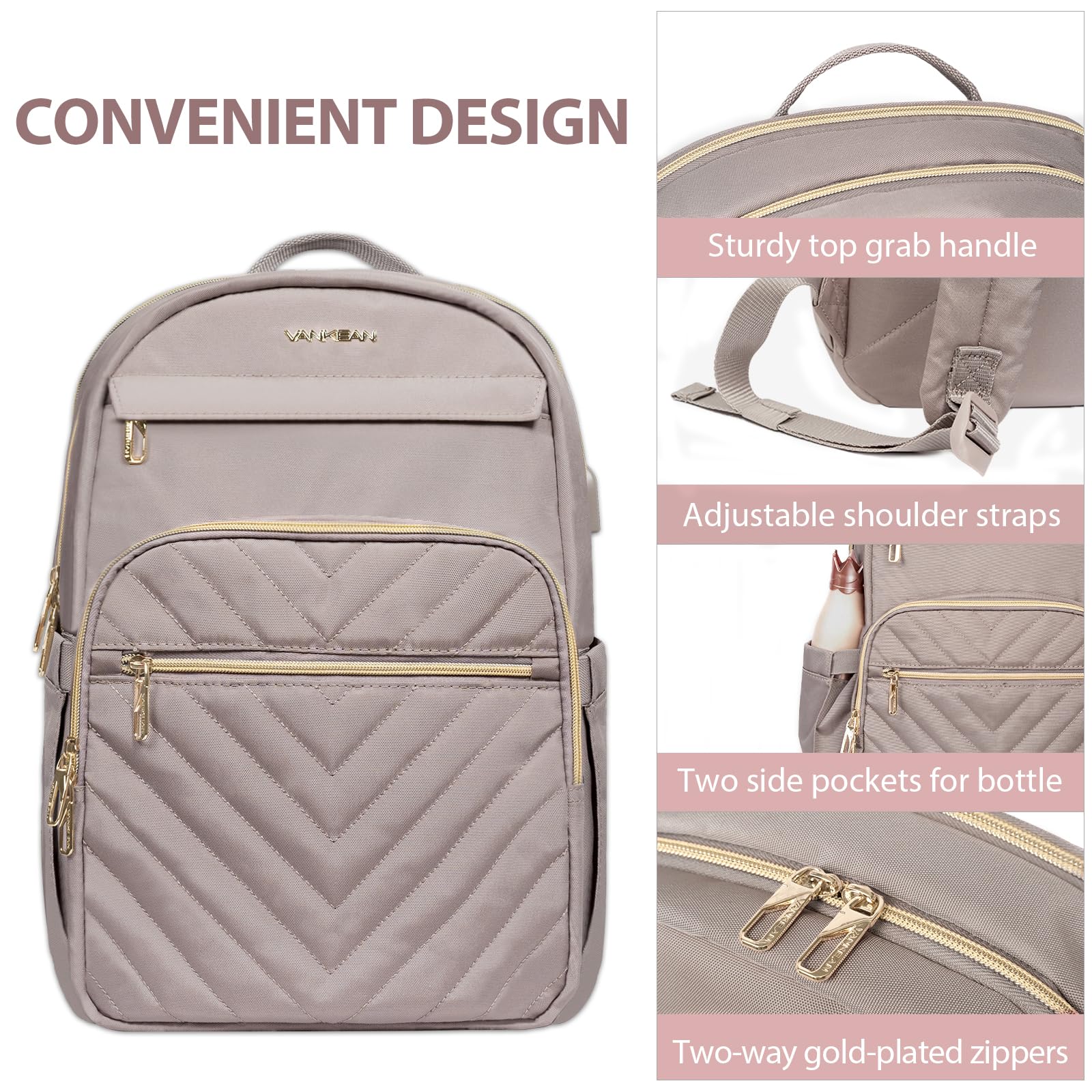 ["Stylish backpack with black & gold & water-resistant design: VANKEAN's black laptop backpacks for women feature exquisite gold-plated zippers and a fashionable stitching structure. Size in detail: 17" H x 12.6" L x 7.8" W. Weight 1.76 lbs and easy to carry. The exterior material of VANKEAN's stylish, lightweight backpack is waterproof and scratch-resistant nylon with a fully lined, tear-resistant, custom polyester lining.","Multifunctional backpack with laptop compartment: A total of 5 compartments and two side pockets - 1 separate laptop compartment for 15.6-inch laptops - plus an extra padded sleeve for tablets or Kindle, 1 main compartment for storing books, speakers, and business files, while still leaving room for daily essentials, 1 front pocket and 2 front pockets offer plenty of space for organization - pens, cards, notebooks, wallet, sunglasses, etc.","USB charging port design: VANKEAN laptop backpacks feature an external USB charging port and built-in charging cable that can easily be connected anywhere (power bank NOT included). This USB backpack provides a more convenient way to charge your phone on the go.","Shockproof laptop protective sleeve: The special laptop compartment fits up to a 15.6-inch laptop, padded with an exclusive foam protective case for your laptop, also the Velcro strap can secure the computer to prevent it from falling. Tablet slot fits up to 12.9-inch iPad. Mesh pockets for mouse, adapter, charging cable. Have a VANKEAN laptop bag, let it protect your computer security.","Comfortable and ideal gifts: Ergonomic shoulder straps, 1 durable top handle - designed for comfortable carrying all day. Arrive in style - A luggage strap for easy sliding over your luggage/suitcase handles. This elegant and refined backpack is perfect for work, college, business, travel, or daily use. It's also a great gift for work, sports, hiking, picnic time, beach time, camping, business trip, school life, etc."]