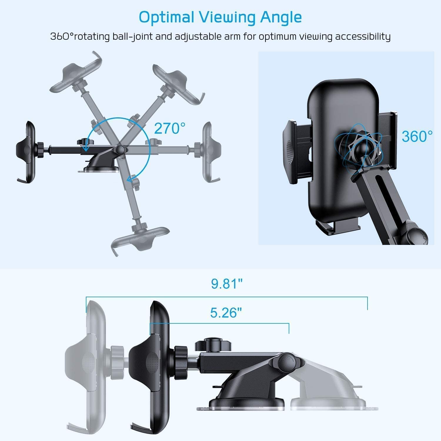 "Care about every detail - VANMASS car phone holder includes a 360° rotatable ball joint & extendable telescopic arm (11.3~25 cm), 2 additional joints are located on the suction cup holder, allowing length and direction to be flexibly adjusted, so you can place the car holder at the safest spot as you like. All joints securely hold the holder in place, ensuring unobstructed view and allowing you to drive safely and enjoy the ride.",