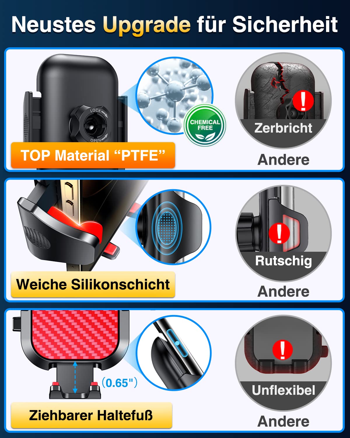 "Hold all smartphones - Thanks to the extendable holder feet (depth + 16 mm) and clamp arms (width max. 110 mm; min. 54 mm), the VANMASS car phone holder is compatible with all smartphones (4-7\") with/without case, even large/heavy phones with a thick/large case. Like for iphone 15 pro max/ for samsung S23/ Huawei mate 60 pro. There is enough space for charging cables between the holder feet, making driving more comfortable and safer.",