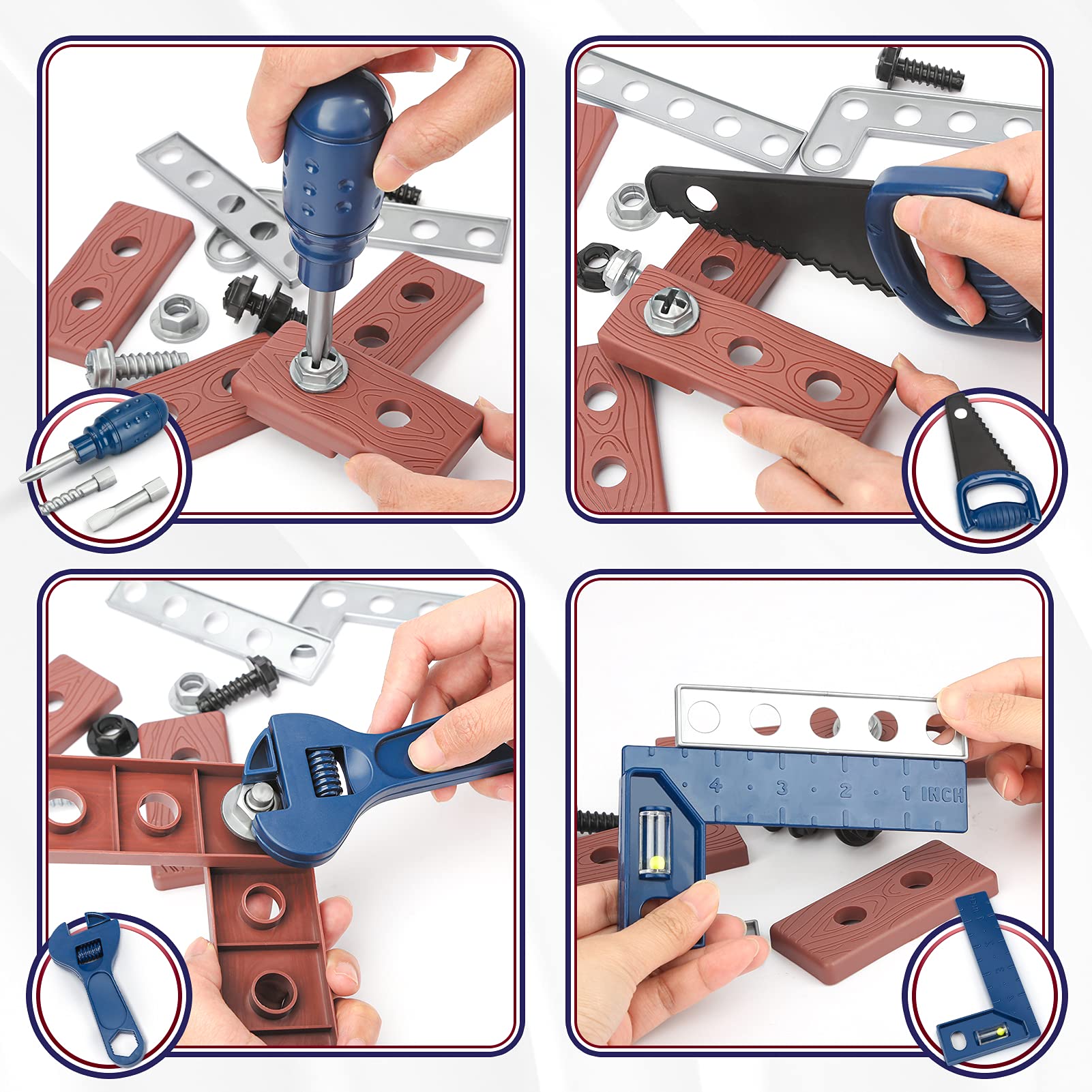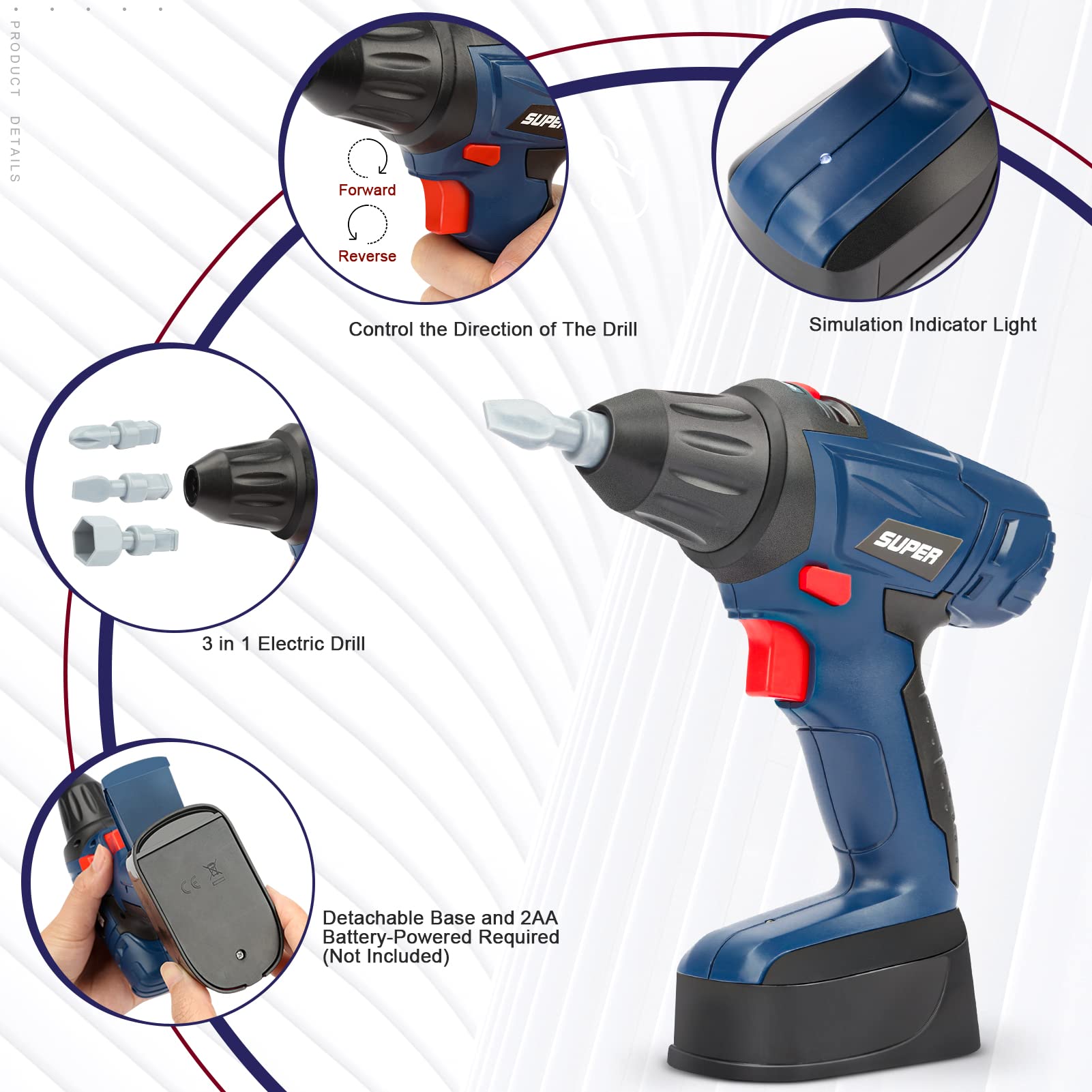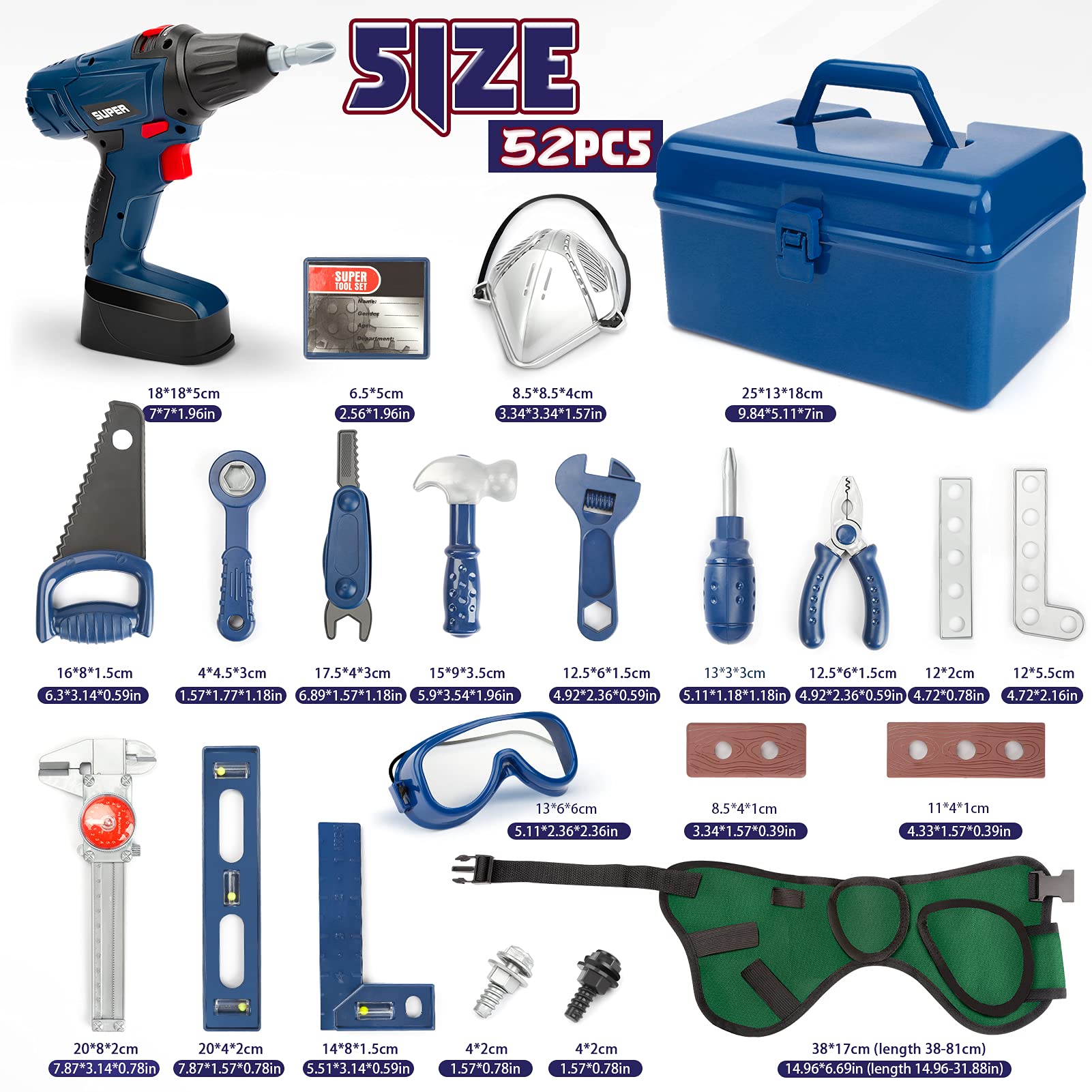 ["[52 Piece Tool Set for Kids] Including tool box, toy electric drill, tool belt, screwdriver, safety goggles, 12 screws, and 12 nuts, etc. This is a complete tool set with building and tool toys for boys and girls aged 3 4 5 6 7 years.","[Realistic Design for Role-Playing Games] The toy electric drill (Requires 2 * AA batteries, NOT INCLUDED) makes real sound, action, and light to attract children aged 3 years and older. Equipped with 3 interchangeable drill bits for different functions.","[High-Quality Kids' Toy for 3 4 5 6 7 Years Old] Made of safe and durable plastic, stable design, and no sharp edges, allowing children to easily organize the tool toys and take them anywhere, no mess.","[Construction Worker Learning Games for 3 Years Old] Suitable for early engineering games with matching, problem-solving, and construction skills that help children improve physical flexibility and hand-eye coordination, and stimulate creative thinking and imagination.","[Attractive Gift for Kids] The toy tool set is an ideal gift for preschool education, role-playing, Christmas, birthdays, etc. Great interactive children's toy for working with parents. Recommended for boys and girls aged 3 4 5 6 7 8 years."]