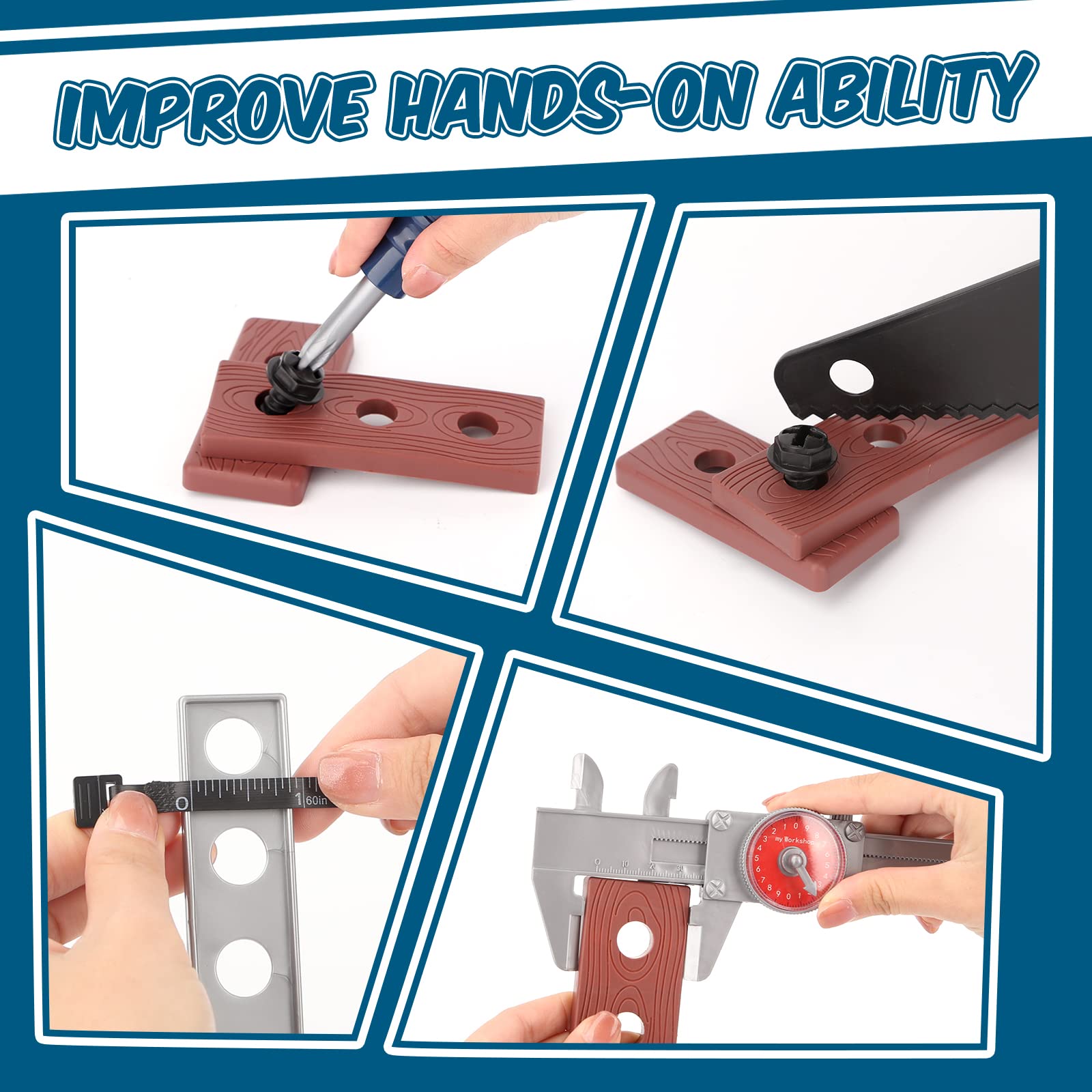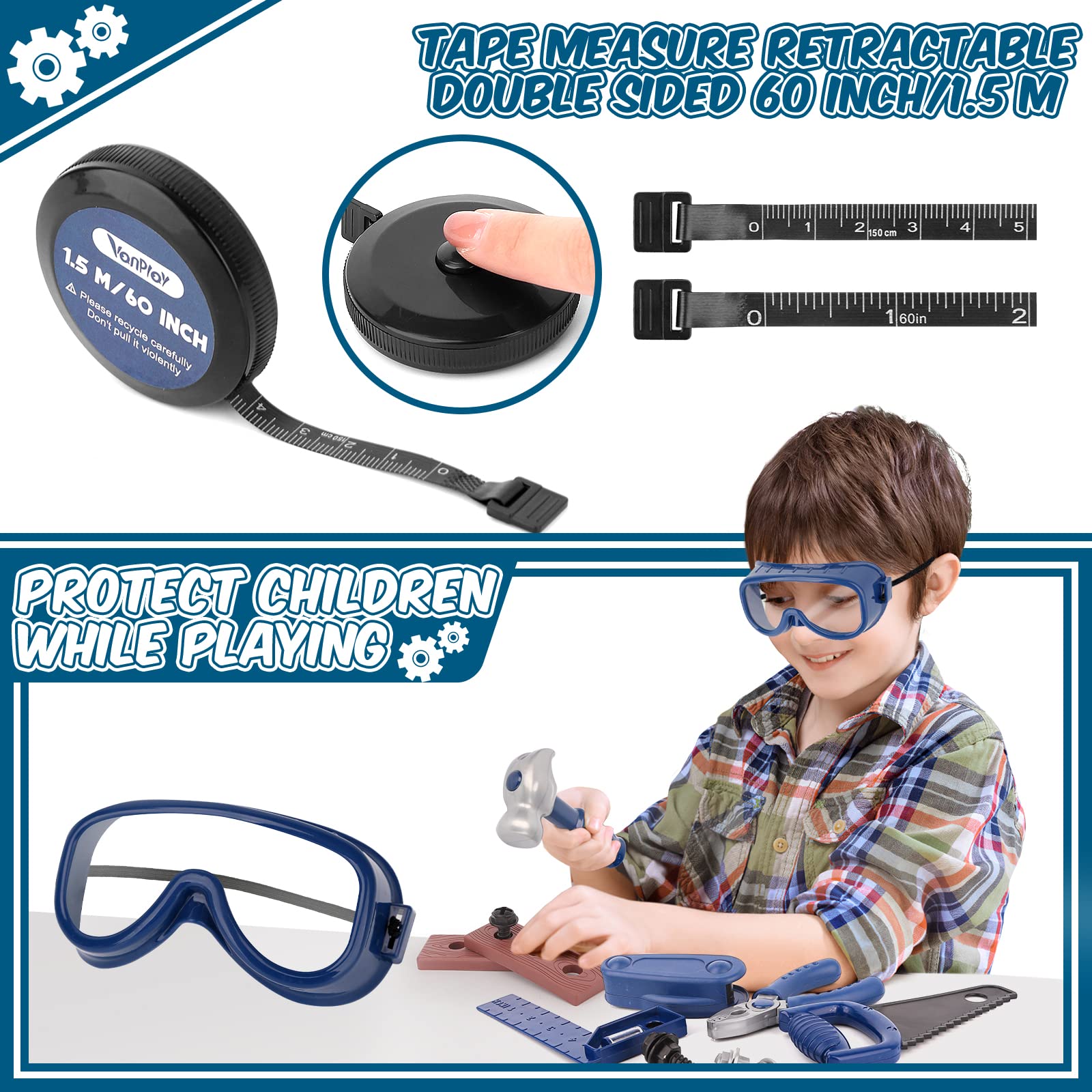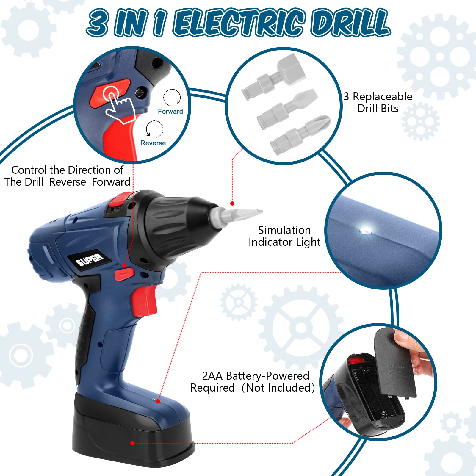 ["87-Piece Premium Tool Set] Made of environmentally friendly, safe, and durable plastic material. Includes tool case, electric toy drill, tool belt, measuring tape, 2 assembly cars, screwdriver, storage bag, safety goggles, 12 screws, and 12 nuts, etc.","[Realistic Role-Playing Experience] The electric toy drill (Requires 2 * AA batteries, NOT INCLUDED) makes real sound, action, and light. Retractable double-sided measuring tape 60 inches/1.5 meters. The assembly car with stickers has instructions for installation steps, providing children with a more realistic role-playing experience.","[Be a Little Engineer] The safety goggles also protect children from eye attacks during work. With the tools and storage bag, children can easily organize the tool toys and take them anywhere. Many tools allow children to repair things like Dad. When your children carry these tool kits, they look like real engineers.","[STEM Toolbox Set Kids] Suitable for early engineering games with matching, problem-solving, and construction skills that help children improve their physical flexibility and hand-eye coordination, and children can pretend to repair desks and chairs with their father and learn construction.","[Special Gift for Kids] The children's tool kit is an ideal gift for early preschool training, role-playing, Christmas, birthdays, outdoor games, etc. Great interactive toy for children to work with their parents. Recommended for boys and girls aged 3 and up."]