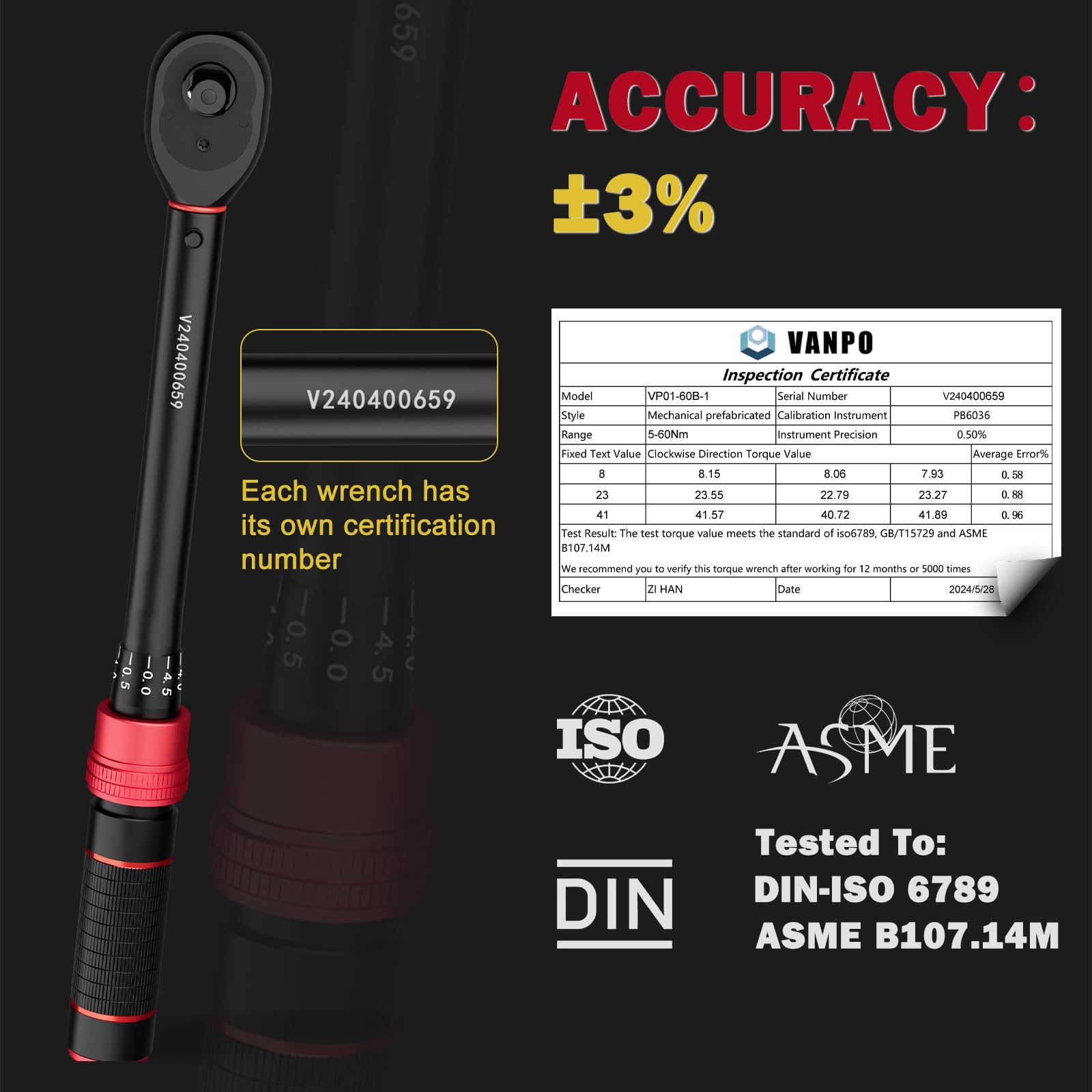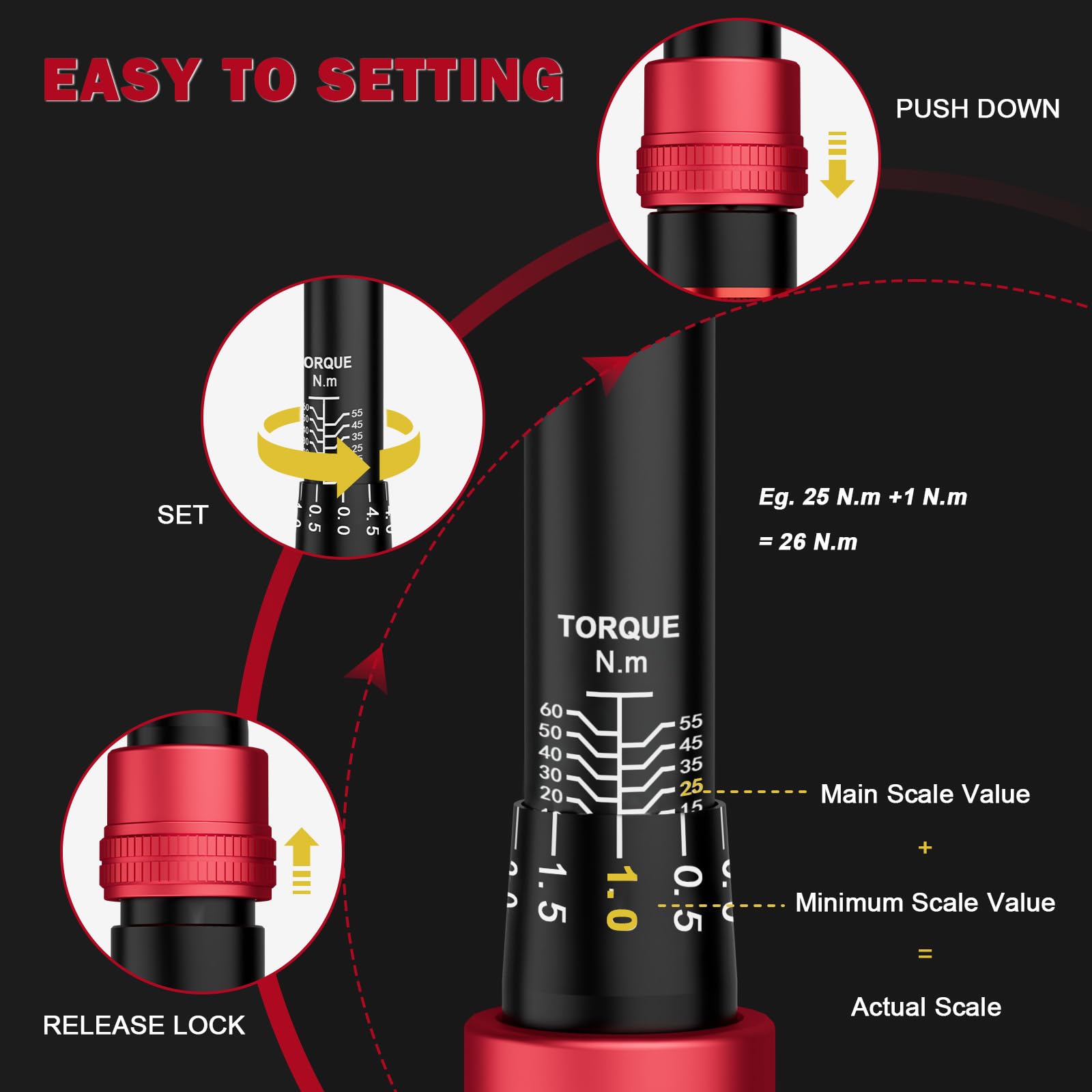 ["【±3% Precision】Our torque wrench is carefully calibrated to ±3% and complies with ISO 6789, GB/T15729, and ASME B107.14M standards. Each torque wrench comes with a calibration certificate containing a traceable and unique serial number, ideal for tightening screws on cars and motorcycles.","【Robust Design】Designed for long-lasting performance, our 3/8-inch torque wrench features a robust CR-MO handle, high-quality steel spring, and durable 40-chrome head. The ergonomic handle ensures a secure and comfortable grip.","【Click Display】When the torque wrench reaches the preset torque value, it emits a distinct "click" sound accompanied by a noticeable hand vibration, reminding you not to apply any more force to prevent damage. Features a reversible ratchet head with 72 teeth, ideal for use in tight spaces.","【Easy to Adjust】Simply pull down the locking knob, hold it in place, and set the desired torque value. Release it, and the locking knob will automatically snap back to secure the torque value. When not in use, please set the torque wrench to the minimum torque value (5 Nm).","【Versatile Usage】This torque wrench set comes in a sturdy plastic storage box. It includes a 1/4-inch adapter and a 125mm extension bar for convenient storage and organization. Ideal for small jobs on vehicles, bicycles, or other machinery, allowing precise tightening of screws and nuts with the correct torque. A great gift for car owners."]