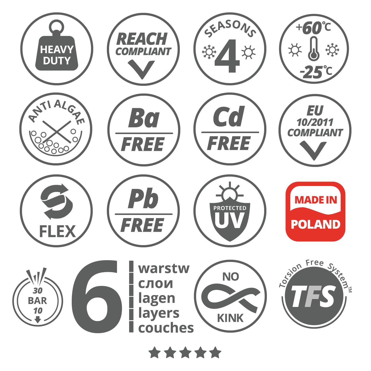▶ Suitable for a burst pressure of up to 30 bar ▶ Resistant to UV rays and algae deposits