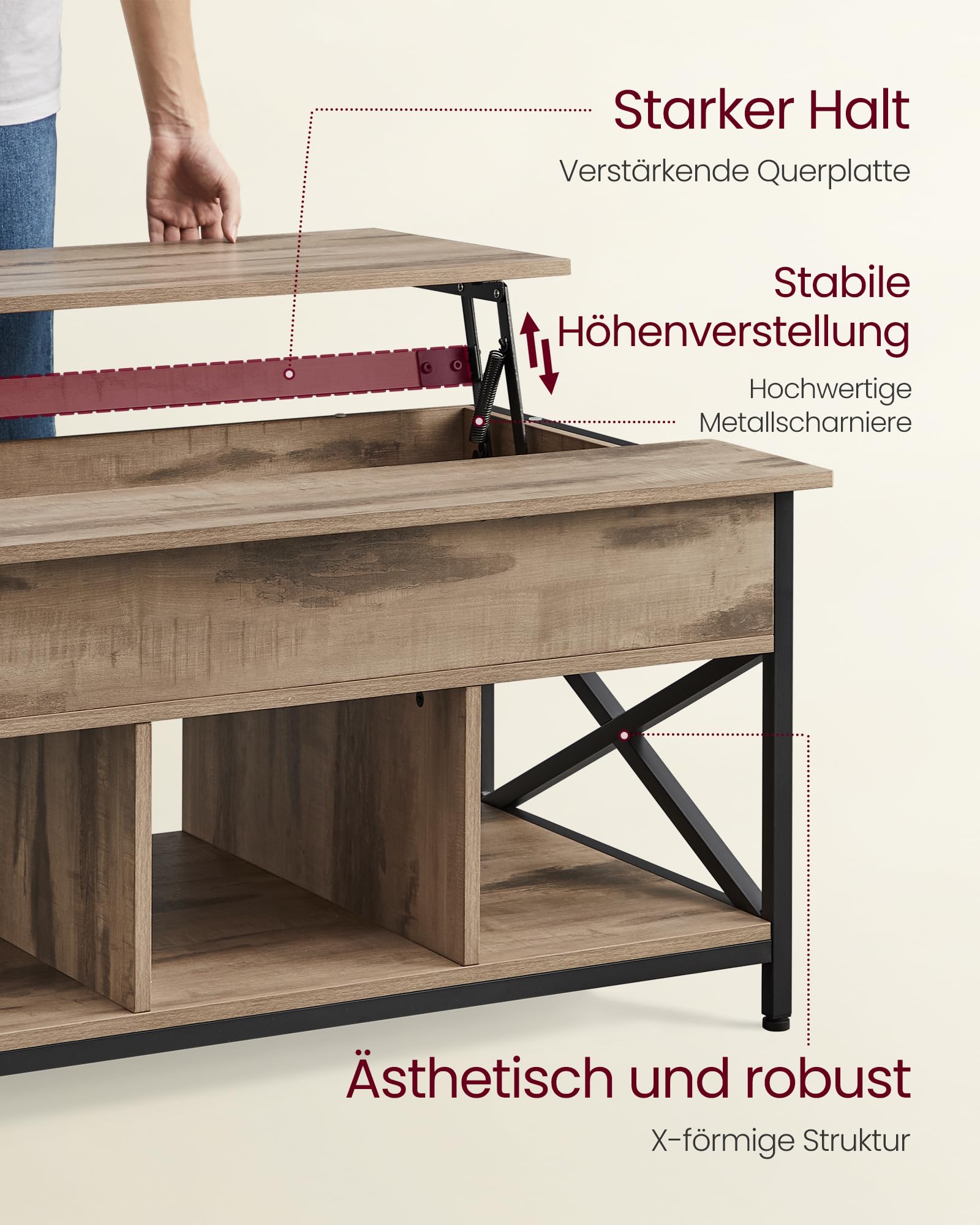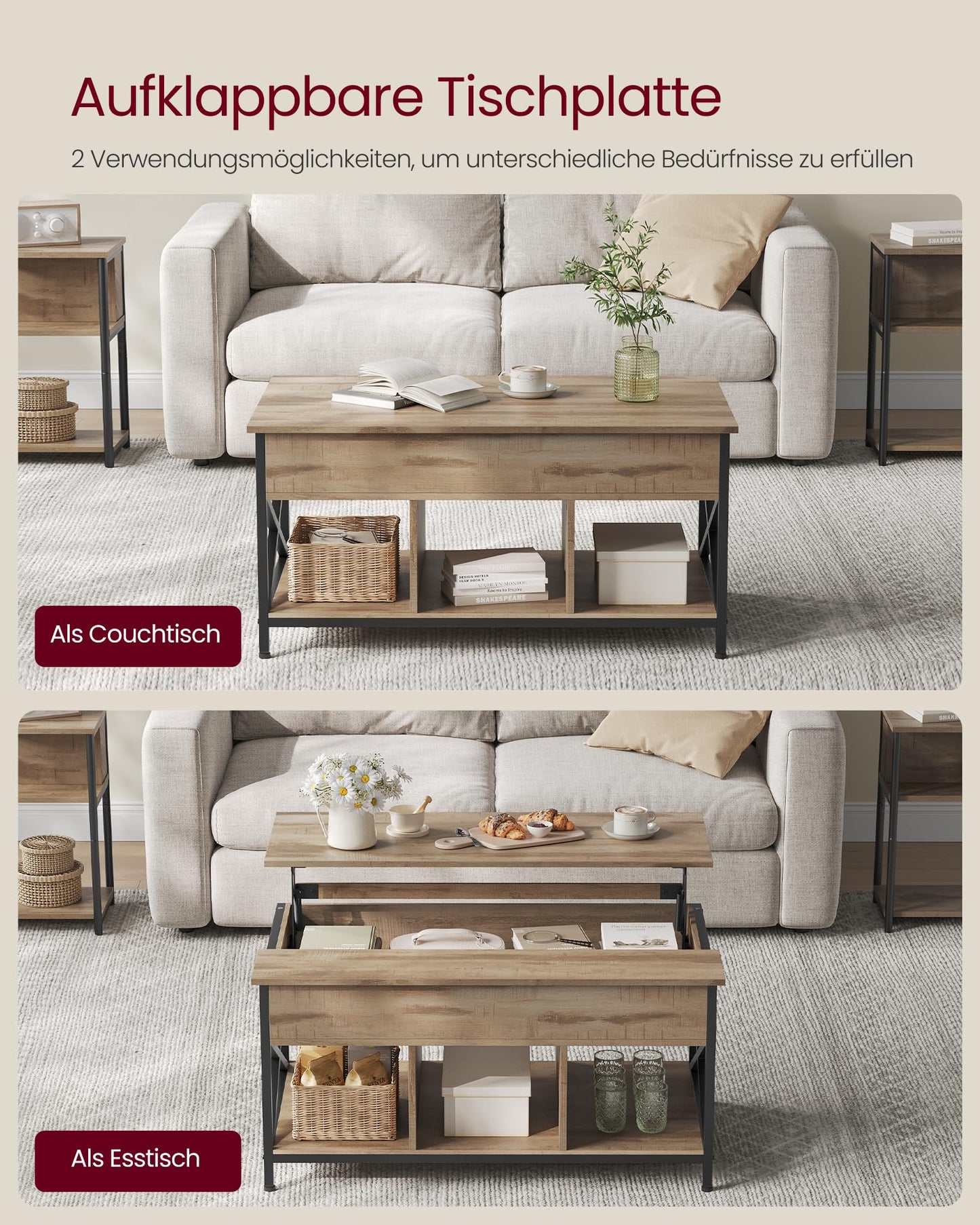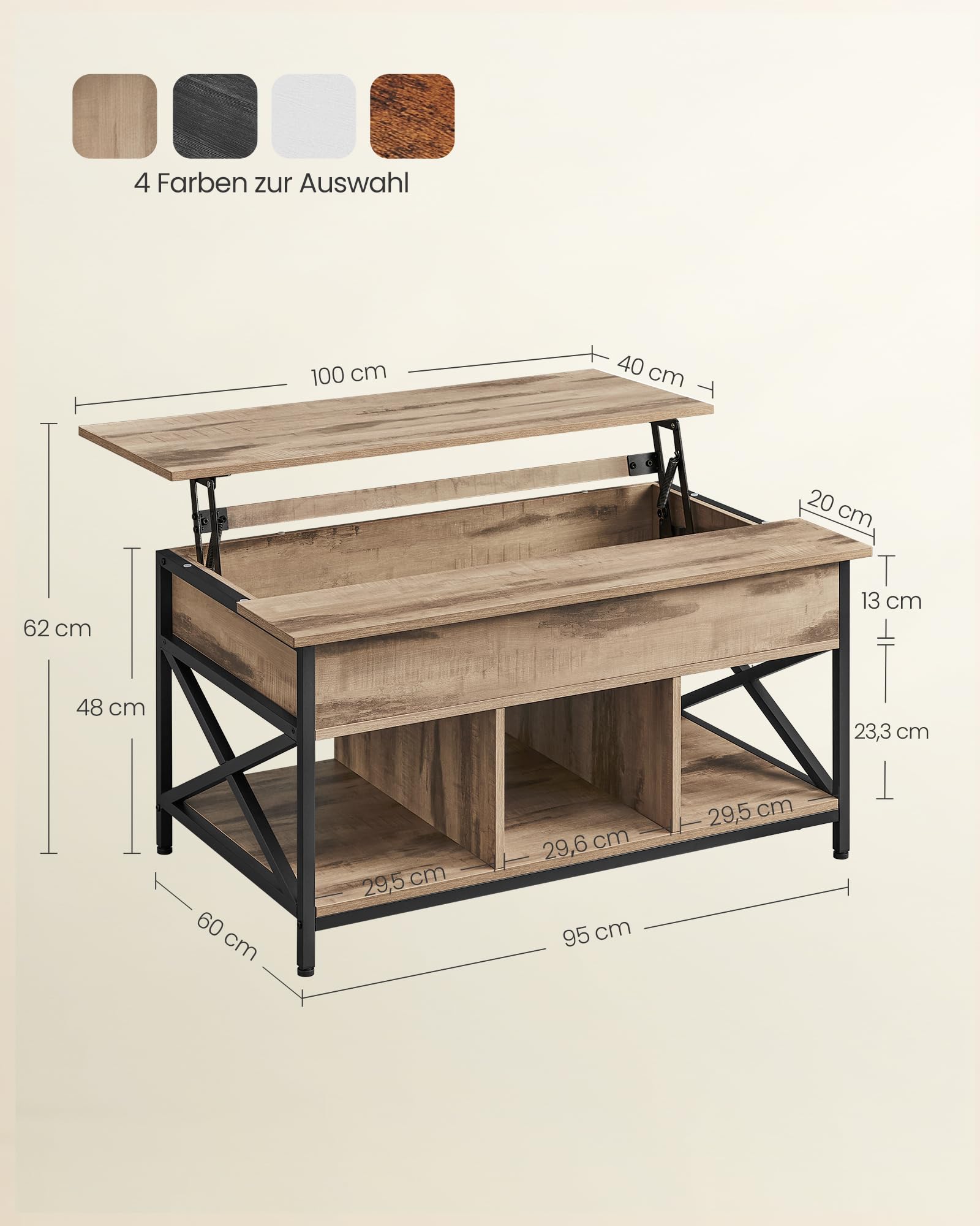["Lift the top] Lift the top of this coffee table forward. This allows you to comfortably work from home, surf the internet, enjoy a delicious meal, or craft while sitting on the couch","[Open shelves & hidden storage] 3 open shelves provide easy access to your books and other small items. The compartment under the top allows you to store items you want to hide","[Sturdy support] Thanks to the high-quality metal hinges and reinforced cross plate, the tabletop of this living room table lifts and lowers smoothly and without wobbling","[Attractive look] The black steel legs embody a chic industrial style, the camel brown tabletop brings warmth, and the X-struts give the table a unique character. Upgrade your room with this coffee table!","[Easy assembly & cleaning] With the labeled parts and clear instructions, you can easily assemble this coffee table. The surface is water resistant, so you only need to clean it with a damp cloth if it gets dirty"]