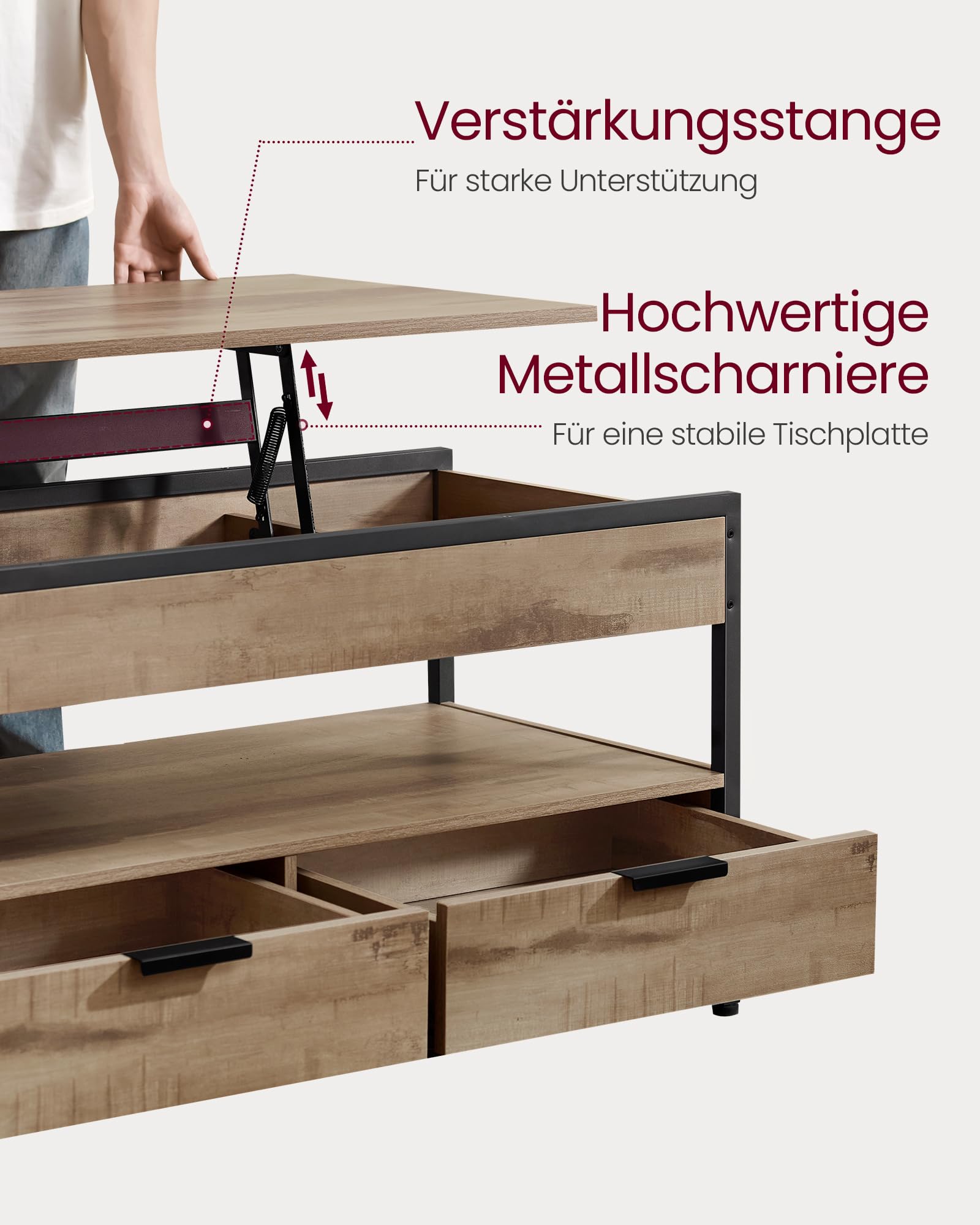 ["[Lift-Top Design] The table height can be adjusted from 19 inches to 25 inches, allowing you to find the perfect position for working, eating, or playing while relaxing on your couch. Maximize your comfort with this coffee table!","[Ample Storage Space] The large tabletop and bottom shelf provide open storage space for daily essentials. 3 hidden compartments and 2 drawers organize blankets, magazines, and other small items that don't need to be out in the open","[Sturdy Lifted Tabletop] With high-quality metal hinges and reinforcement bars, the tabletop of this living room table lifts smoothly and can support up to 44 lbs when raised. There's no wobbling here!","[Robust and Durable] This lift-top coffee table is made of sturdy engineered wood and a steel frame, making it strong and durable. It can hold up to 300 lbs, allowing you to use it with peace of mind","[Stylish Industrial Style] The ink-black table legs and camel-brown tabletops of this coffee table create a cool industrial flair. This vintage atmosphere rejuvenates your living area and enhances the overall aesthetic of your space"]