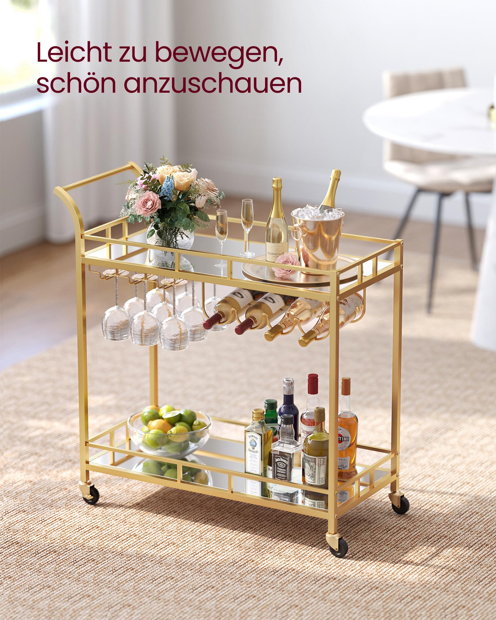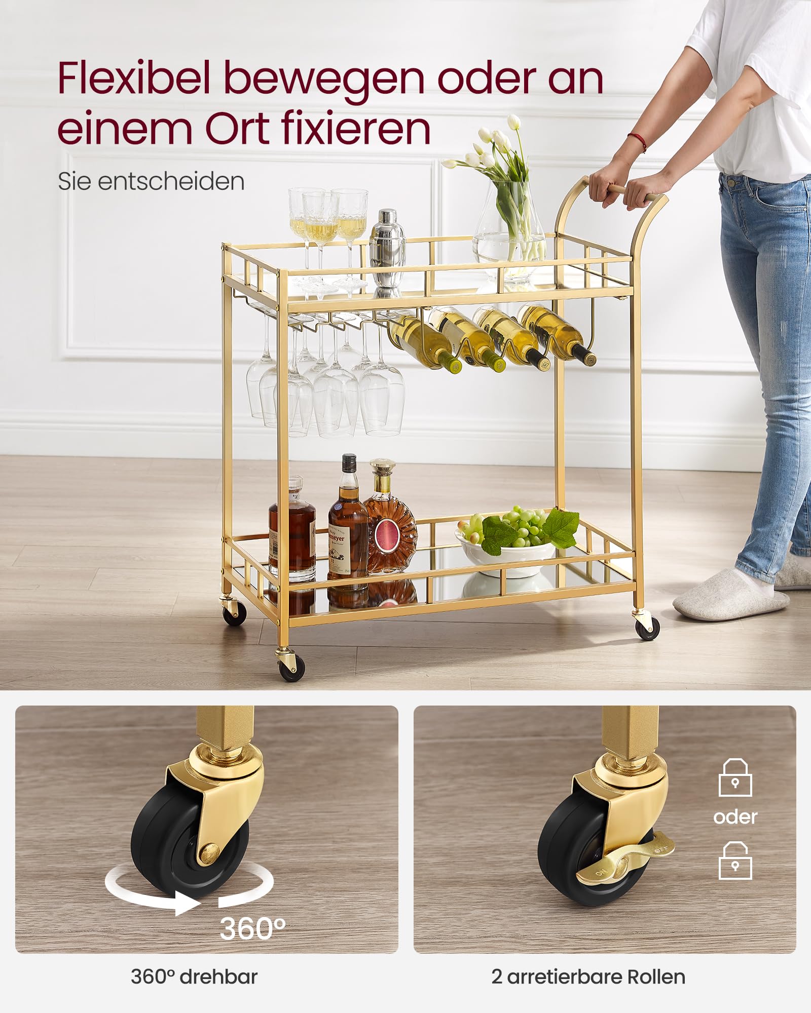 VASAGLE serving cart, rolling cart, glass holder, 2 mirrored glass shelves, bar cart, wine cart, for kitchen, dining room, bar, gold color LRC090A03