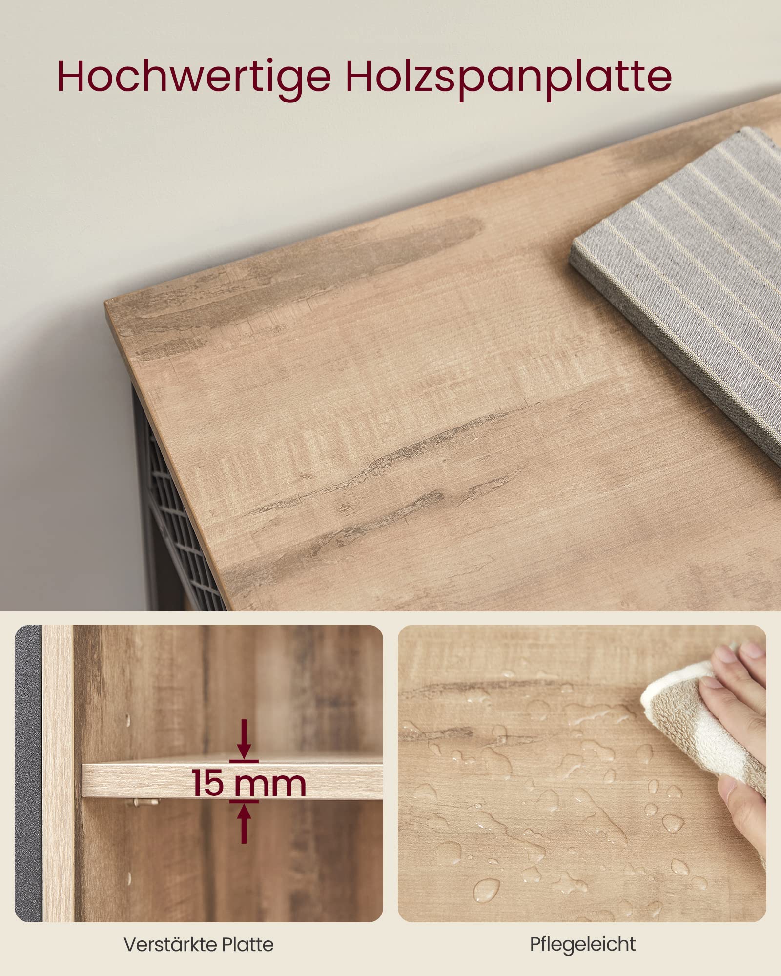 [Robust and stable] The combination of wood chipboard and high-quality metal frame gives the sideboard a high stability and strength. The adjustable feet keep the cabinet balanced; the anti-tip protection provides additional stability.