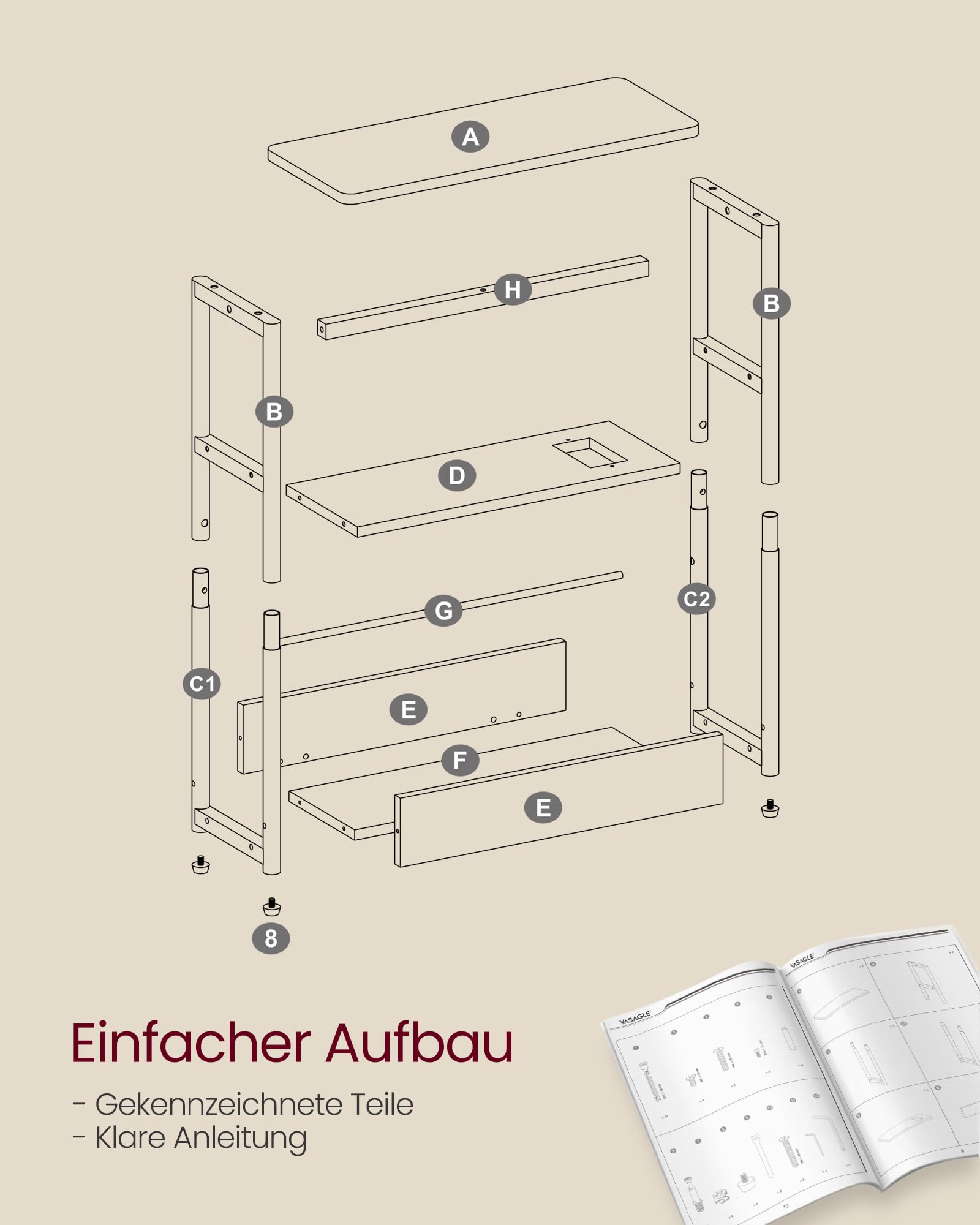 ["For small spaces] With dimensions of 18 x 45 x 58 cm, you can easily place this narrow 3-tier nightstand in a tight space, such as next to your sofa or bed, maximizing limited space","[Built-in charging station] Featuring 1 AC outlet and 2 USB ports, this slim side table allows you to charge your phone, tablet, and other devices simultaneously. With a 2m cable, you can place the table flexibly","[Versatile storage space] Whether as a magazine rack for your reading material or a side table for your daily essentials, this multifunctional coffee table with 3 shelves fulfills all your needs","[Strong and reliable] With its sturdy steel frame and high-quality wood particle boards, this side table can support up to 100kg and provides a stable hold for your daily items","[Quick and easy assembly] With labeled parts and clear instructions, assembling the nightstand is a breeze. In just a few minutes, you can enjoy this practical and stylish coffee table"]