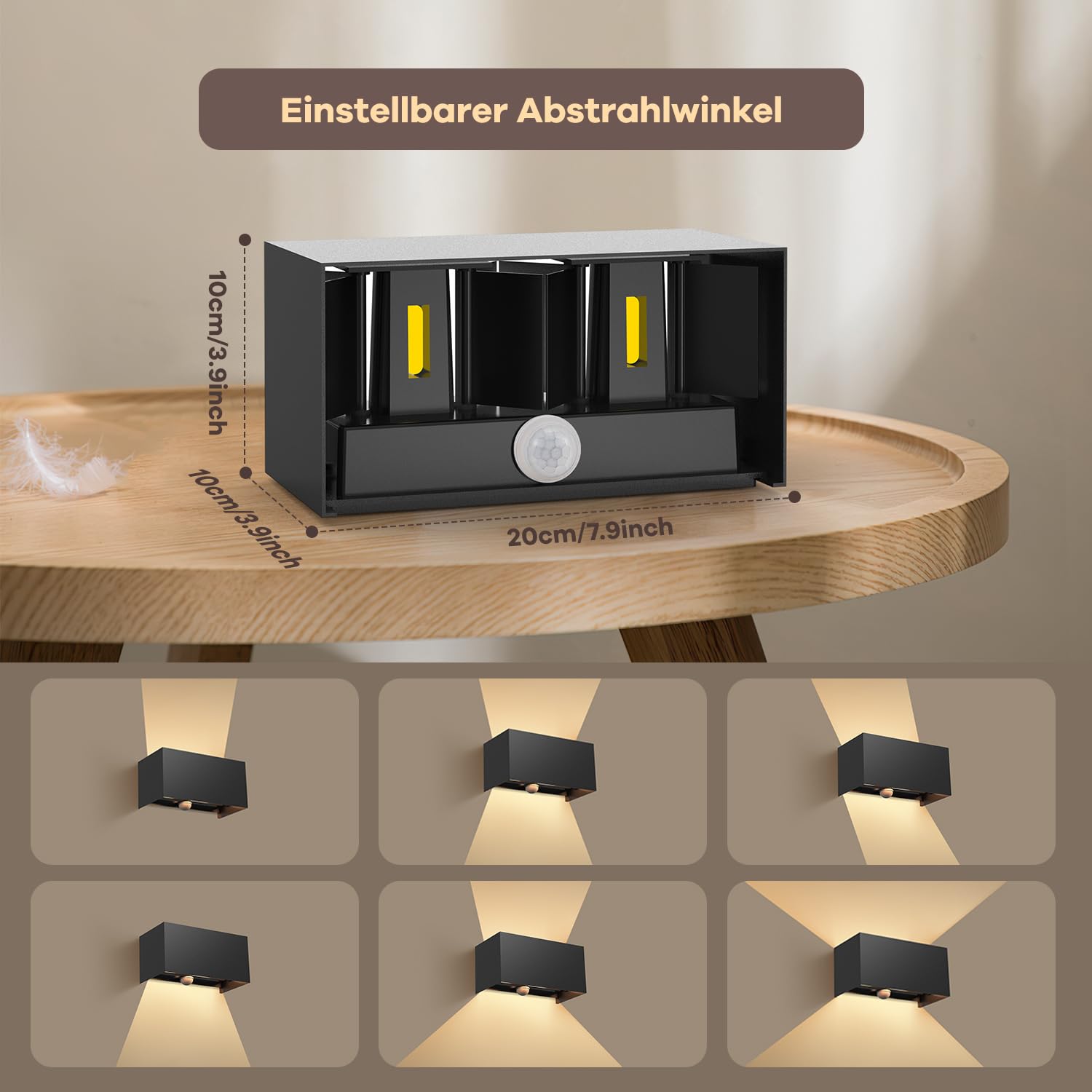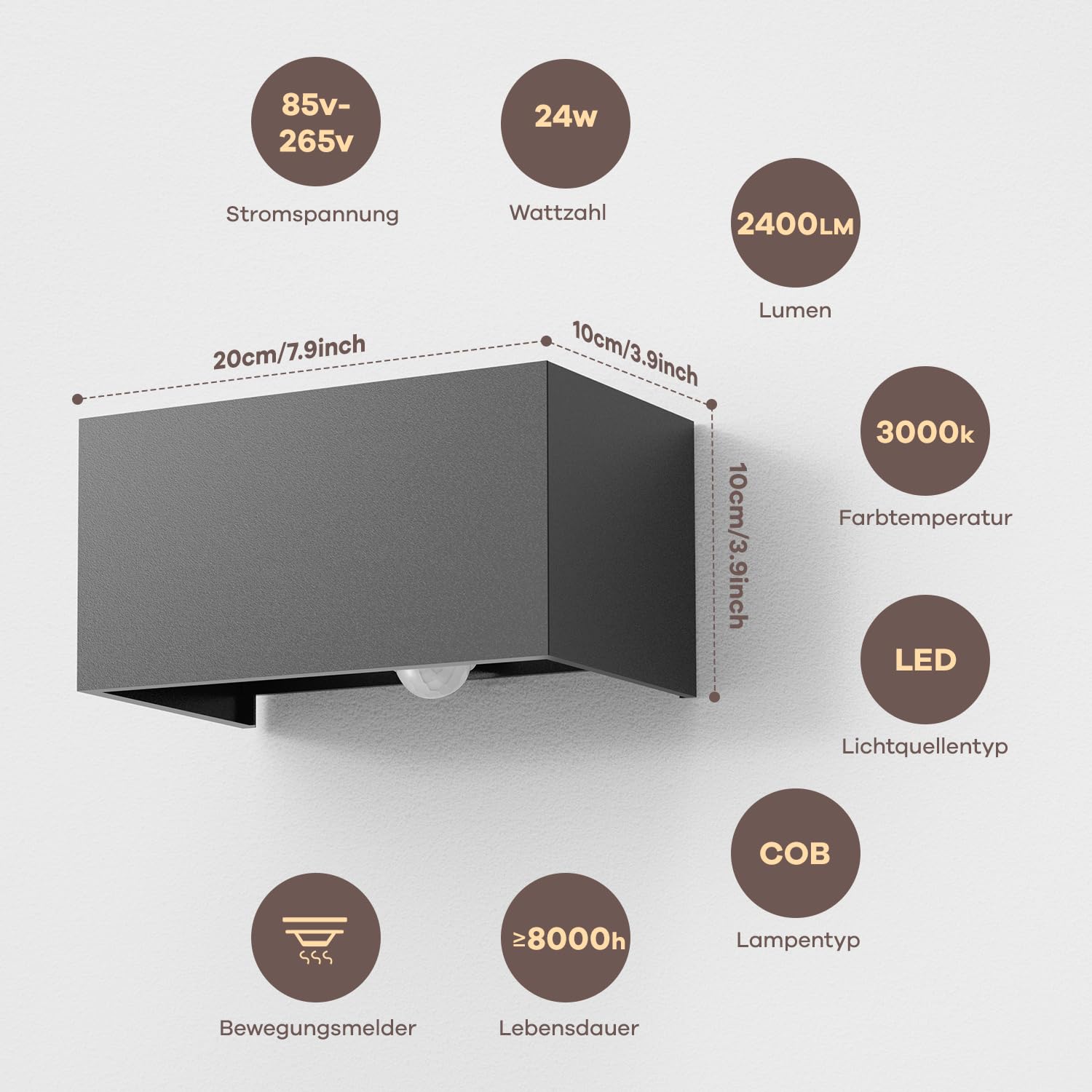 Vatato 24W outdoor wall light with motion sensor, IP65, 3000K warm white LED outdoor/indoor aluminum wall light, adjustable light beam outdoor lamp with motion sensor for hallway/pathway, black