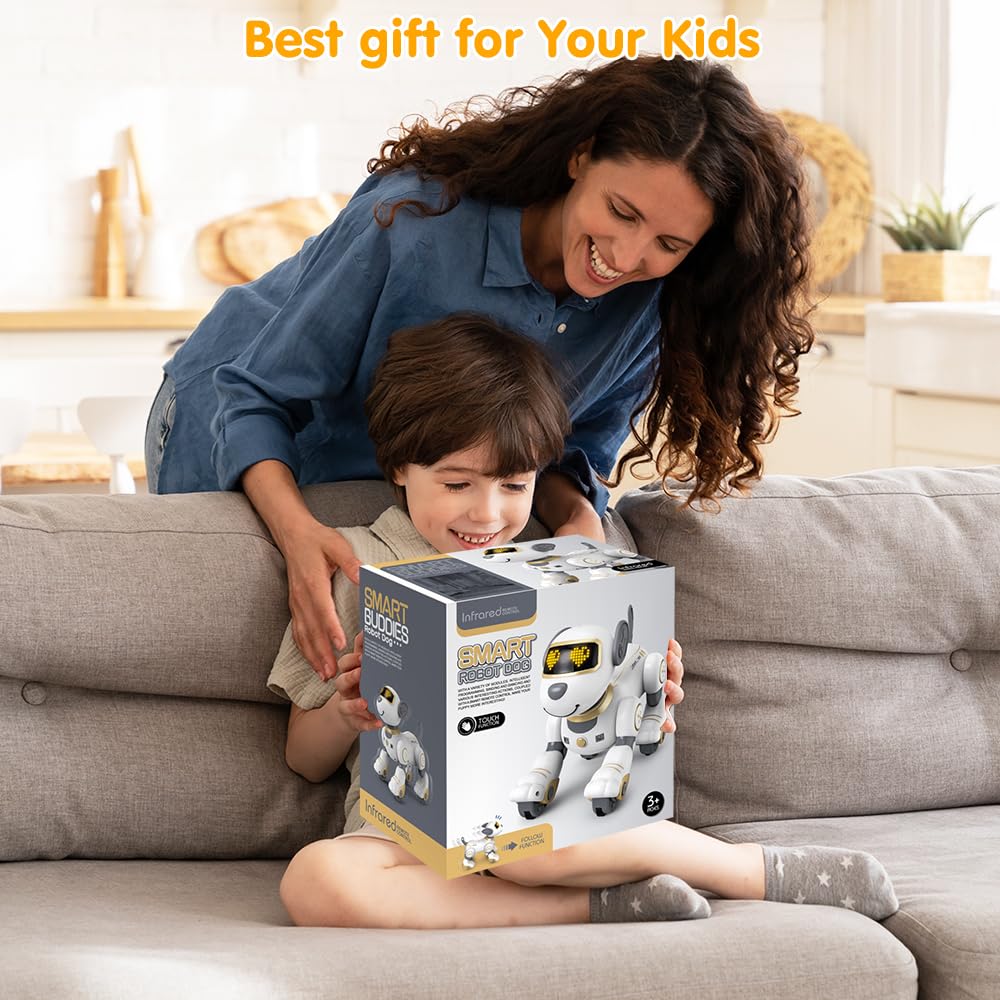 ["Interactive Robot Dog Toy for Girls - A total of 17 functions for kids to have more fun! No need to press a button after turning on, the toy robot dog will automatically perform a series of movements to capture your attention every 5 seconds, just like a real dog!", "Touch & Follow New Technology - When kids touch the chin of the robot toy dog, it triggers random actions and sounds that will entertain your child for hours. And the robot dog is equipped with three infrared sensors that can automatically seek and track the infrared signal of the remote control. Choose this robot dog to accompany your kids and have a fun time.", "Musical Dancing Dog - With built-in music and dance movements, this intelligent robot dog for girls encourages children to dance with it, letting your kids feel the rhythm of the music. It will be the best gift toy for girls aged 3+ 4 5 6 7-12.", "Programmable Intelligent RC Robot Toy Dog - You can program and customize your intelligent robot dog to behave like a real puppy, then the robot dog will take and execute commands. It will help children learn simple programming thinking and simplify complex problems.", "Best Gift Kids Toy for Children - Want your kids to enjoy the joy of having a pet without actually owning a dog? The cute interactive robot dog is a great gift for your child that can entertain the whole family and create unforgettable moments! The walking puppy is equipped with rechargeable batteries, so your robot dog can keep up with the child's energy."]
