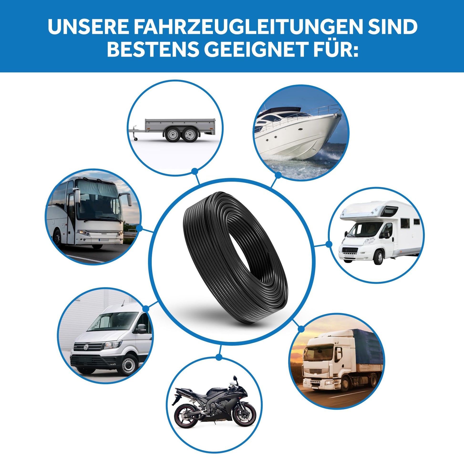 ["High-quality two-core vehicle cable red/black.","Suitable for use as vehicle cable, trailer cable, or caravan cable.","Often used for car, automobile, motor vehicle, motorcycle, moped, scooter, quad, truck, bus, excavator, tractor, ship, jetski, caravan, SUV, boat, or camper van.","FLRyy with reduced wall thickness for space-saving installation.","Ecu electrolytic copper conductor Voltage: 6-24 volts Sheath: PVC black Conductor color: Black / Red"]