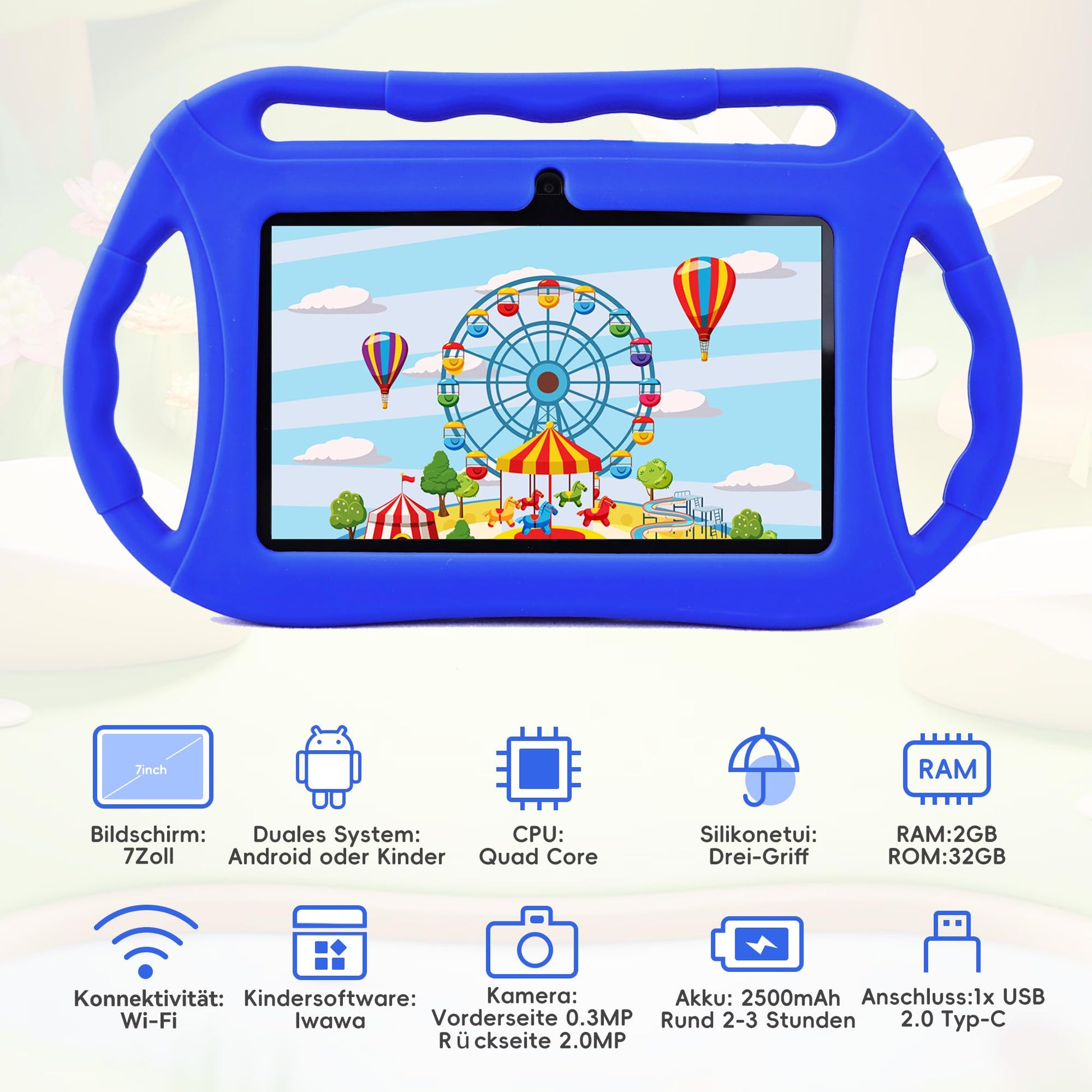 Veidoo Children's Tablet 7 Inch Android 32GB, WiFi, GMS, Dual Camera, Parental Control, Learning Educational Toddler Tablet with Silicone Case (Blue)
