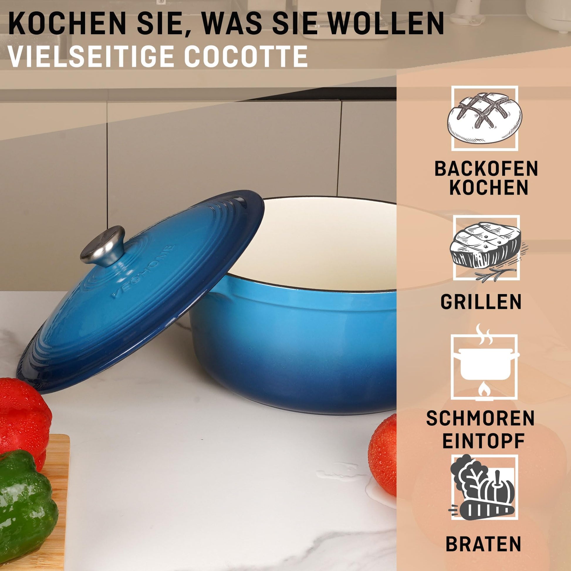 VeoHome Cast Iron Pot 6L | Roaster | Cast Iron Pot Blue - Braising Pot | Roasting Pot | Frypan | Cooking pot| Stews or roast dishes Stew, Bread baking | Dutch Oven | Oven safe | Enamel