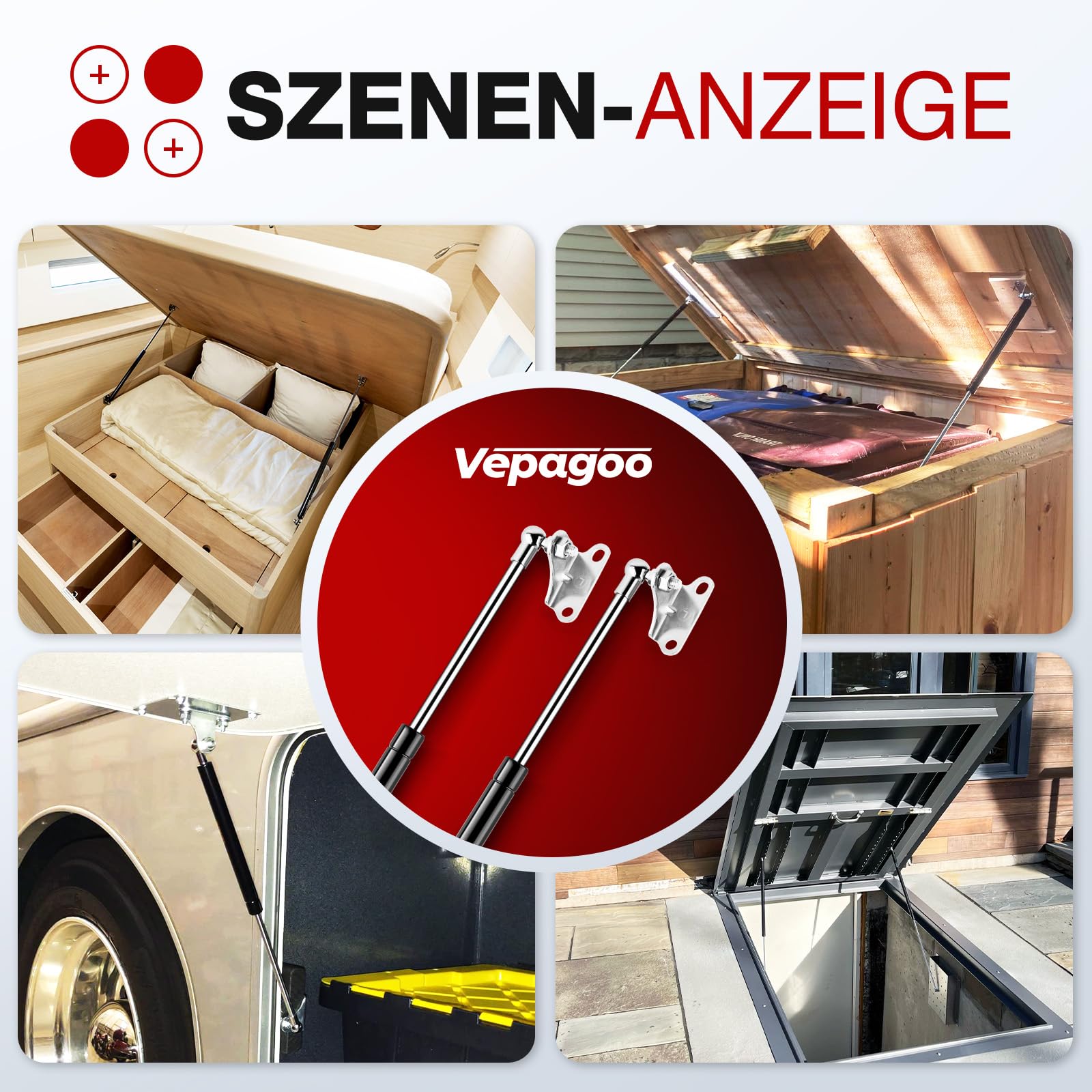 ["Gas Pressure Damper Specifications: Force: 1100N/110KG per gas pressure damper, a pair with 2 gas springs. Extended length: 500MM, Compressed length: 300MM. Ball joints diameter: 10mm. You will receive 2 gas springs, 4 L brackets, 4 nuts, 1 user manual","How to choose 500MM 450N/45KG Gas Springs: Suitable for heavy-duty lid width: 750mm ≤ lid width ≤ 1000mm, Suitable for heavy-duty lid weight: 880N ≤ lid weight ≤ 1430N, please choose your strut carefully, otherwise it may not be compressed or extended","Universal Gas Spring Wide Range of Application Scenarios: Suitable for storing queen size beds in RVs, heavy-duty applications, truck bed covers, marine projects, RV ramps, RV beds, basement doors, hatch covers, boat hatch covers, bar windows","Tips: If you feel it is too powerful to close and you have a lot of flexibility in where they can mount, you can move the mount point on the lid towards the hinges' direction","Customer Support by vepagoo: 12 + 1 months of quality support! For any issues, simply contact us through Amazon, and we will solve the problem within 24 hours"]