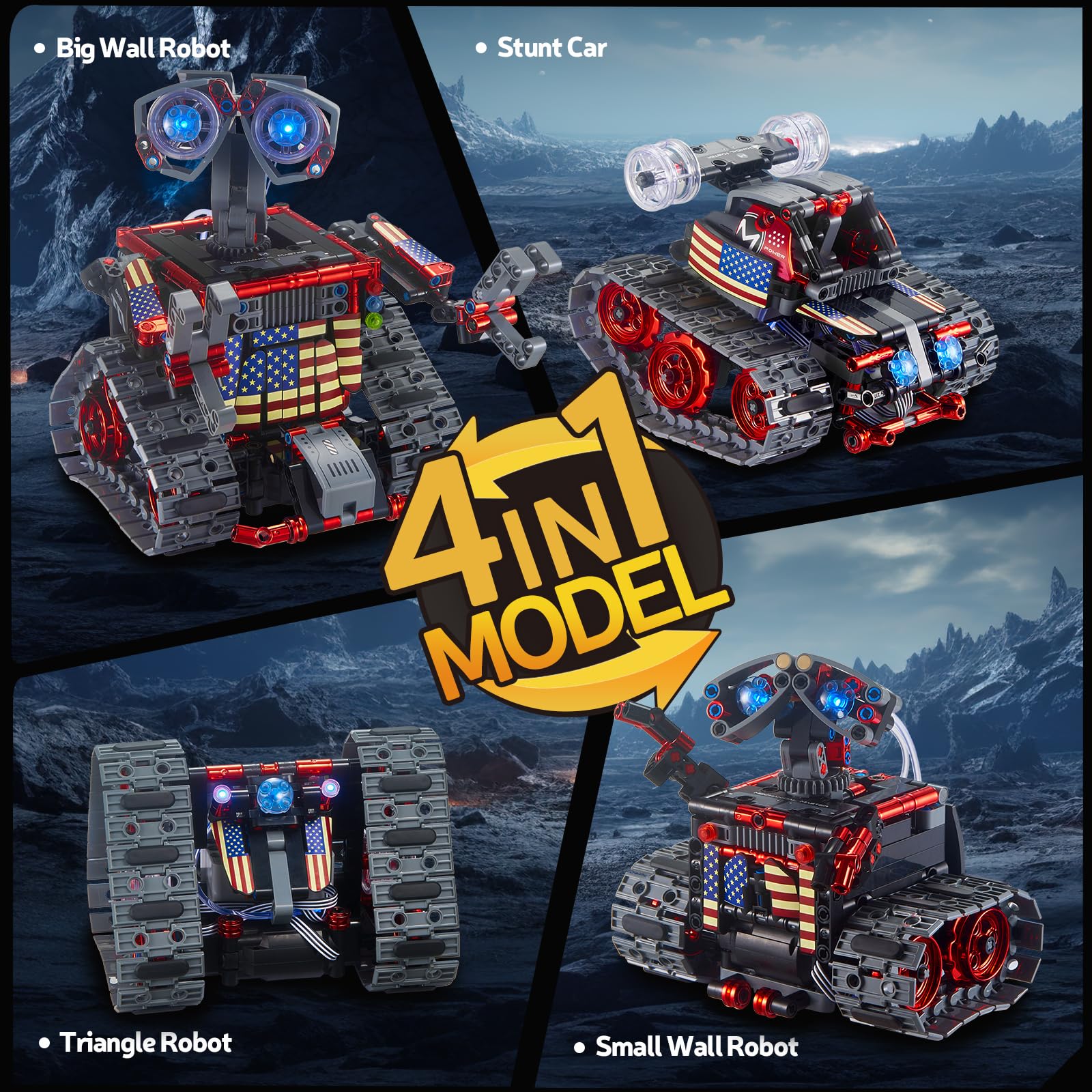 ["🤖【4-In-1 Robot Building Kit】The VEPOWER programmable robot building toy includes 564 blocks. Kids can assemble 4 different types of robot toys according to their preferences: big wall robot, small wall robot, stunt car, and triangle robot. With four different building experiences, kids can unleash their creativity and imagination to build their own robots!","🎮【Remote Control & APP Control】The robot toy can move forward, backward, left, right, and rotate 360° via remote control or app. It offers various gameplay options through the app, such as 3-speed remote control mode, path mode, driving mode, gravity mode, and STEM programming mode. From simple movements to advanced tasks, the STEM robot can handle it all and bring more fun (Note: Remote control requires 2 AAA batteries - not included).","🌟【Cool Appearance】The high-quality red and gray color scheme with a unique galvanizing process showcases the high-tech texture. The eyes and transparent tube of the tech robot can light up, and the light changes with the direction of the remote control. Easy-to-turn head, adjustable arms, gripping claws, foldable storage compartment - every detail is worth discovering! Plus, the improved non-slip rail makes the game even more flexible for endless fun.","🔋【USB Rechargeable Design】This 4-in-1 MINT construction toy features a high-torque dual motor for increased power. The USB rechargeable design also enhances the durability and stability of the robot. Simply connect it to a power bank or computer and never worry about running out of batteries. Enjoy fun and creativity for a longer period!","🎁【Perfect Gift for Kids】Whether you're looking for a unique gift or want to provide your kids with a fun MINT learning experience, this robot is an ideal choice. With easy-to-understand, colorful building instructions and decorative stickers, kids can build their own robots to promote creativity and exploration, and develop their problem-solving and programming skills. A perfect MINT project for kids aged 6 to 12 years."]