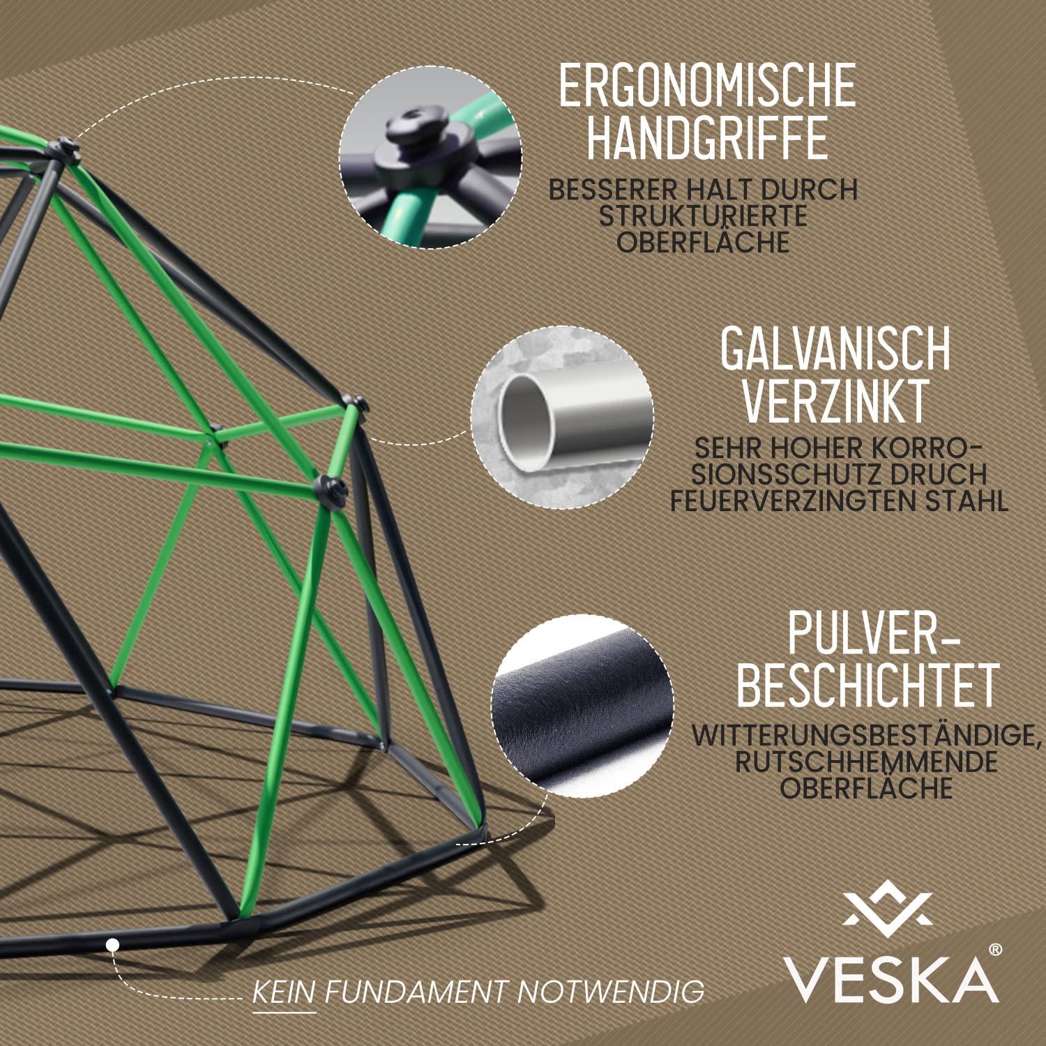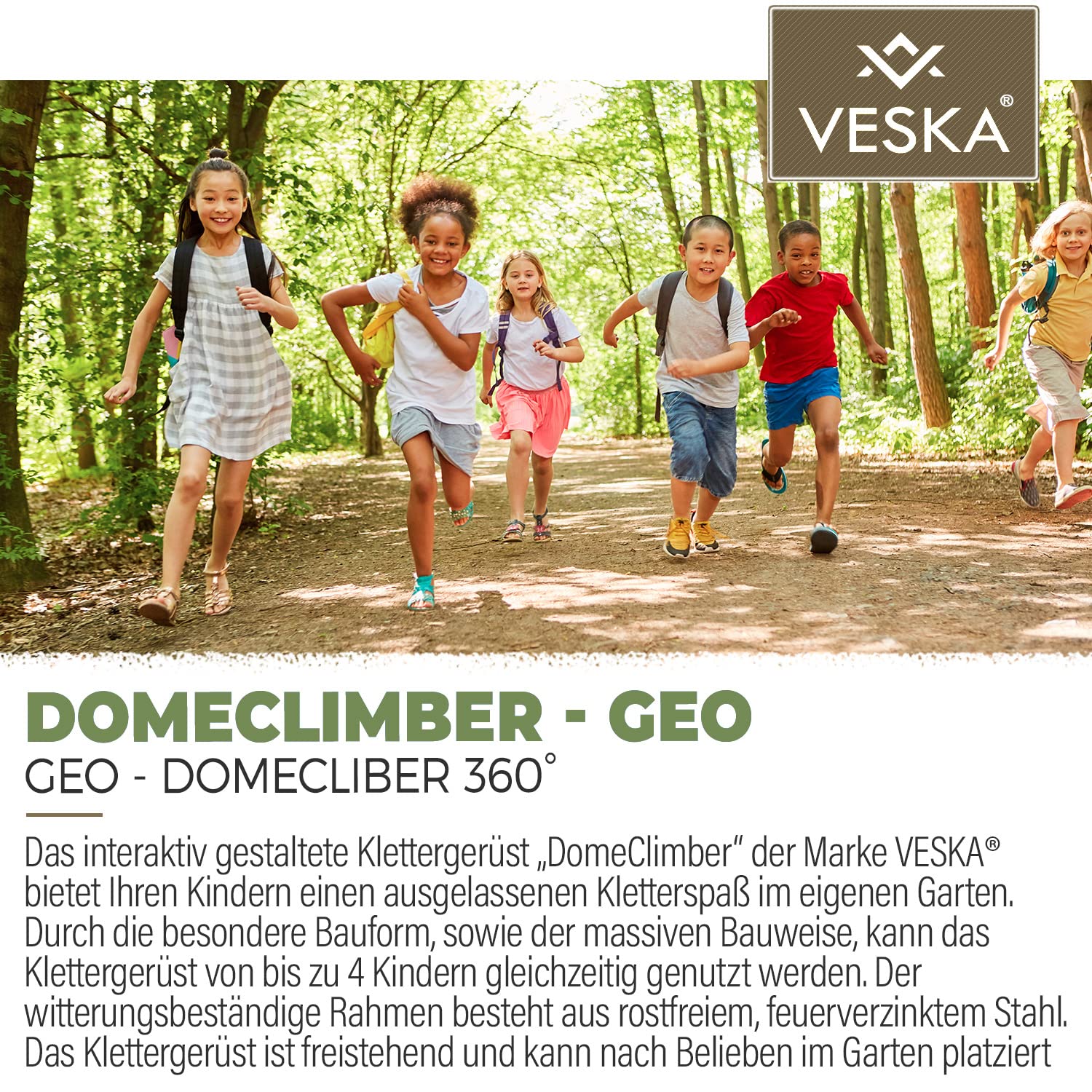 "The interactive designed climbing frame 'DomeClimber' by the brand VESKA offers your children a lively climbing fun in their own garden. Due to its special design and solid construction, the climbing frame can be used by up to 4 children at the same time.