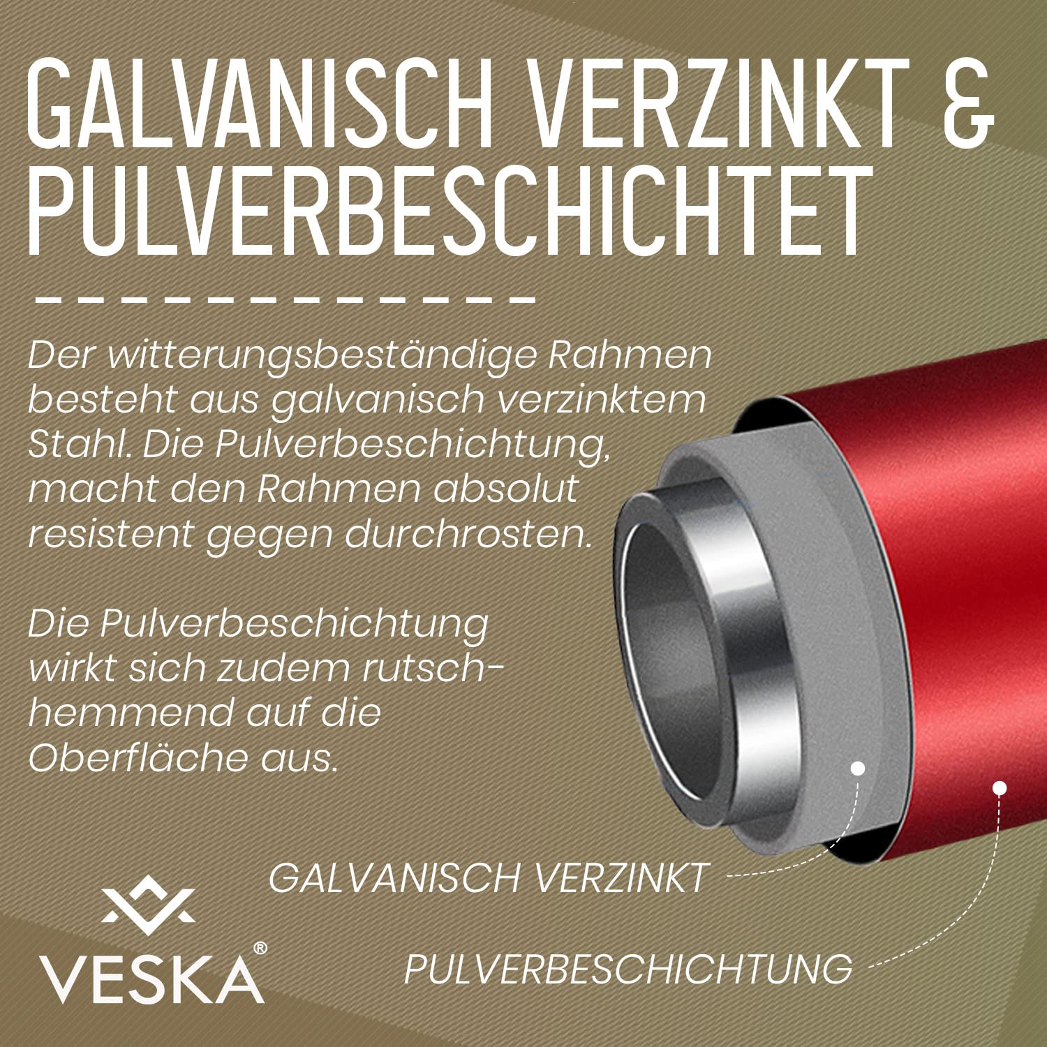 The weather-resistant frame is made of stainless, hot-dip galvanized steel. Thanks to the additional powder coating, the climbing frame can remain set up throughout the year and does not need to be dismantled for the winter. Additionally, the bars are more grippy due to the powder coating.