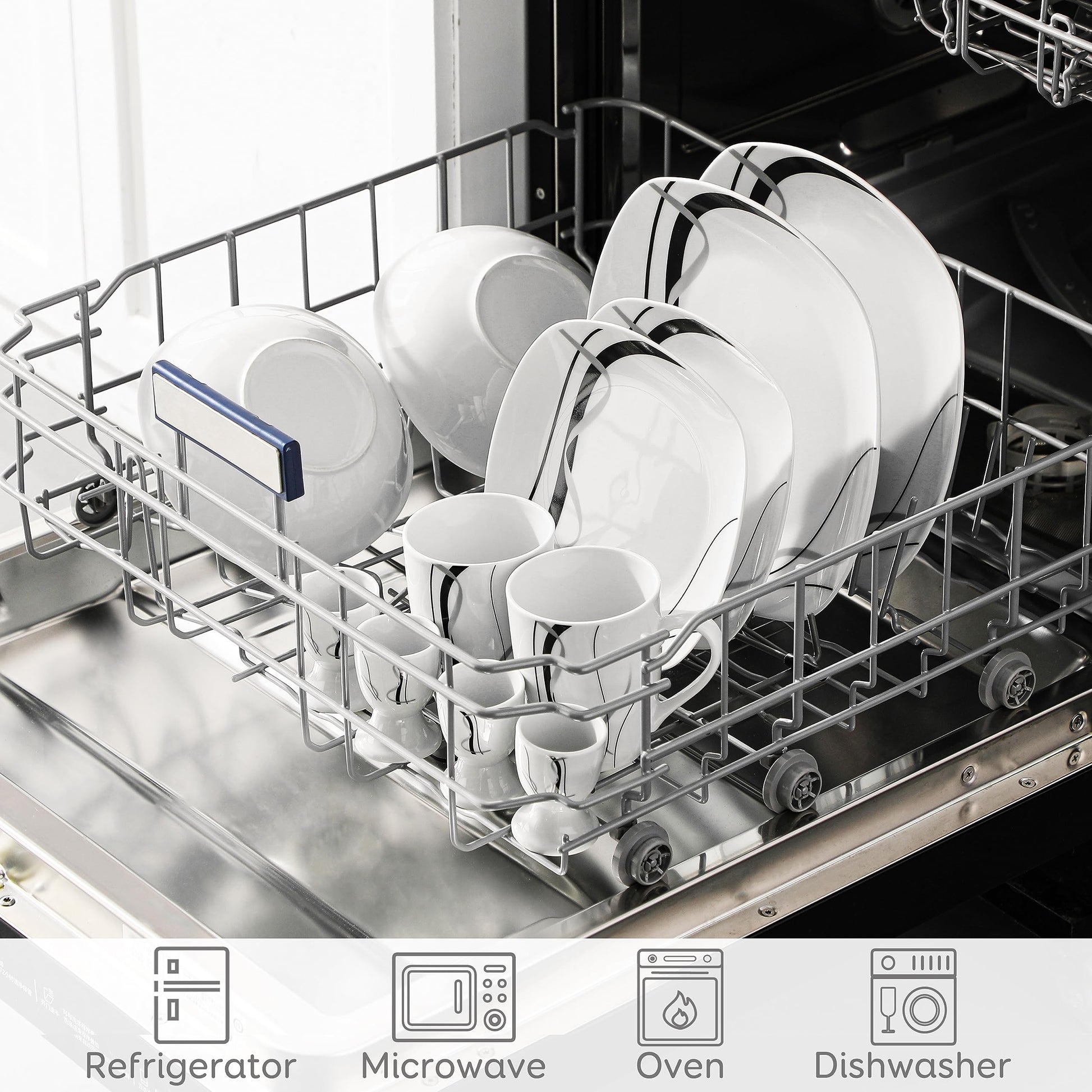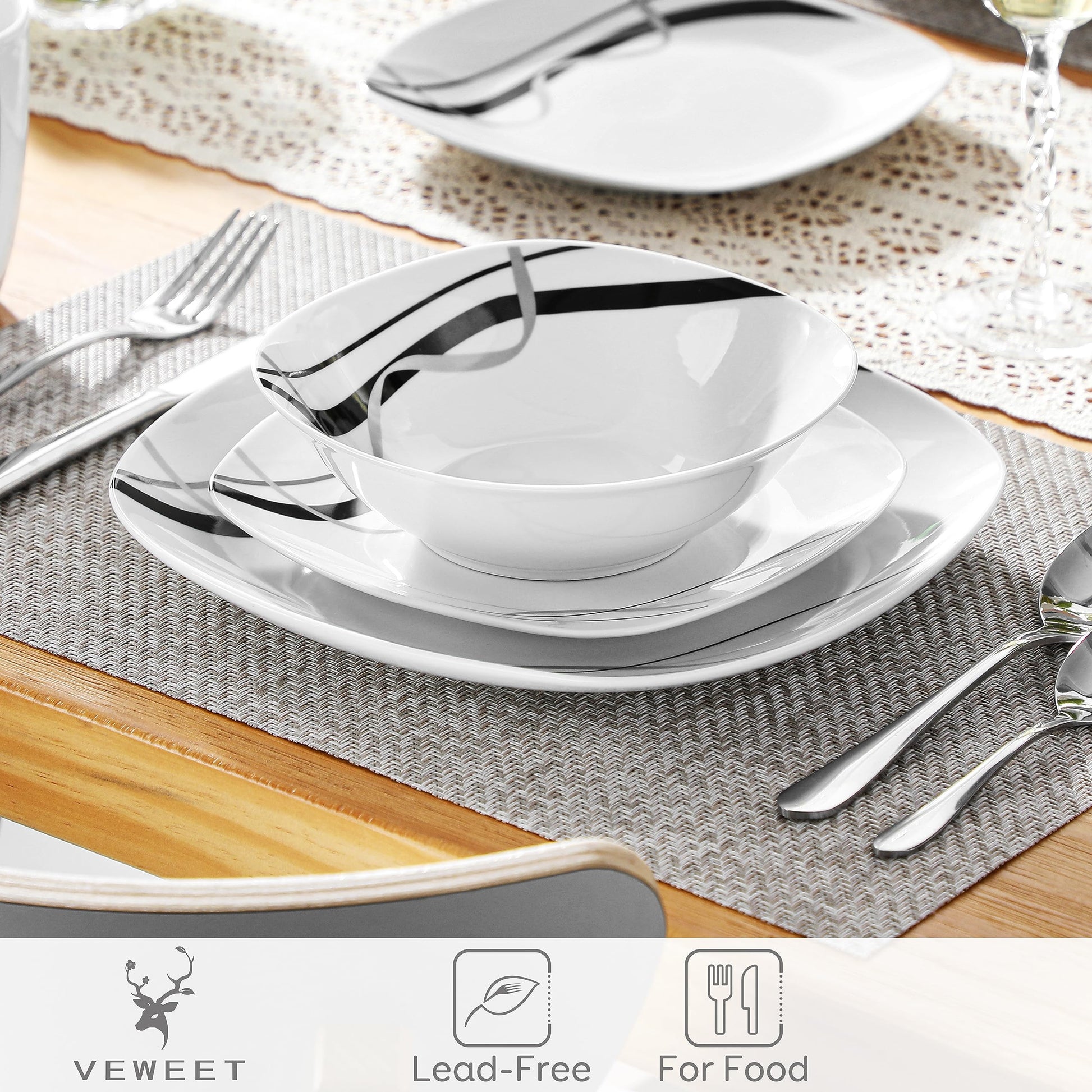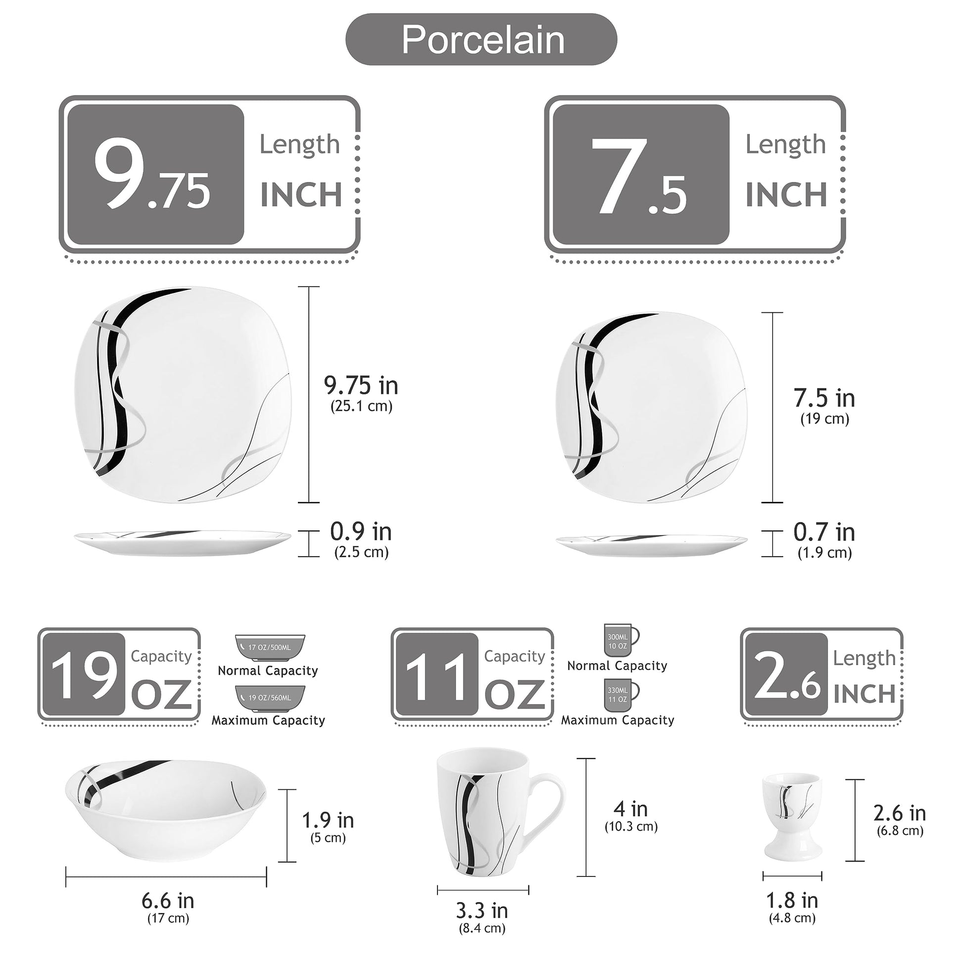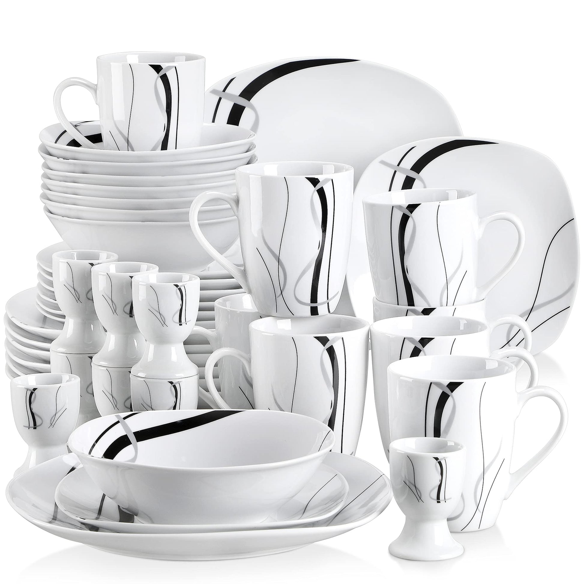 ["Comprehensive dinnerware set: The Fiona series includes 40 pieces made of porcelain and is suitable for 4 to 12 people. The set includes 8 x 9.9" dinner plates, 8 x 7.5" dessert plates, 8 x 6.7" cereal bowls, 8 x 4.1H" coffee cups, and 8 x 2.7H" egg cups, to meet diverse needs from appetizers to desserts","Stylish porcelain design: This dinnerware is made of high-quality porcelain and decorated with a design of black, gray, and white lines, giving a simple and modern look to your table, adding elegance and style","Durable and easy to care for: The Fiona tableware is microwave, oven, freezer, and dishwasher safe. The high-quality glaze prevents food from sticking, making cleaning easy, and the sturdy material ensures that the dinnerware remains undamaged even with frequent use, preserving its beauty long-term","Space-saving stackable design: Each piece of this dinnerware set stacks easily, saving space in the cupboard. This is especially ideal for households with limited storage space, ensuring a tidy kitchen","Versatile uses: Whether for everyday family meals, gatherings with friends, or formal dinner parties, the Fiona series handles any situation with ease. Its versatility and elegant design make it a standout on any table, adding a special touch to every meal","Wide selection and flexible purchase options: The VEWEET brand offers a variety of dinnerware sets to meet the needs of different households. Each piece of the Fiona series can also be purchased individually, allowing you to mix and match your tableware according to your personal preferences and needs"]