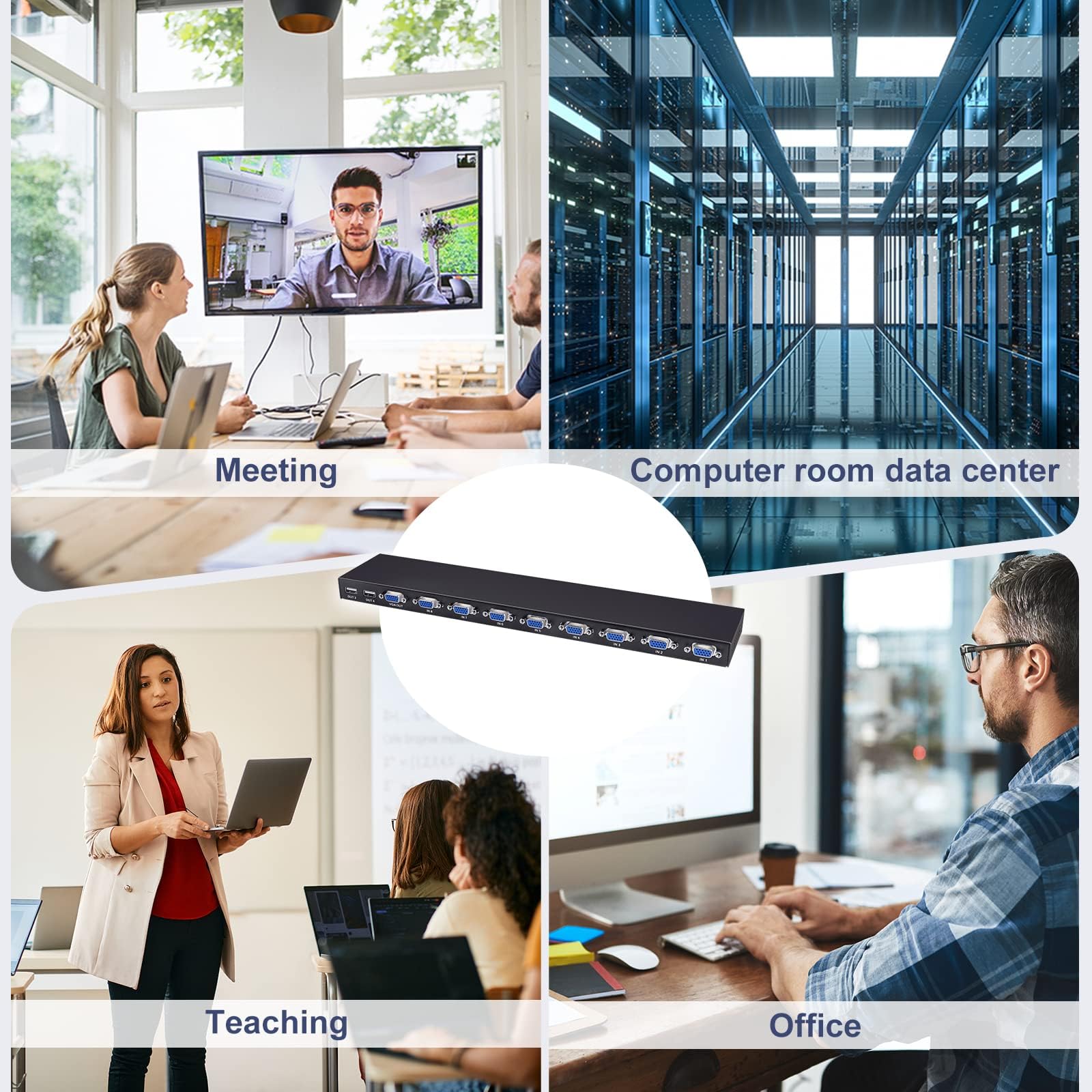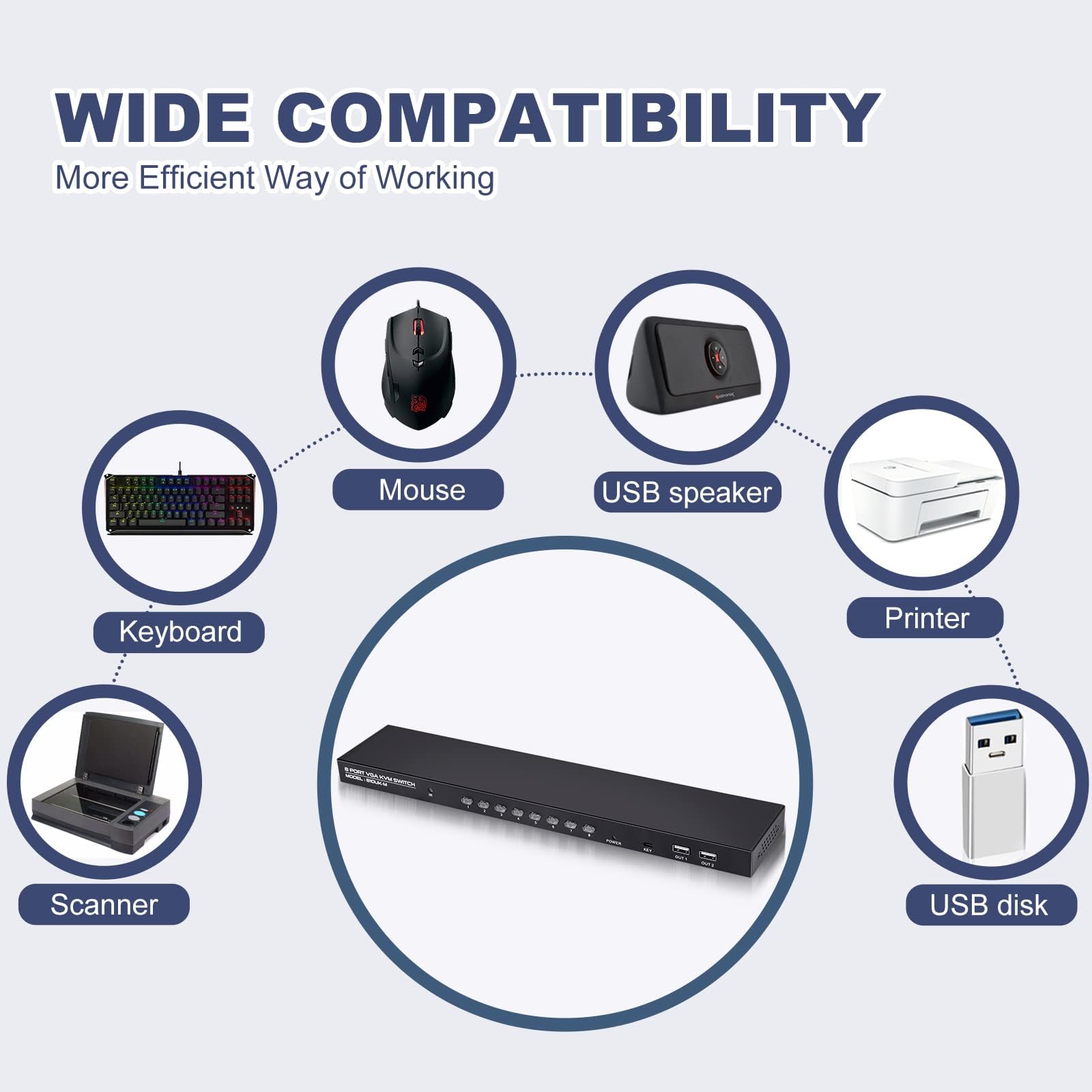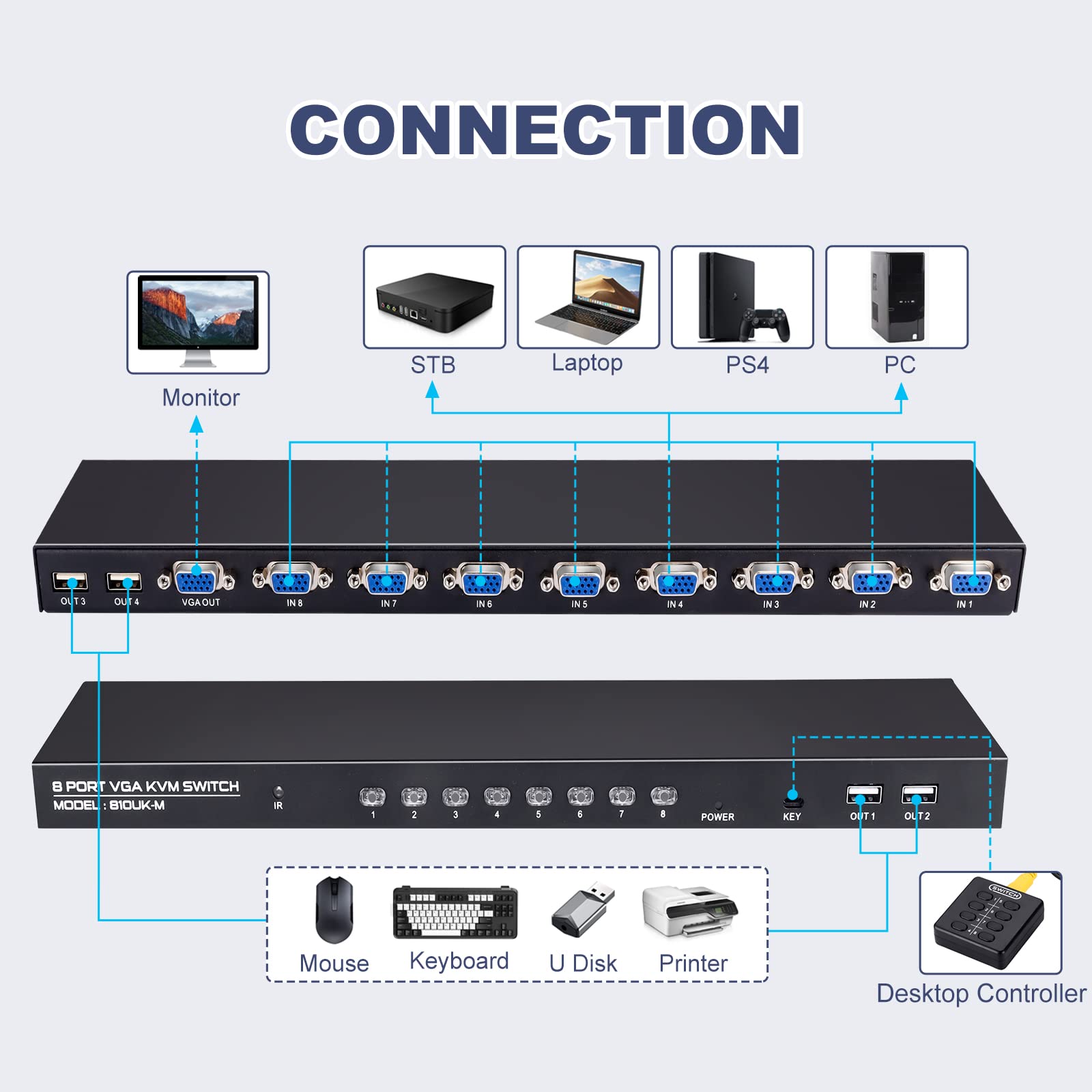 ["8 Ports VGA KVM Switch: This KVM Switch allows control of up to 8 computers with 1 monitor and 4 USB 2.0 devices, such as keyboard, mouse, printer, scanner, etc.","High Resolution: Supports 1920*1440, you can enjoy a very clear HD image, also supports other resolutions, such as: 1280x720px, 640x480px, 800x600px. Support for DDC and high-quality automatic identification.","3 Switching Modes: KVM switch offers a variety of switching options for different displays and supports front buttons, IR remote controls, and wired desktop controllers to control the VGA KVM switch.","Wide Compatibility: Compatible with Windows 10/8/7/XP/Vista, Mac OS, Linux, DOS, and other operating systems. It is widely used for work, video conferences, teaching, meetings, etc.","8 KVM cables included: VGA and USB cables are 2 in 1, USB port can be used for data transfer and power supply. Please connect both VGA and USB ports to your computer when using this product."]