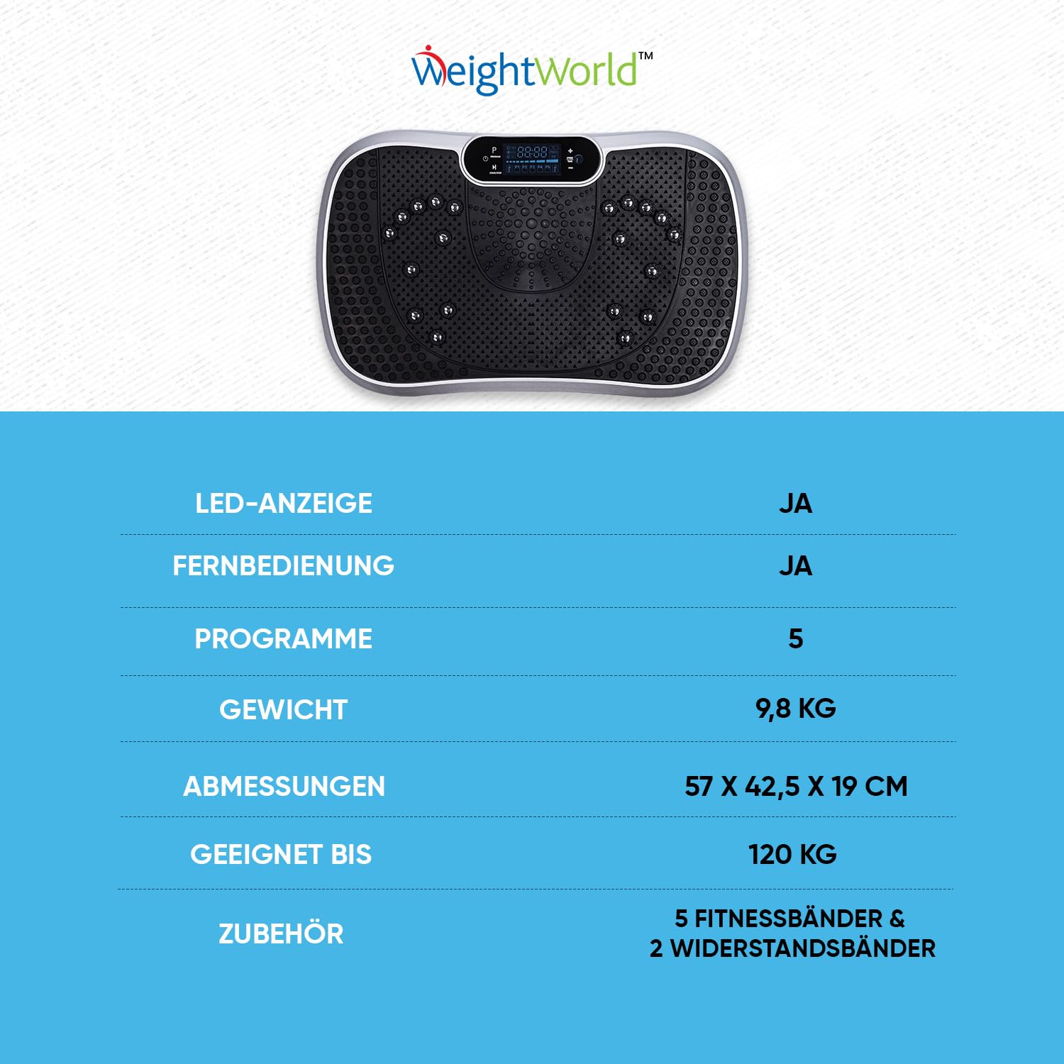 ["Weightworld Vibration Plate - The vibration plate has a frequency of 50 to 60 Hz. This fitness equipment has a weight limit of 120kg.","99 Intensity levels & 5 Training function modes - The fitness device features 99 intensity levels and 5 programs for a customizable home workout. It also includes 5 extra fitness bands, EU and UK plugs, and a pair of resistance bands.","Home Workout Equipment - For a comprehensive training experience conveniently from home. With multiple training modes and an easy-to-read LED display, progress can be tracked and fitness program can be adjusted to suit needs.","Fitness & Sports Equipment - WeightWorld Vibration Plate weighs 7.5 kg and requires minimal space. It also comes with a remote control and LED display. With built-in Bluetooth speakers, favorite music can be enjoyed. Thanks to the non-slip foot surface, the plate offers optimal comfort during use. It has a slim and practical shape and is easy to store.","Discover WeightWorld - Born out of a passion for supplements, WeightWorld was established in 2006. Starting as a small brand, it continues to grow while maintaining attention to detail. With over 18 years of experience, the brand offers a wide range of supplements and devices. The focus is on developing products that evolve with needs while preserving core values."]