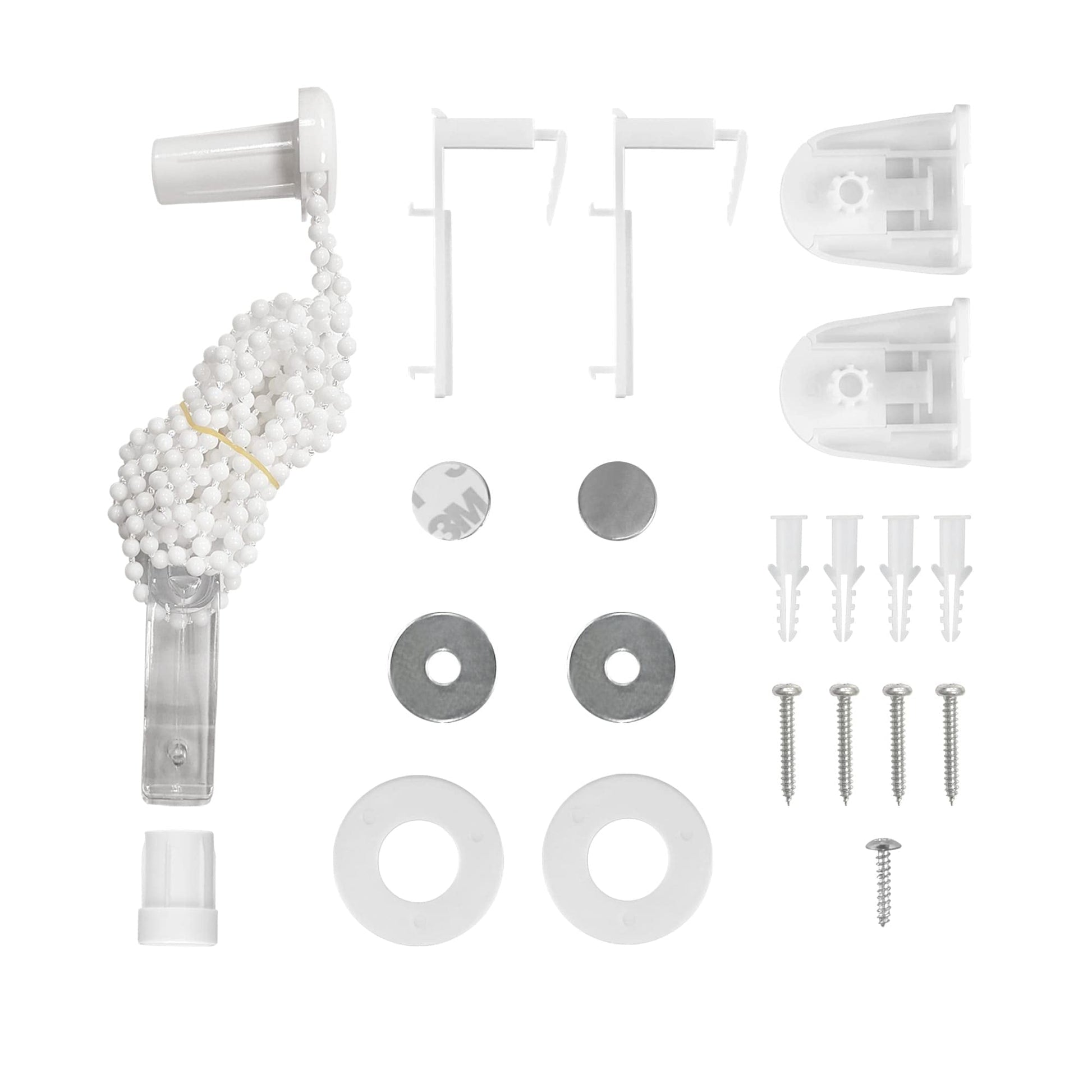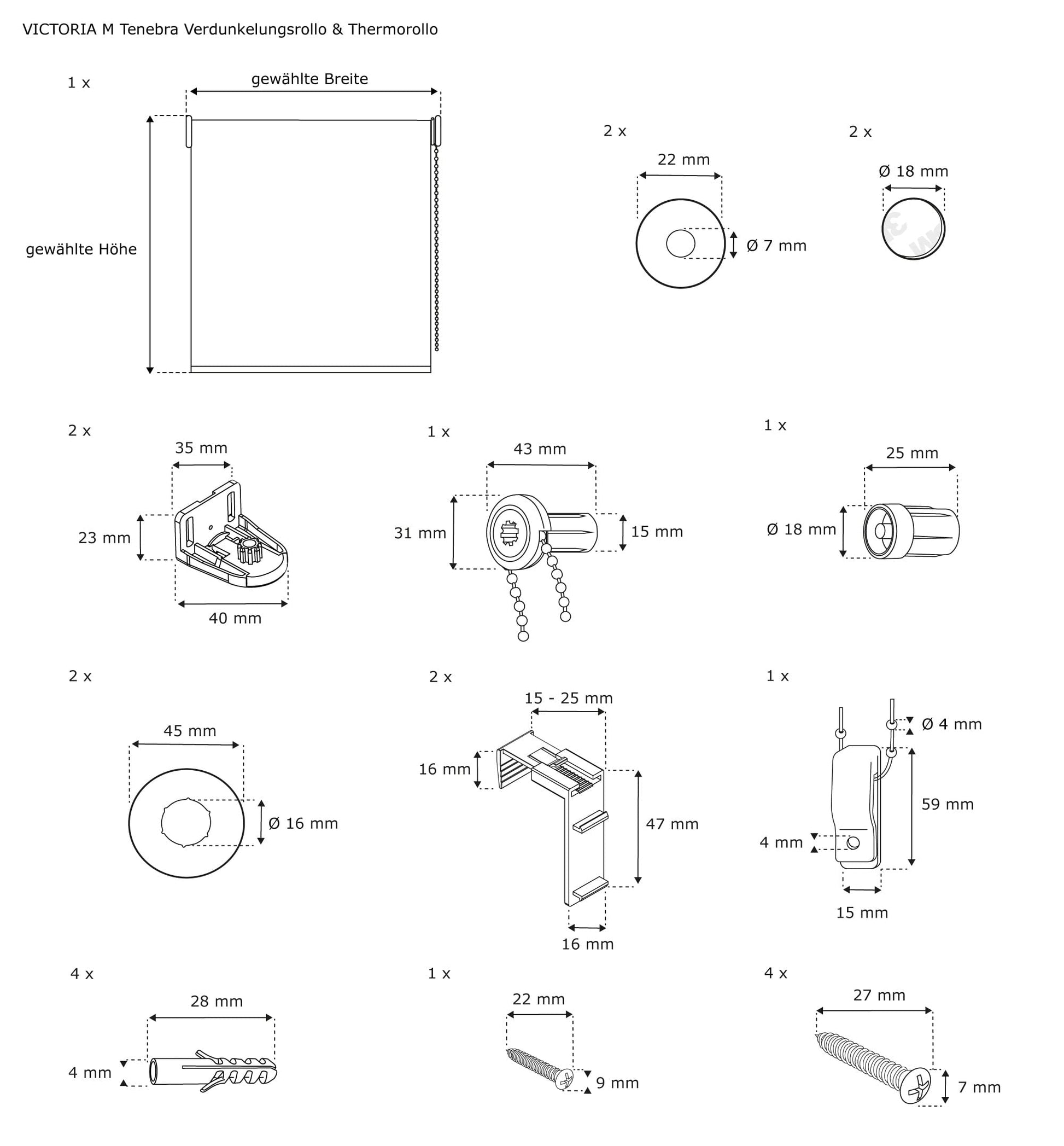 ["The Tenebra thermal roller blind is an effective privacy and sun protection for darkening rooms. It is available in different colors and sizes. Two magnets, attached at the bottom of the window frame and in the fabric hem, provide additional darkening and promote restful sleep.","The blackout thermal polyester fabric is coated with a silver lining, providing extra insulation and keeping the heat out in the summer. It retains warmth in the rooms during the winter.","The side chain mechanism of the roller blind is operated easily and precisely, allowing you to mount it on the left or right side as desired.","You can attach the blackout blind to the wall with screws or use clamp holders for installation without drilling. Mounting hardware is included (clamp holders for window frame thickness of 15-25 mm).","To increase the level of darkening, you can separately order a cassette and guide rails. Please note: The specified order measurement is the outer carrier measurement of the blind; the fabric measurement is approximately 4.1 cm narrower."]