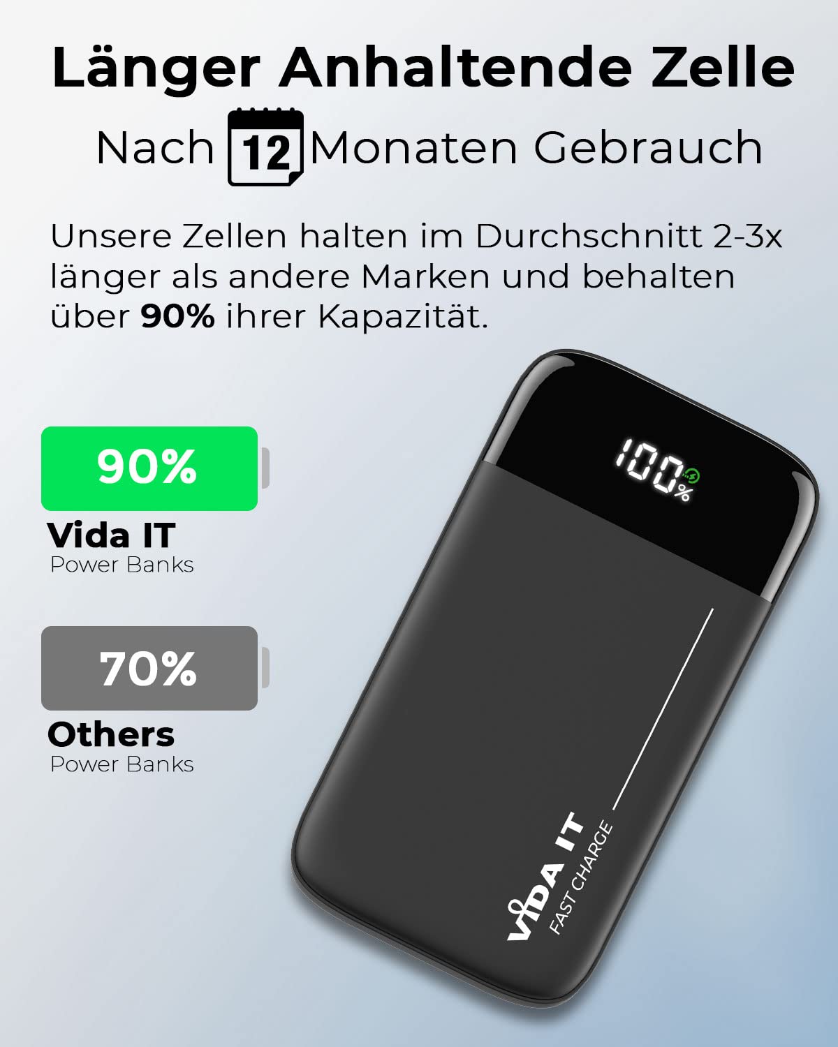 HIGH QUALITY: At Vida IT, we use only the highest quality UN 38.3 battery cells in our power banks, ensuring a long lifespan. Our battery cells last 2-3 times longer than others after multiple charges. Safe and suitable for all age groups - men, women, children, girls, and boys.",