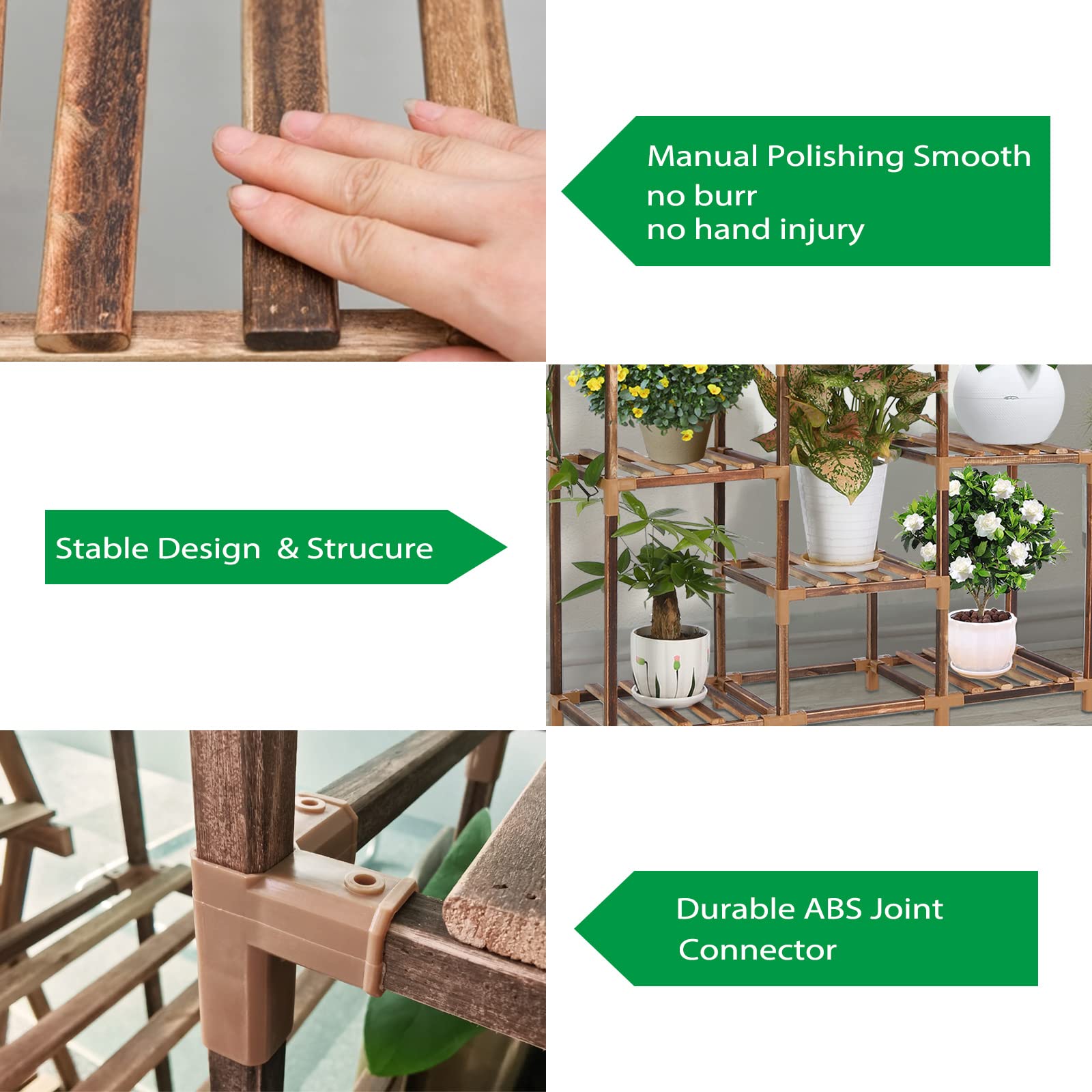 ["đčăPremium Wood Materială: The VIEWALL flower stand is made of high-quality wood material, after high-temperature carbonization treatment, the wood is stable, sun-proof, does not crack, and is not easily deformed.","đ»ăHealthy and Safe Plant Standă: The wood is clear and beautiful, no need for paint, no formaldehyde, safer. And since the scientific height of the plant stand makes it more stable, it is suitable for families with babies.","đŒăMultiple Usesă: The flower rack can place at least 7 potted plants, making your plants no longer messy. It can also store books, toys, shoes, decorations, etc. You can place this plant stand on balcony, corner, living room, garden, yard, patio, shop, etc.","đ”ăEasy to Assembleă: Our plant stand is connected by a high-quality ABS connector, it is durable, the triangular stability design makes the rack more stable. Before assembly, please watch the assembly video on the page, it will help you to quickly finish the plant stand. Or contact us through Amazon, we will help you solve it within 12 hours.","đčăPackage and After-Sales Serviceă: With the plant stand, you will receive 3 gardening tools (including a rake and two shovels), a pair of gloves, and a wooden hammer."]