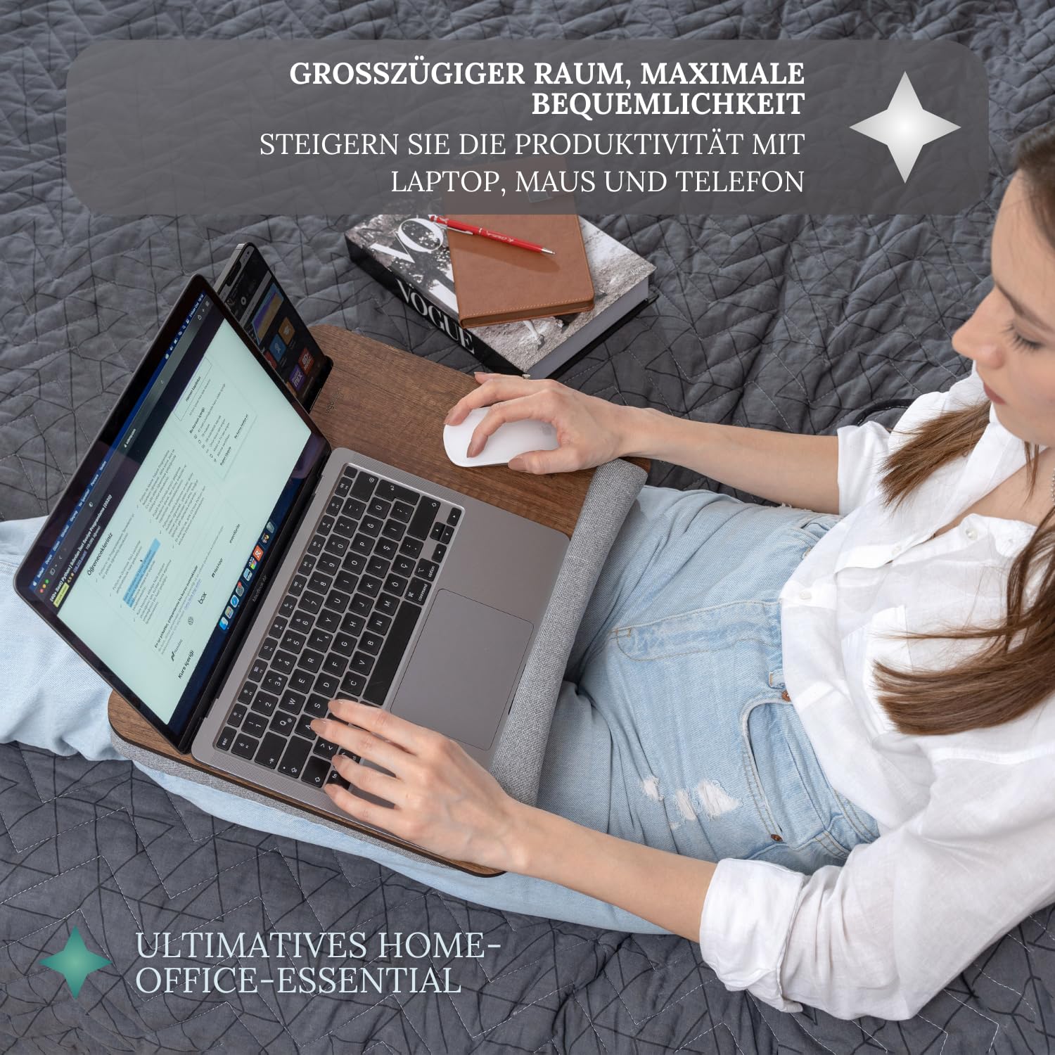 "📐 Large surface: Our laptop tray measures 43 cm x 33 cm (16.9" x 13") making it the perfect size for laptops up to 16 inches. 💻📱 The spacious surface provides enough space for your laptop, mouse, phone, tablet, and other accessories, allowing you to work or study comfortably."