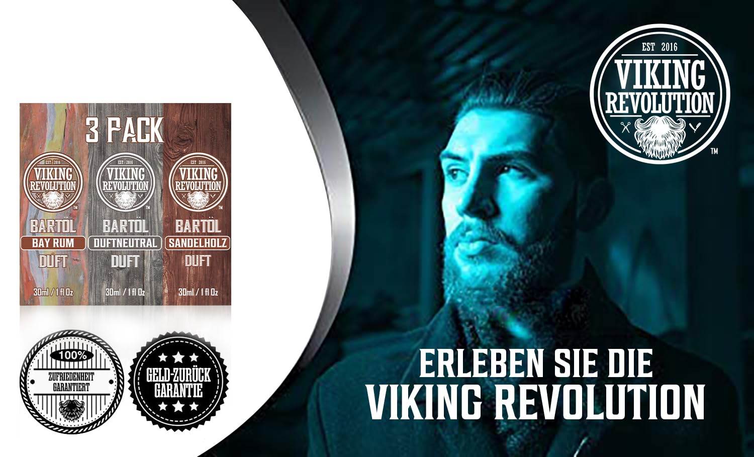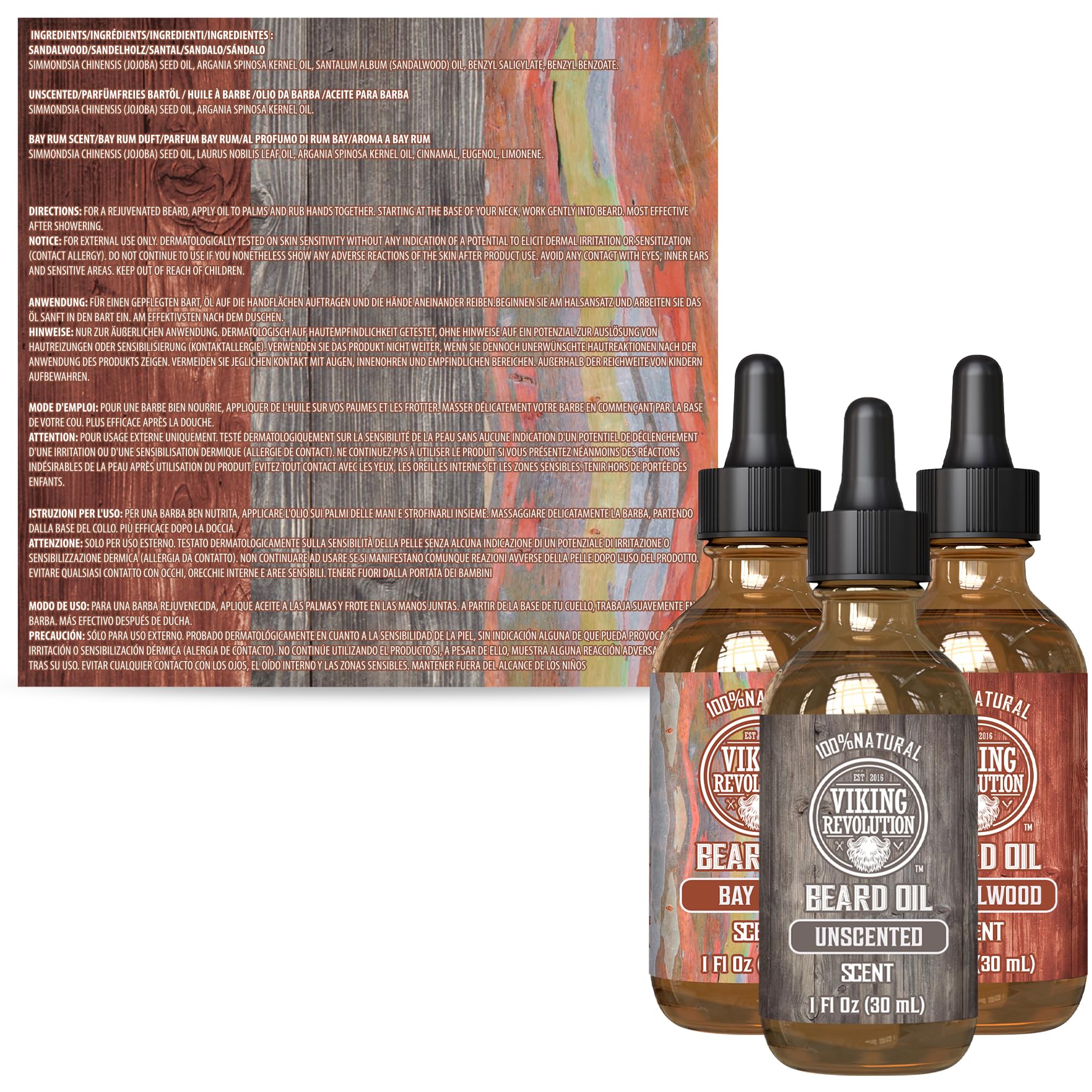 Viking Revolution - Beard Oil - Softens, Protects, and Strengthens - Made from All-Natural Bay Rum, Unscented & Sandalwood - Beard Oil for Men - Gifts for Men - Set 3 x 30 ml