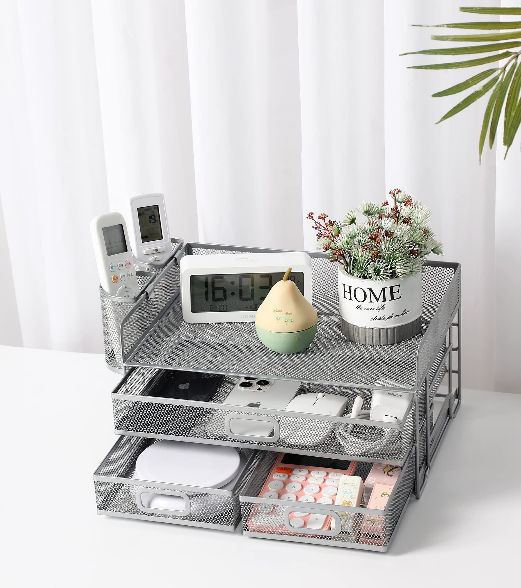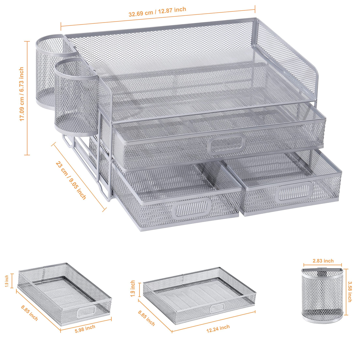 Vikmyer 3-Tray Desktop Organizer with Drawer, Mesh Office Desk Supplies Organizer Document Letter Tray Holder for Office Home (2 Pen Holders) Silver-3 Drawers