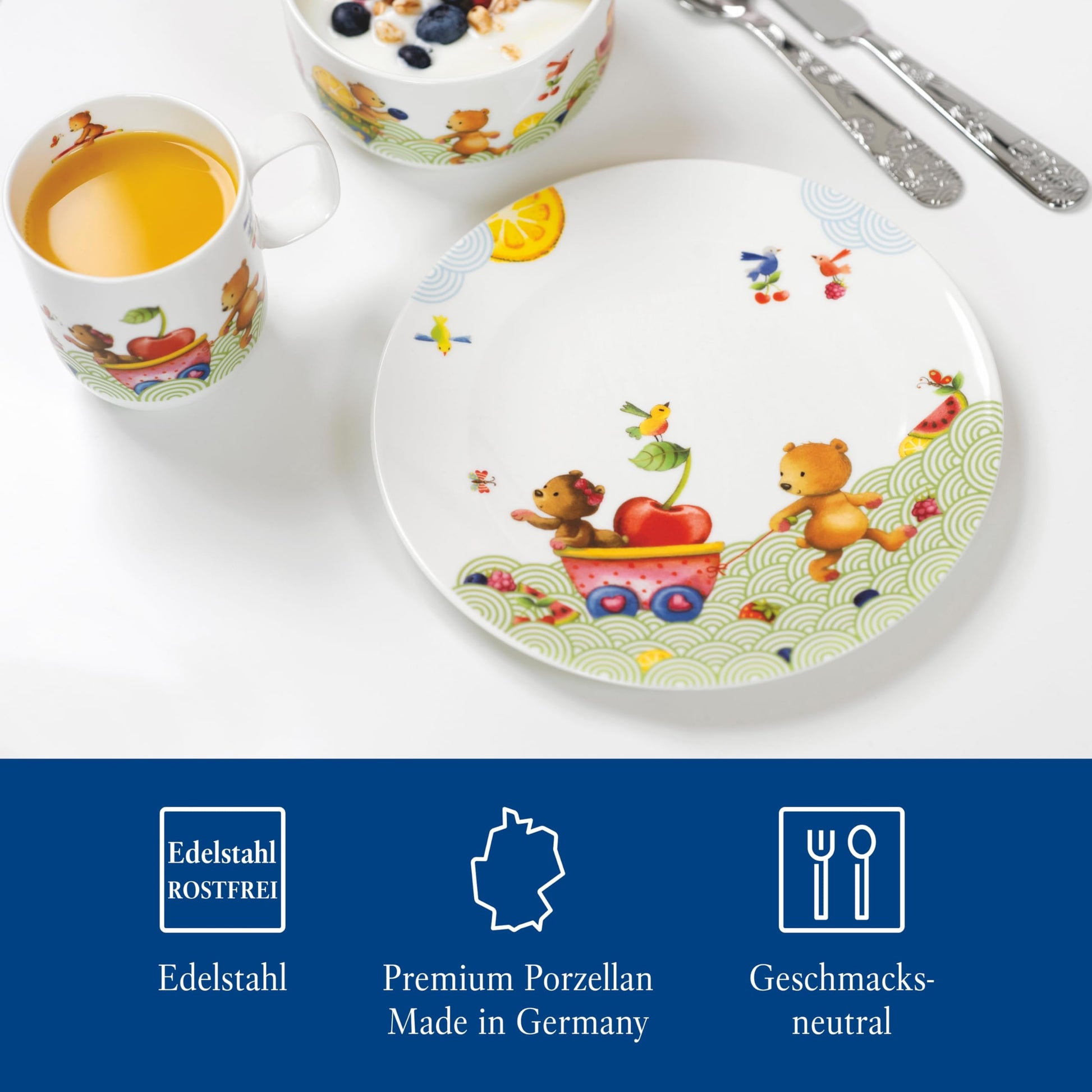 Villeroy & Boch - Hungry As A Bear Set with children's cutlery and tableware (7 pieces). Dishwasher safe, microwave safe. Includes: children's plate, children's cup, children's cutlery set. Made of premium porcelain/stainless steel.