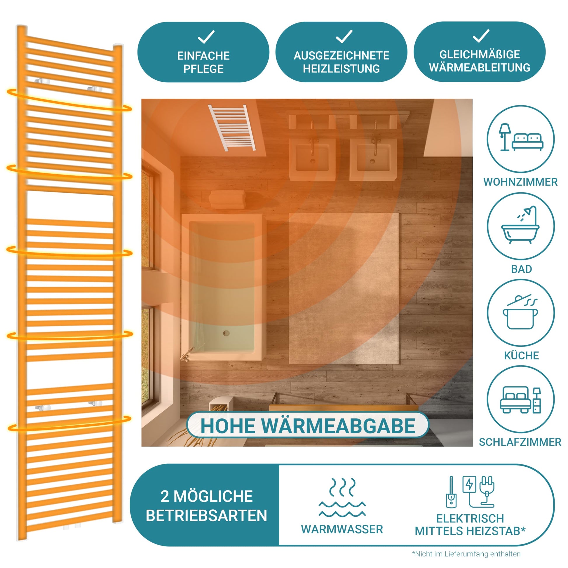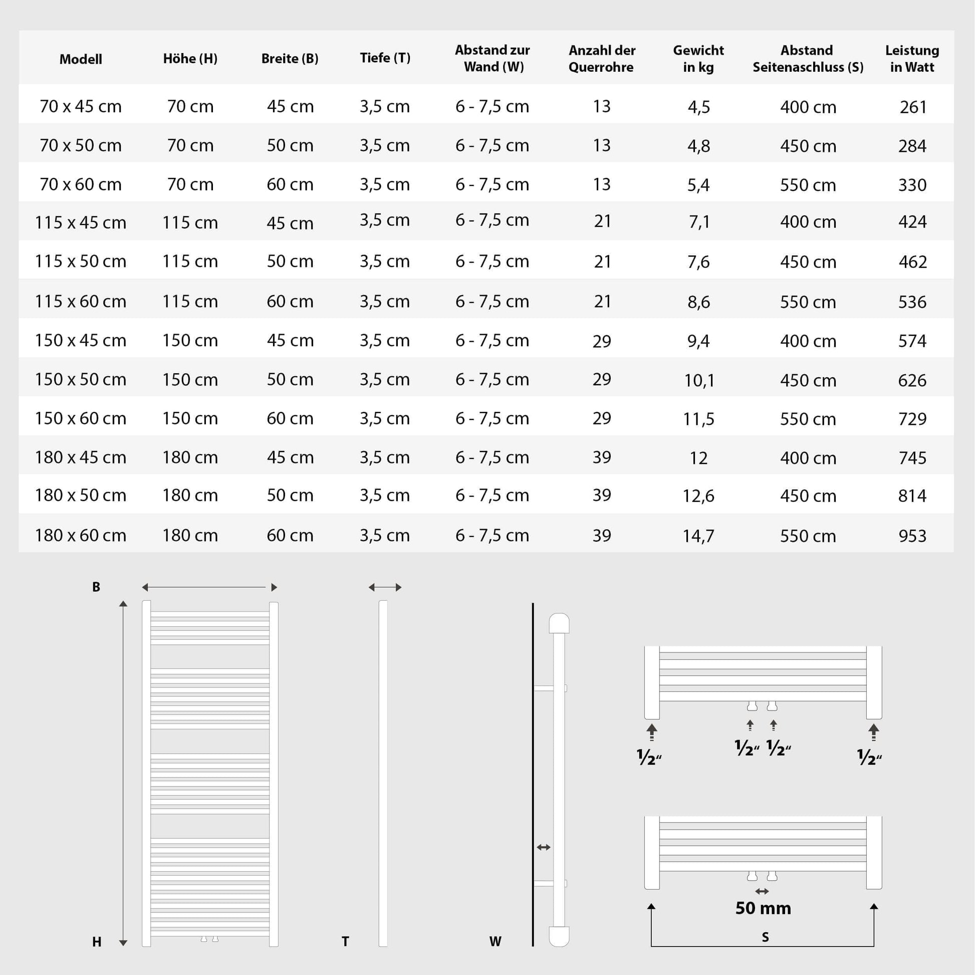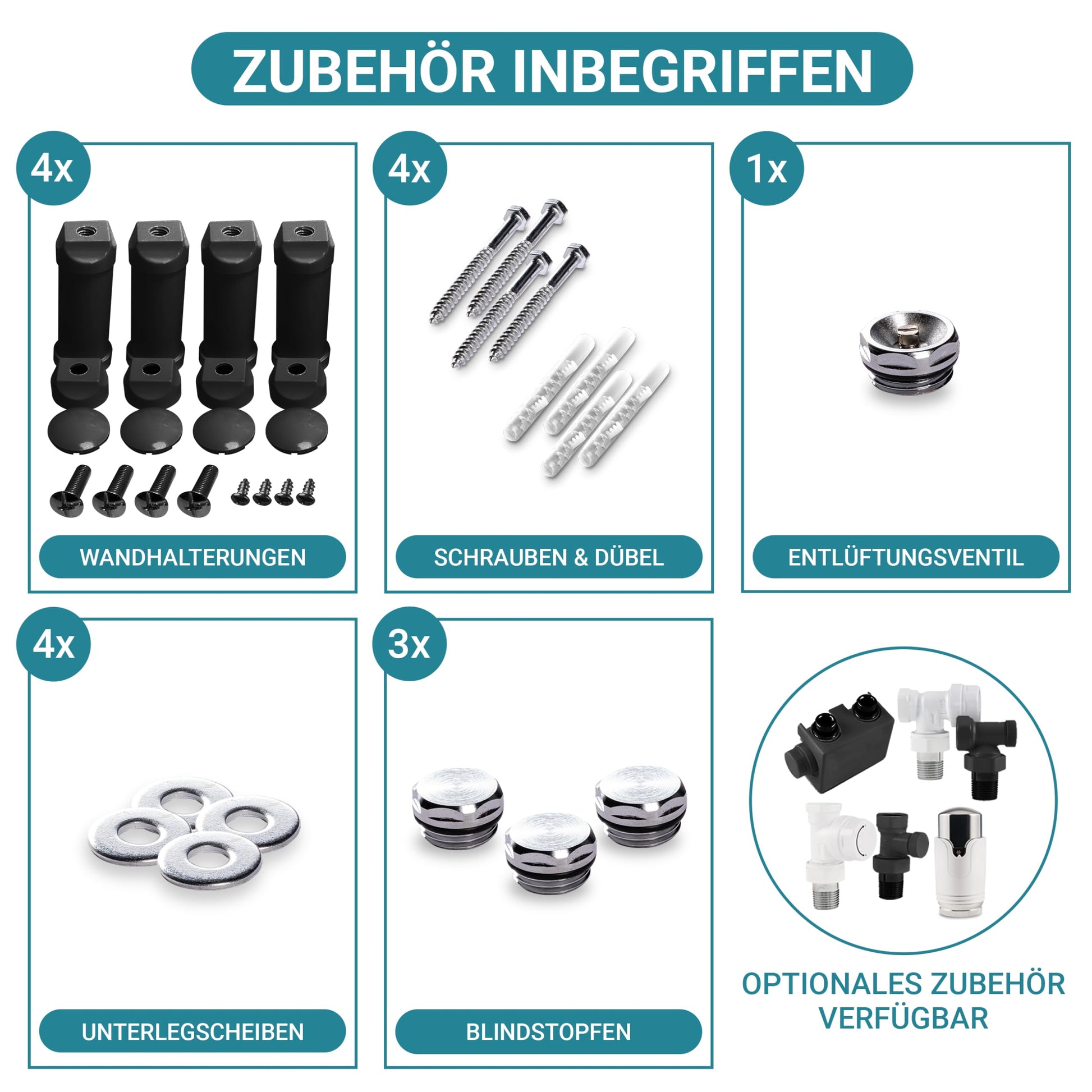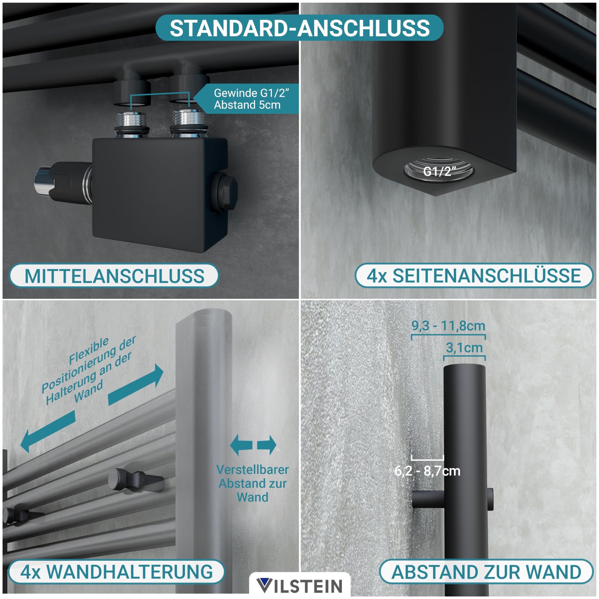["Optimal warmth in the bathroom: The towel radiator serves as a heater, towel warmer, and towel dryer – a must-have wall heater for every bathroom. With 284 watts of power suitable for rooms up to approximately 30-65 sq ft.","Elegance and quality: Premium radiator in matte black or glossy white, vertically mountable bathroom heater, equipped with horizontally aligned, round heating pipes, ideal for the towel.","Easy installation: Towel radiator with center connection and side connection for individual installation options. Flexibly positionable and adjustable wall brackets.","Scope of delivery: Includes radiator, blanking plug, air vent, mounting kit with plugs and screws. Optional multiblock or thermostat from VILSTEIN available for a uniform design.","Reliability and safety: Operating pressure up to 4 bar, test pressure up to 9 bar, operating temperature up to 95 °C. Complies with EN442 and certification according to ISO9001 for highest quality."]