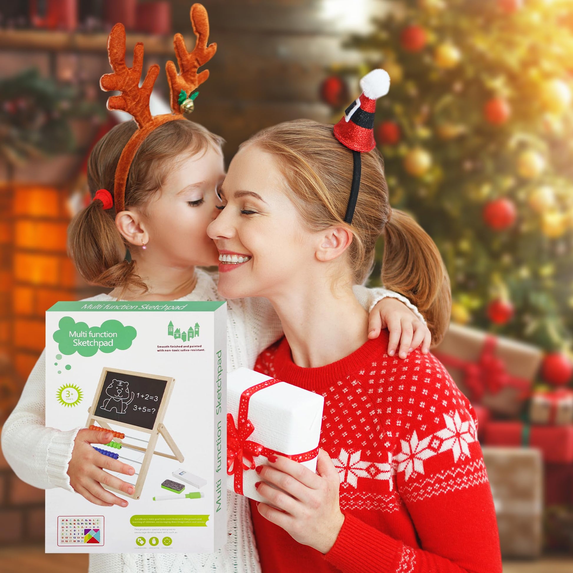 "What you get: A wooden frame abacus with a double-sided board containing 5 x 10 colored balls for solving math problems; Magnetic board with numbers 0-20, 7 symbols, 26 uppercase and lowercase letters, 1 set of Tangram; 1 piece of felt-tip pens, a box of chalk, and a chalk eraser; Children can learn addition, subtraction, multiplication, and division, but also number size comparisons in the range of 0 to 100 can be easily and visually learned or reinforced",