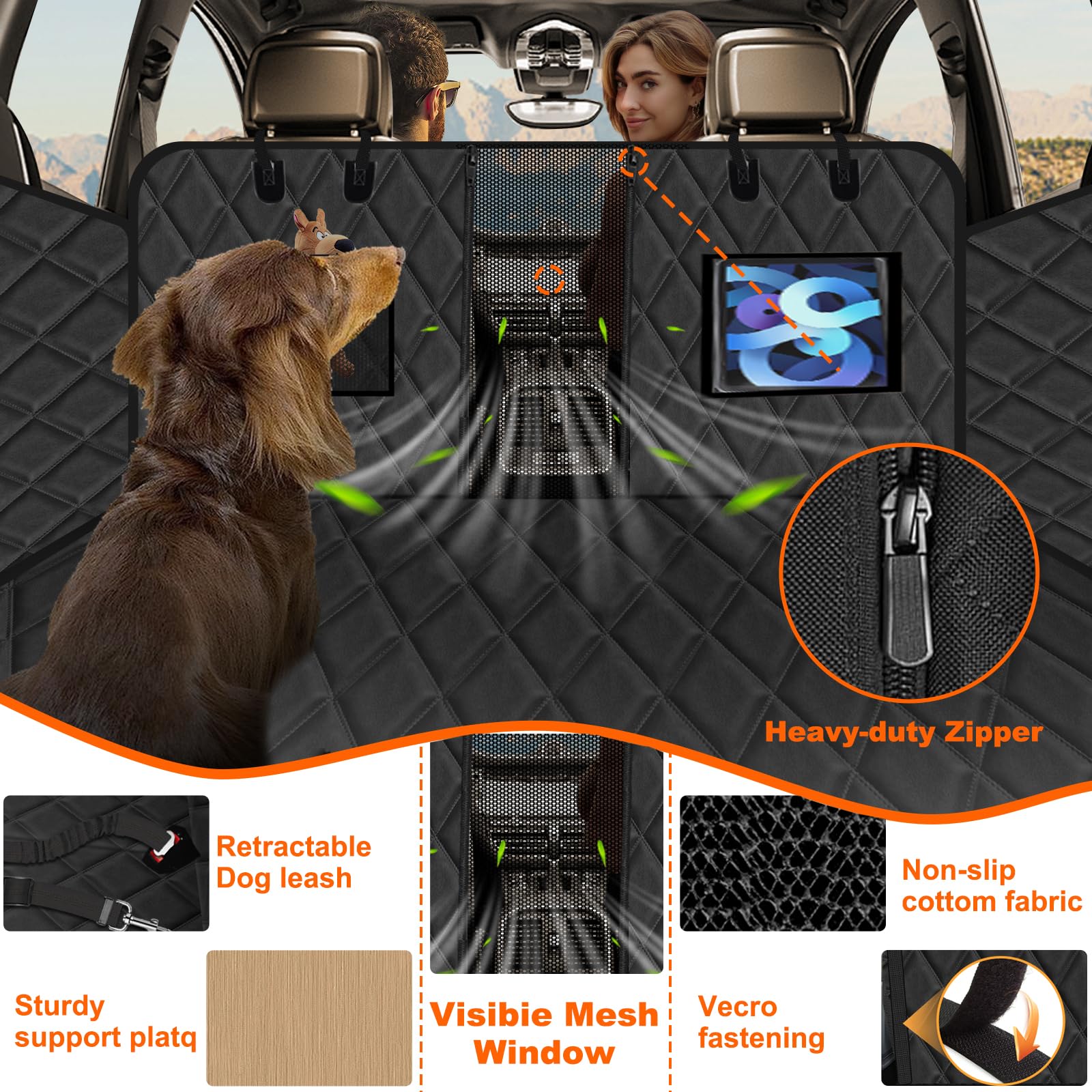 ["[Premium Protection]- Made from high-quality materials, this dog car seat cover for the back seat provides excellent protection against spills and scratches, keeping your car seats clean and undamaged","[Easy Care Fabrics]- The dog car seat cover for the back seat is easy to clean, simply wipe with a damp cloth, vacuum, or machine wash to remove pet hair and dirt, keeping your car interior fresh and hygienic","[Easy Installation and Removal]- Simply unfold the car seat protector on the back seat, attach the seat belts to the headrests and armrests of the car seat, and secure all connections with sturdy Velcro fastenings instead of delicate zippers","[Comfort and Stability]- Our dog car seat cover is extra thickly padded and has a non-slip bottom to ensure your pets travel safely. Mesh windows allow dogs to enjoy the air conditioning and promote interaction between pet and owner","[Safety and Versatility]- The sturdy base supports pets up to 300 pounds and fits in different types of vehicles. The included dog seat belt provides additional safety while driving"]