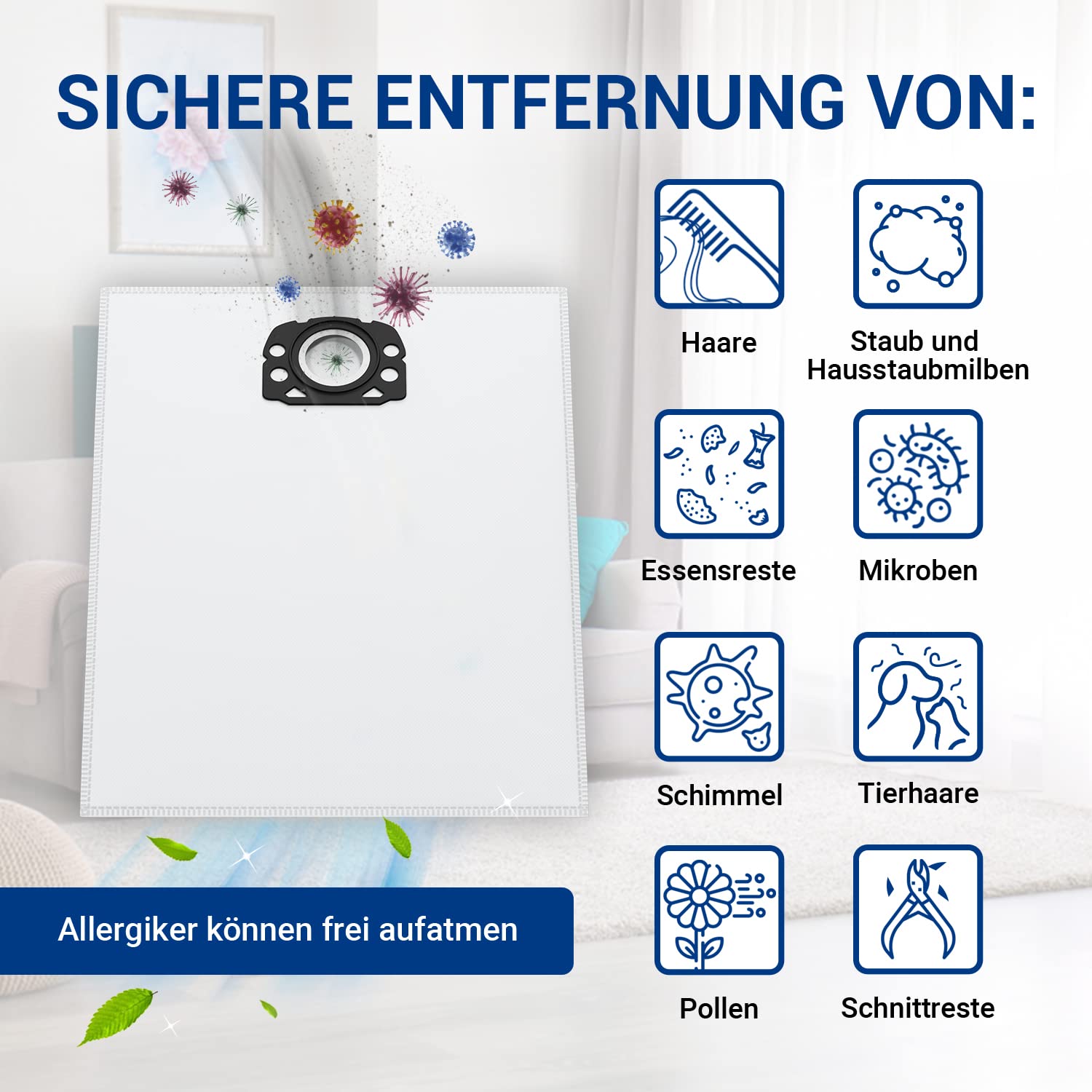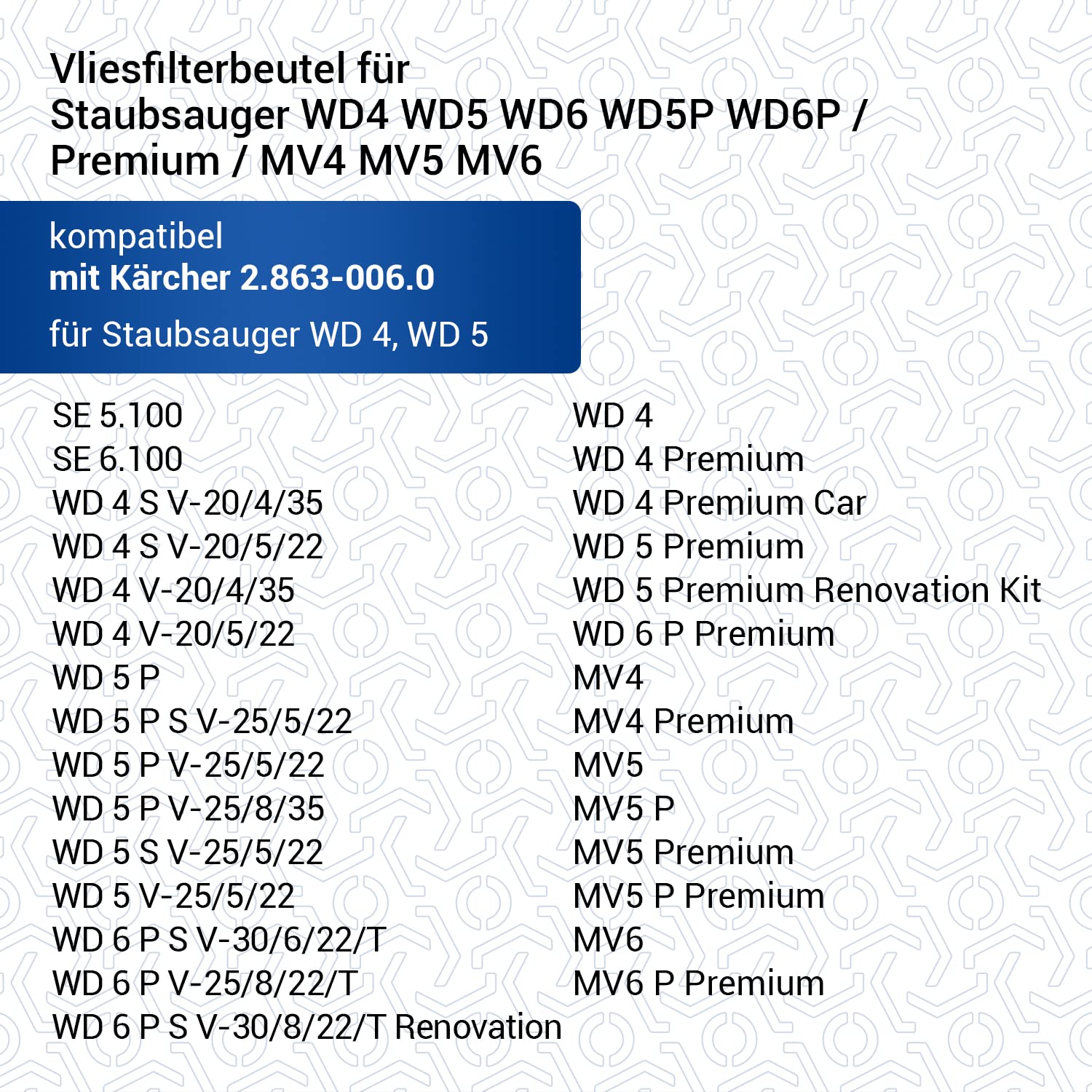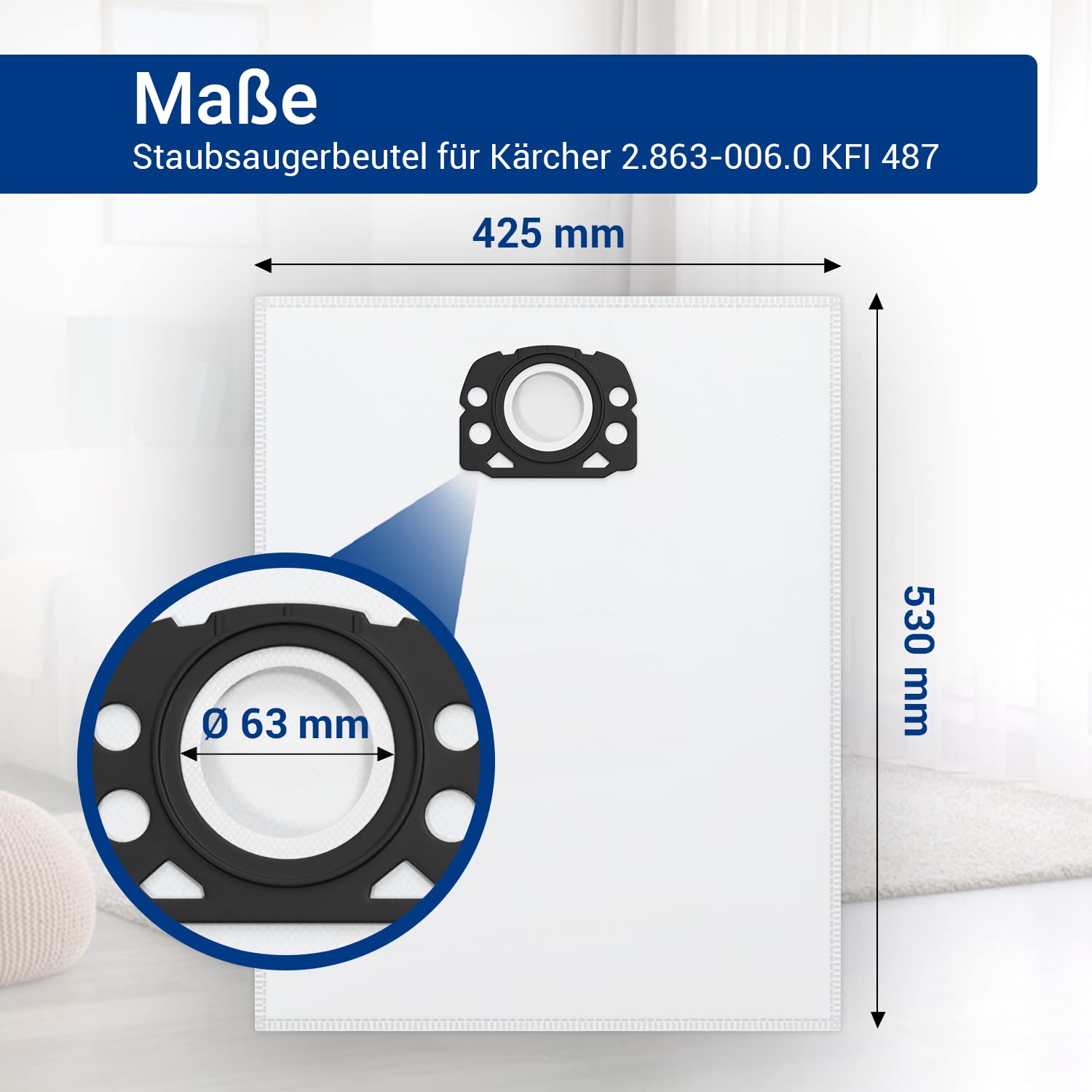 ["DUST BAGS: These replacement products for vacuum cleaner bags Kärcher WD5 or Kärcher WD6 bags offer high dust retention and allow for long suction intervals","COMPATIBLE WITH: VIOKS filter bags serve as replacements for Kärcher KFI 487 or Kärcher vacuum cleaner bags 2,863-006.0 / 28630060","DETAILS: The replacements for KFI 487 Kärcher bags from VIOKS have the following features: Length 525 mm, Width 415 mm, Height 6 mm, Material: Fleece. Scope of delivery: 8x Kärcher WD4 bags or Kärcher WD 5 P bags","FITS FOR: Our replacement for KFI 487 bag Kärcher fits the vacuum cleaner models Kärcher WD4, Kärcher WD 5, Kärcher WD6, KWD4, KWD5, KWD6, KNT4, MV4, MV5, MV6, WD4.000, WD4.200 to WD5.800, WD5.999, SW5.100, SE6.100, Wet4-, WD5-, WD5 / P","WITH FOLDING CLOSURE: The practical folding closure on the Kärcher WD6P bag ensures that dust and dirt are securely enclosed in the bag. This keeps the interior of the Kärcher WD5 vacuum cleaner protected from dirt"]