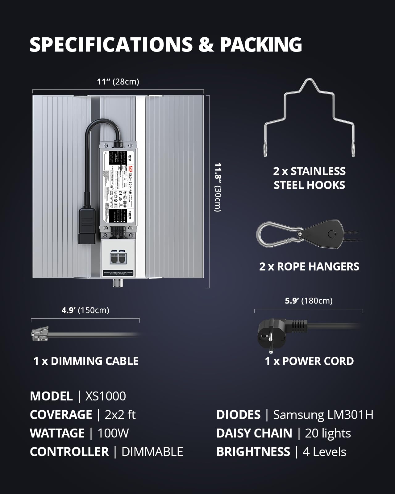 ["TOP PERFORMANCE and DAISY CHAIN FUNCTION: VIPARSPECTRA's new improved XS1000 growth light with scientifically designed Samsung LM301H diode layout to achieve the best PAR distribution and highest light penetration for maximized plant yield. The daisy chain function allows connection of up to 20 XS1000 growth lights: commercial cultivation, horizontal and vertical cultivation, greenhouse, hydroponics, etc.", "OPTIMAL FULL SPECTRUM and FLEXIBLE DIMMER FUNCTION: The lamp is equipped with 3000K, 5000K, 660nm, and 730nm infrared. This ensures that your plants are supplied with all the light they need for optimal development. The IR infrared light can accelerate flowering and increase yield. A separate dimming controller has been added to adjust light intensity according to growth phase.", "QUIET OPERATION and SOLID CONSTRUCTION: No fans, no noise. A large aluminum heat sink provides ideal cooling. High PAR output accelerates plant growth processes and increases yield, ultimately saving on electricity bills.", "HIGH AREA COVERAGE and LESS ENERGY CONSUMPTION: Equivalent to traditional 250W HPS/MH lamps with only 100W energy consumption, resulting in a 50% higher yield and lower energy costs. Perfect for area coverage of 80x80cm at a height of 40cm during the growth phase and 60x60 cm at a height of 25cm during the flowering phase. Remember to always adjust the brightness and height of the lamp according to the plant's needs.", "TRULY THE BEST SUPPORT: The VIPARSPECTRA grow light offers excellent customer service. We provide you with exactly what you need: a truly professional LED grow light at an affordable price and an outstanding experience. If you have any questions, feel free to email us or contact us. We will respond within 24 hours and solve your problem as quickly as possible."]
