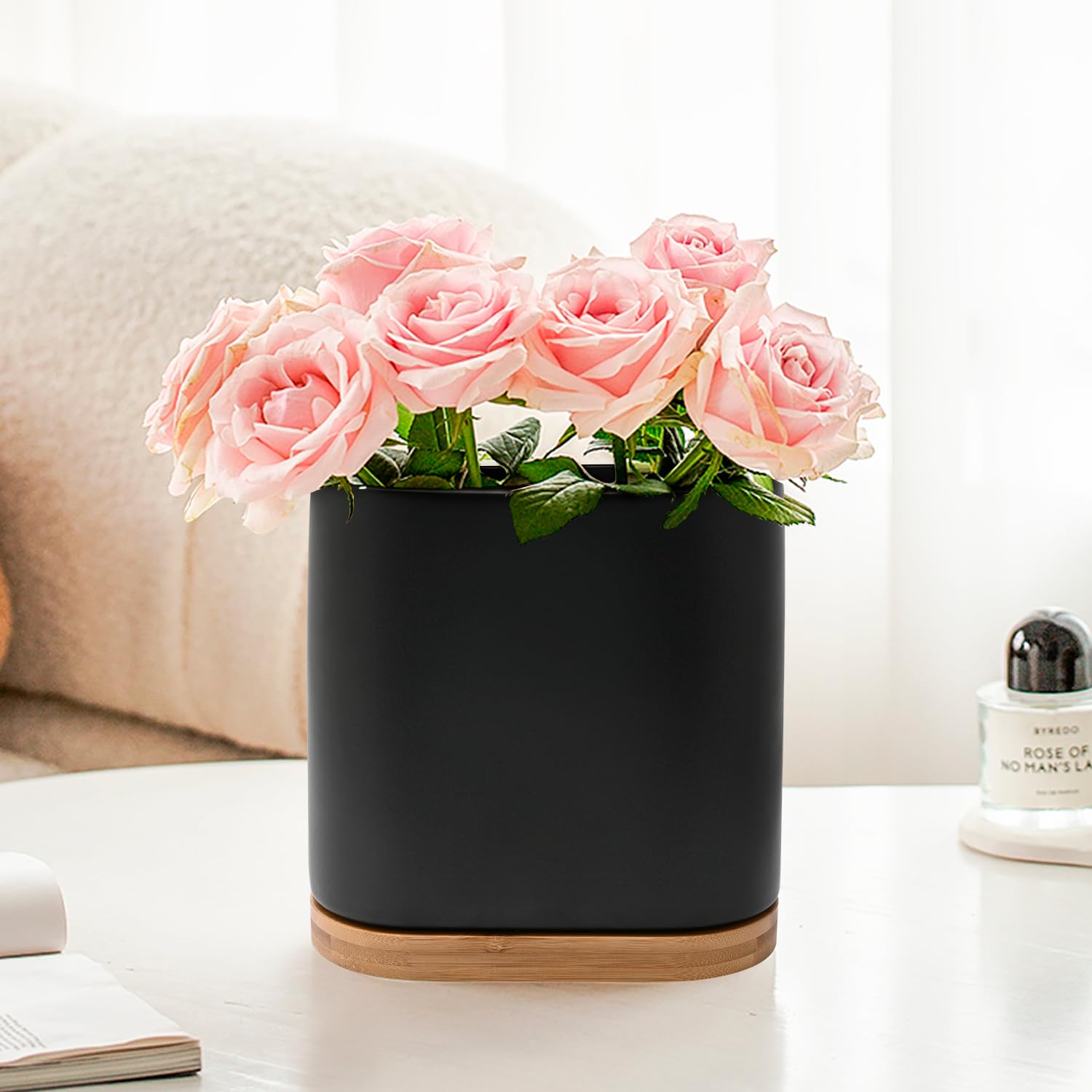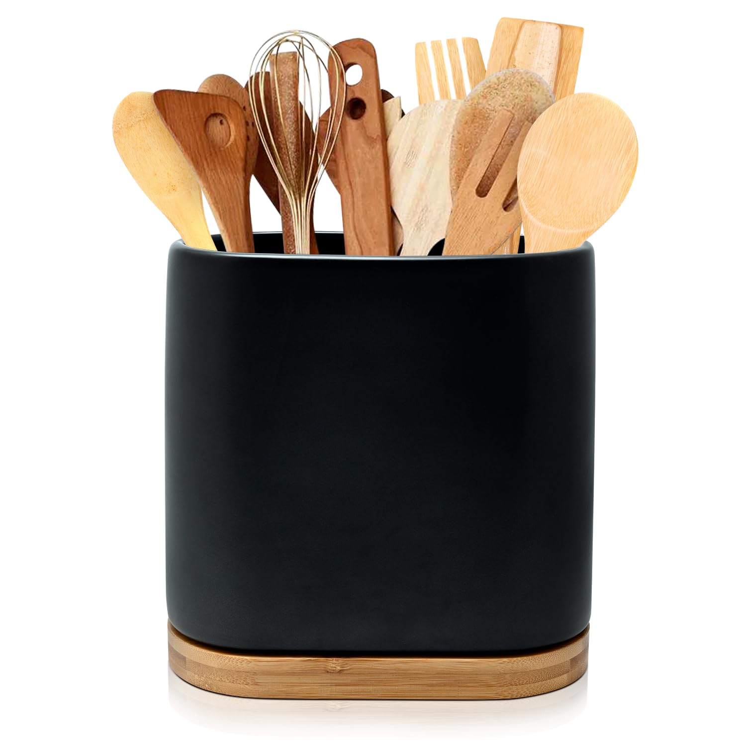 VIREESR Large ceramic countertop utensil holder, kitchen utensil holder with bamboo wood base, cooking utensil holder, easy to clean, tool pot, kitchen tool holder for spatulas and.