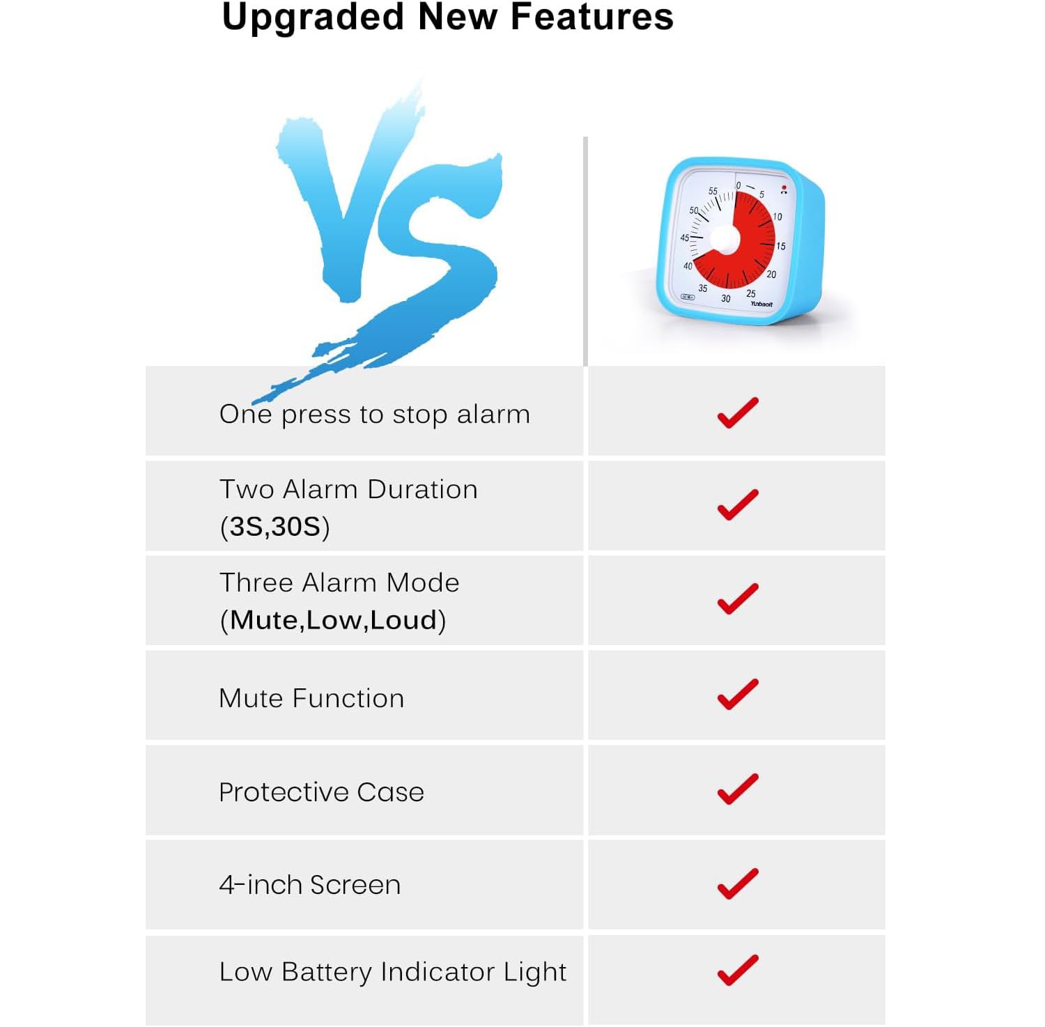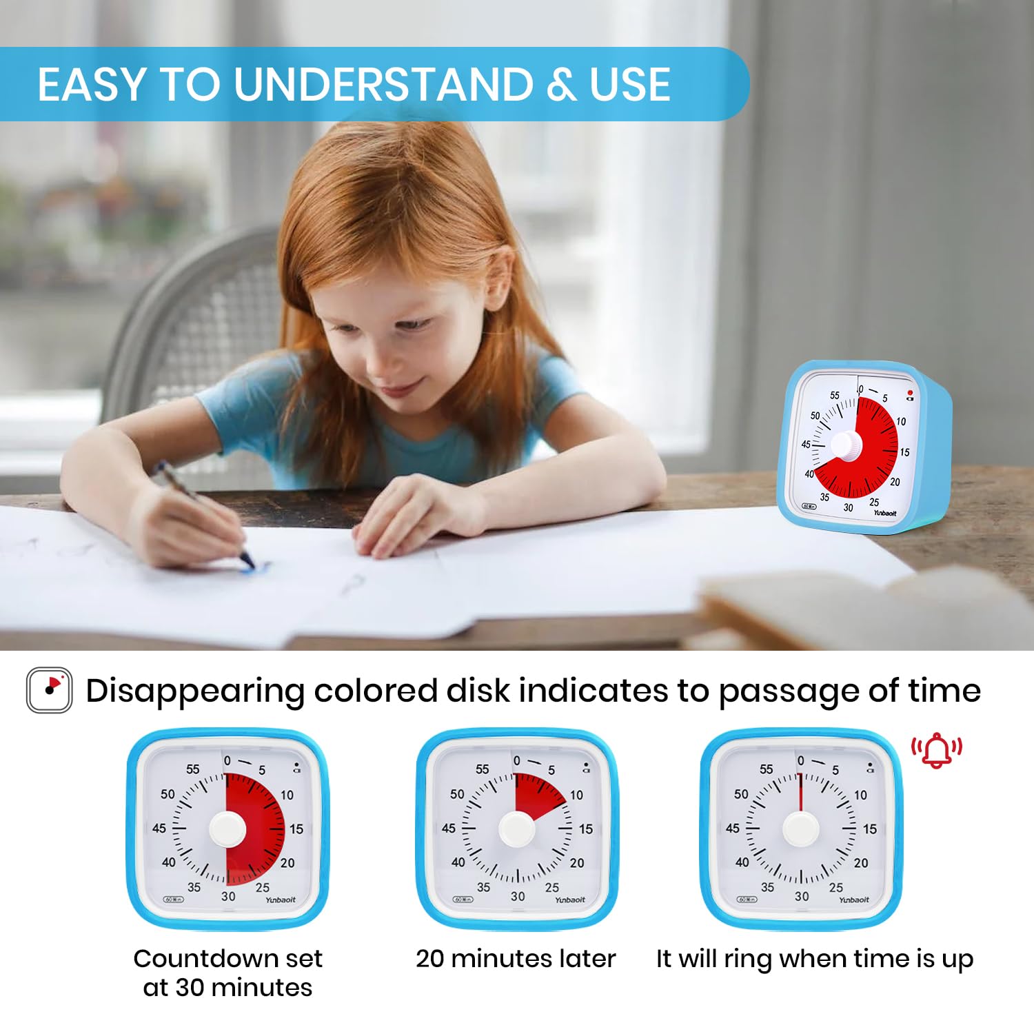 ["Simple concept: Over time, the colorful disc of the upgraded Yunbaoit visual timer disappears counterclockwise; It will display the remaining time vividly and help people develop a good sense of time and improve time management","No ticking and mute option: No ticking when the visual countdown is on, ideal for sound-sensitive environments; 3 alarm volumes optional: mute, low, loud; durable alarm: 3 seconds/30 seconds; You can stop the alarm by pressing the top pause button","Suitable for many occasions: Our 60-minute timer is a versatile timer; It can be used as a cooking timer in the kitchen, learning timer for kids, task timer for teachers in the classroom, or meeting timer","Easy to use: After turning the middle knob clockwise, the colored disc can be set to the desired time, then the timer starts counting down; The removable silicone cover is made of healthy, non-toxic, and odorless materials, can effectively protect the timer","Low battery reminder and after-sales: When the battery power is low, the indicator light flashes to remind you; 2 x AAA batteries required, but not included; If there are any issues with our products, please contact us without hesitation, we will provide you with satisfactory solutions"]