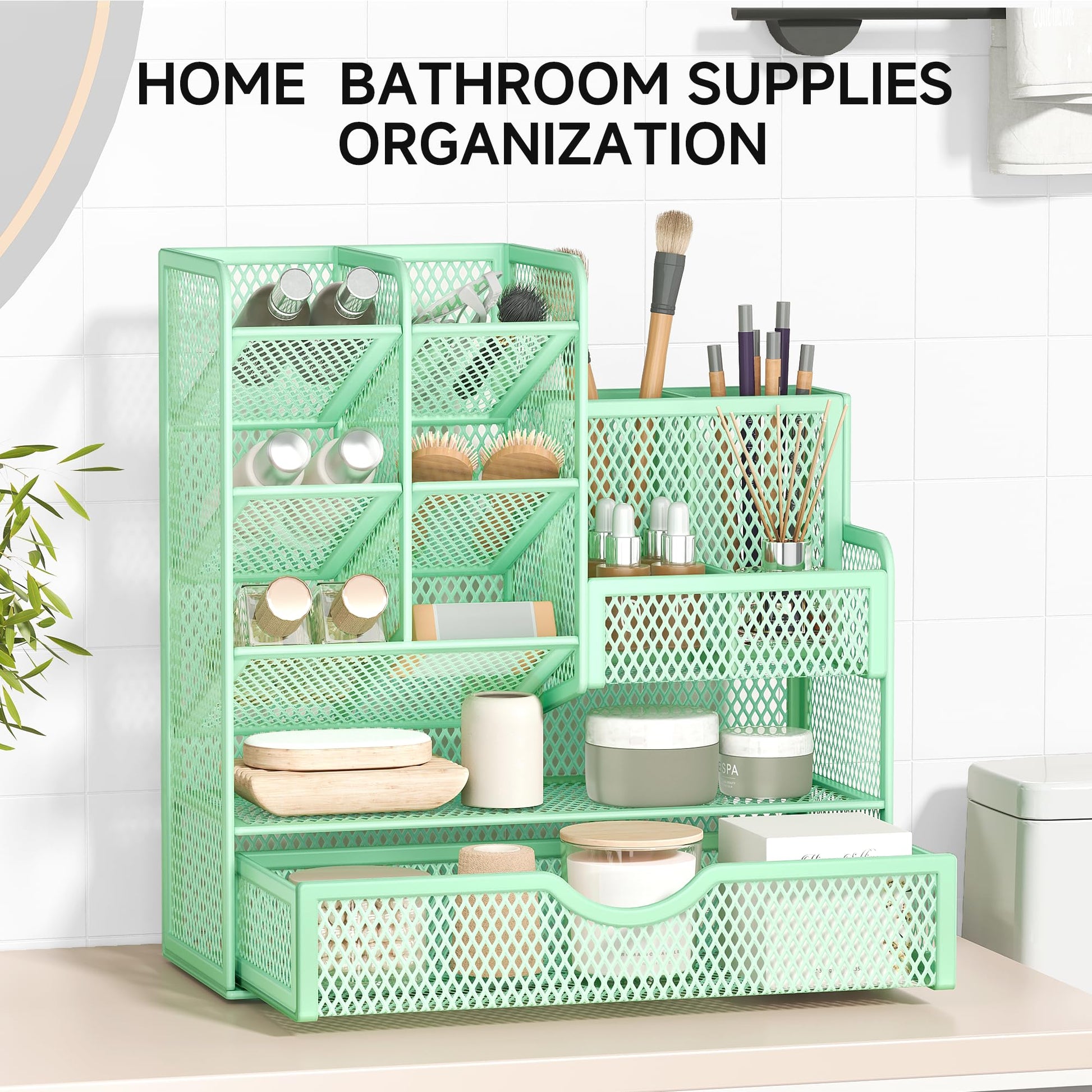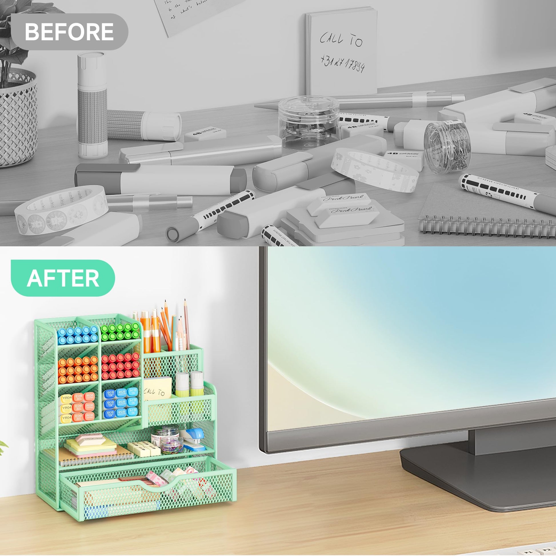 VITVITI Desk Organizer, 10 Compartments Pen Holder with Drawer, Metal Mesh Pen Stand, Desk Pen Holder for School Home Office (Green)