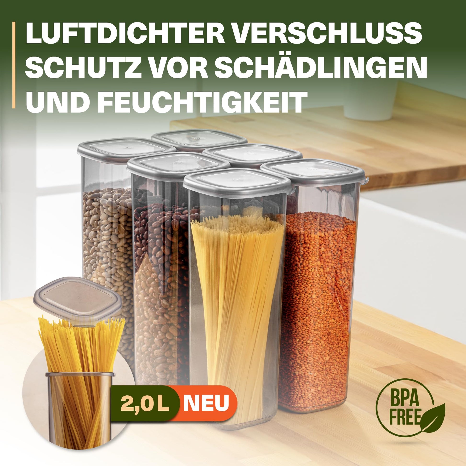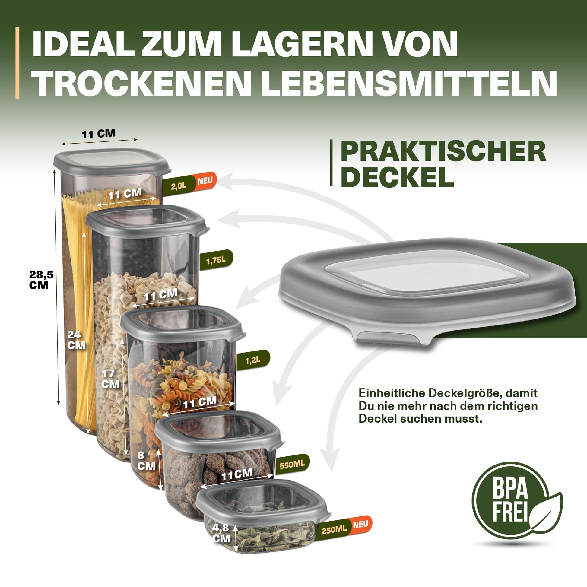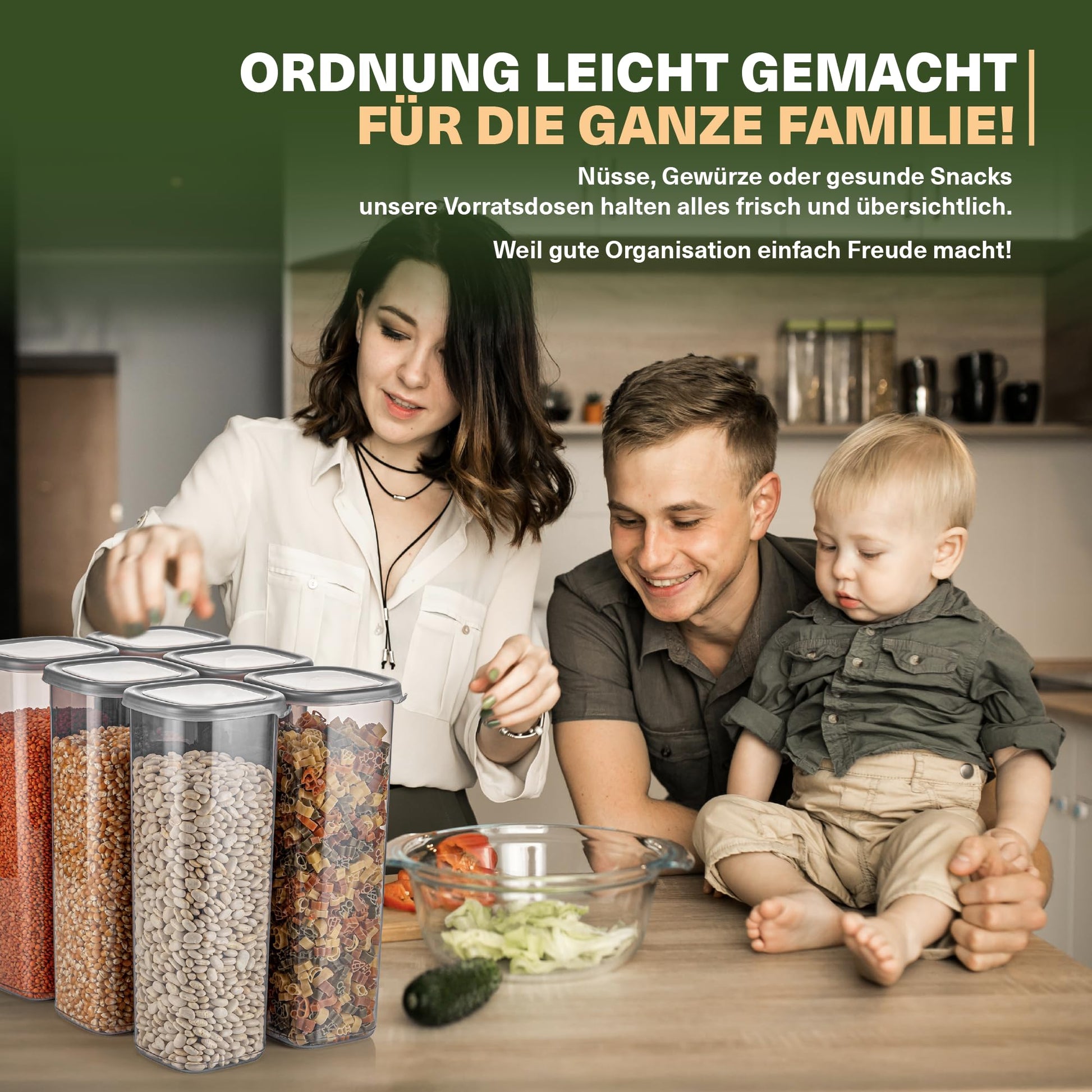 ["KITCHEN ORGANIZATION - With our clever storage container set, you'll create a perfectly organized kitchen. Ideal for stylish pasta storage and more.","LONG-LASTING FRESHNESS with our practical kitchen organizer set. Many foods lose their aroma quickly after opening, but our airtight containers with lids prevent this.","100% DISHWASHER SAFE - Want everything to be easier? Us too! Our food storage containers are completely fridge and dishwasher safe - lid-free containers are also microwave safe!","PREMIUM MATERIALS - Durable storage containers with BPA-free, transparent anthracite lids for clear visibility. Perfect for kitchen organization and long-lasting use!","SPACE-SAVING STACKABLE - The perfect container with lid for all your food. Thanks to the design, they can be easily stacked on top of each other."]